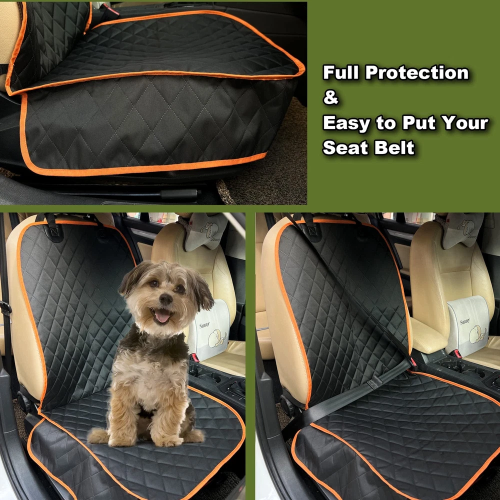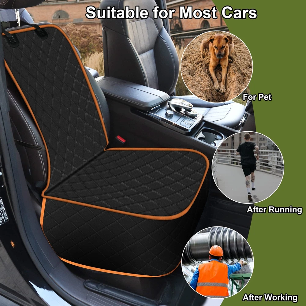 【Universal Fit】The pet front seat cover(2 pack ) is 20" Length X 18.5" Width, is a great choice to protect your front seat, available for most cars, trucks, automotive and SUVs. The multifunctional dog car seat cover also suitable for kids or after sporting for you. Please ensure your seat's dimension before order. 【Nonslip Protection】The dog seat cover includes rubberized anti-slip backing, seat anchor and quick-release buckle strap that around headrest and seat back. The adjustable buckle straps and seat anchors can prevent it from sliding around. 【Premium Material】 Anti-Scratch 600D oxford fabric with waterproof PVC coating, water resistant & scratch-proof. Durable materials can better protect your car seat from dirt, mud, stain, and so on. 【Easy to Install & Clean】 With 2 quick release buckles and 1 seat anchor can help you install this car front seat cover in seconds. Easy to clean with a damp cloth, vacuum, or directly make a water shower. 【Warm Reminder】 This pet seat cover is not a safety device, please fasten the seat belt for your dog and use it with a dog seat belt. Your dog will be comfortable and happy to go outside with you.