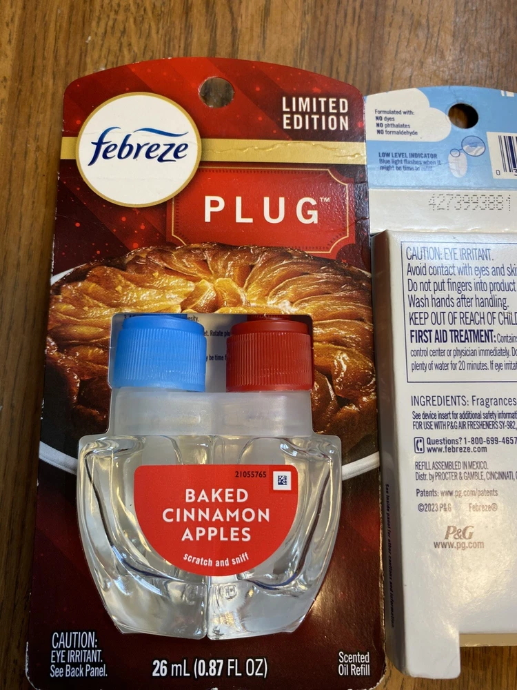 This product is a set of two packs of Febreze Plug refills in a Baked Cinnamon Apples scent, totaling four refills. Each refill lasts for 180 days and is designed for use in any room of a home or office. The refills are in a solid oil form and come in a purple glass bottle. The product features a deodorizing and odor-eliminating formula, making it eco-friendly. With a modern style, these refills are part of the Febreze product line and are suitable for providing a fresh and inviting scent to your living space.