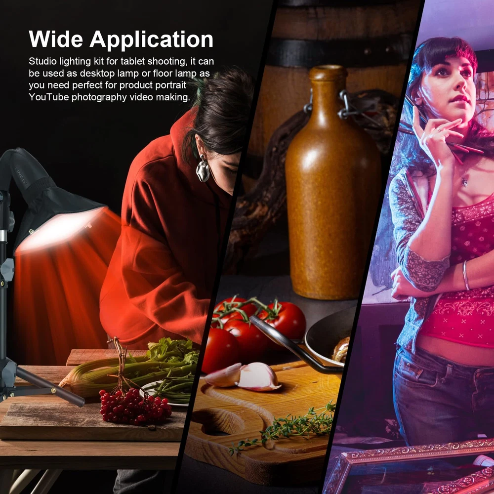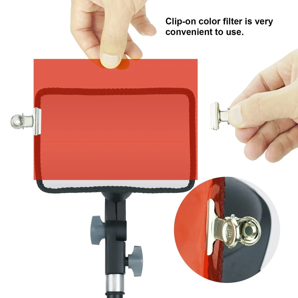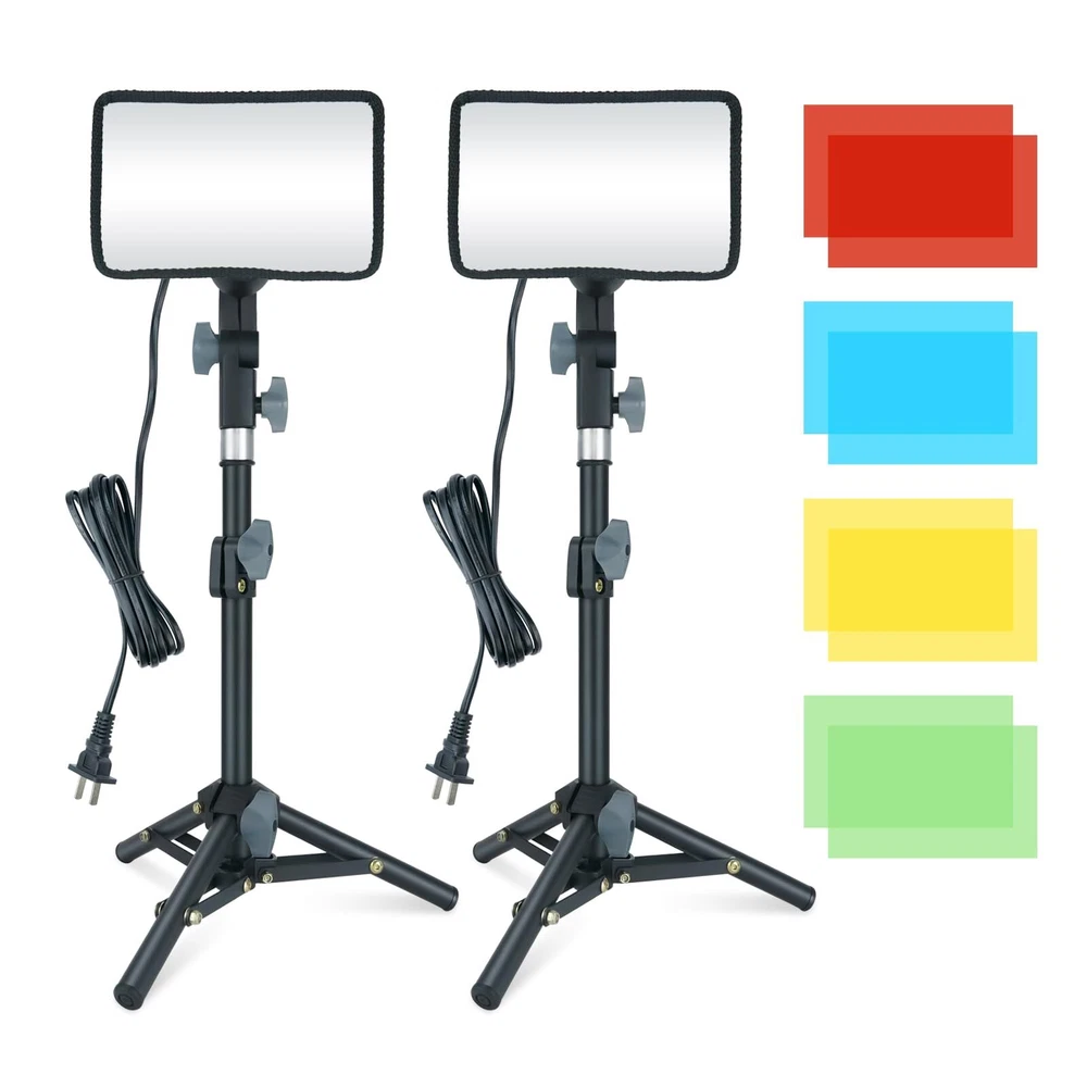 Mini Photography Studio taoble top lights kit 2 x PRETTY SOOMTHY SHAPE LAMP HOLDER photographic light head has better shape for holding when photographer adjusting lighting angle; made of engineering plastic for its durability; general angles adjustable for satisfying photographer needs 2 x STUDIO MINI SOFTBOX DIFFUSER 4x6 INCH better for softening photo lighting to make pictures or more beautiful 2 x PHOTOGRAPHY LIGHT STAND TRIPOD MINI about 18 inch height and with 6 inch footprint especially suitable for table top 2 x STANDARD PHOTOGRAPHY LIGHT BULB 110V-50Hz daylight A9 LED studio lighting bulb; service life about 10000 hours; lighting brightness to 800 lumens; attached to E26/E27 socket of lamp holder; high CRI keeping original color of object in you photo 2 x PHOTOGRAPHIC COLOR FILTERS 4 COLORS different color effects are created by red , yellow , blue , green and no ; more complex color use can create more colorful photography environments Portable and lightweight; easy to carry and little space for storage Good Photography Lighting for food, jewelry, tools, and products