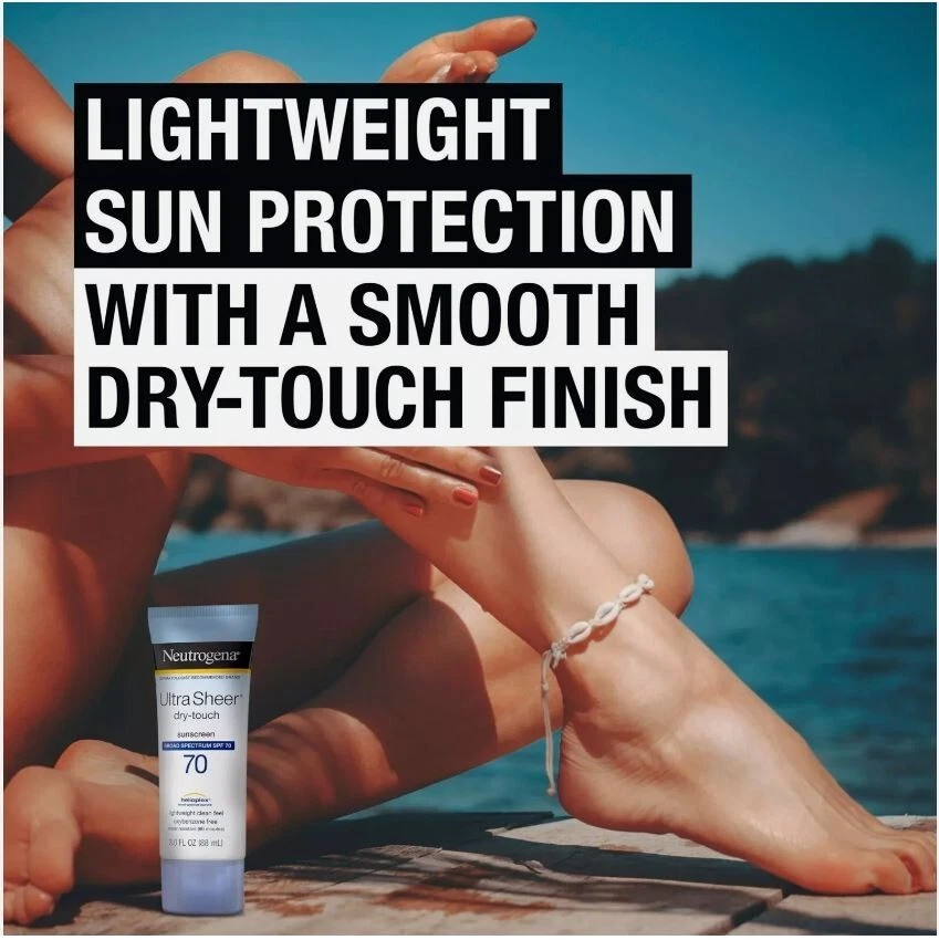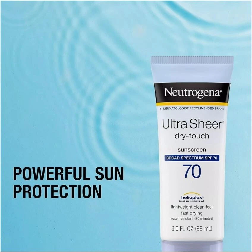 Introducing Neutrogena Ultra Sheer Dry-Touch SPF 70 Sunscreen Lotion, your ultimate companion for everyday sun protection. This advanced sunscreen boasts a powerful broad-spectrum SPF 70 to shield your skin from both UVA and UVB rays, providing superior sun defense against the harsh effects of the sun. Features: 1. **High SPF Protection:** Offering SPF 70, this sunscreen provides high-level protection against the sun's damaging rays, effectively preventing sunburn and reducing the risk of skin cancer and premature aging. 2. **Dry-Touch Technology:** Experience a non-greasy, lightweight formula that absorbs quickly into the skin, leaving a matte finish. The Dry-Touch technology ensures your skin feels smooth and dry, allowing for comfortable, all-day wear. 3. **Broad-Spectrum Protection:** Safeguard your skin from both UVA and UVB rays that can cause skin damage and sunburn. The broad-spectrum formula helps prevent signs of aging, such as fine lines, wrinkles, and dark spots, caused by sun exposure. 4. **Water-Resistant:** Enjoy long-lasting protection even during outdoor activities. This sunscreen is water-resistant for up to 80 minutes, making it ideal for swimming, sports, or any adventures under the sun. 5. **Oil-Free and PABA-Free:** Formulated without oils and PABA, this sunscreen is suitable for all skin types, including sensitive skin. It's non-comedogenic, ensuring it won't clog pores or cause breakouts. 6. **Dermatologist-Tested:** Trusted by dermatologists, this sunscreen is tested for safety and efficacy, ensuring it meets high-quality standards for sun protection. Description: Neutrogena Ultra Sheer Dry-Touch SPF 70 Sunscreen Lotion is your go-to solution for reliable sun protection. Whether you're lounging by the pool, hitting the beach, or simply heading out for your daily routine, this sunscreen offers superior defense against the sun's harmful rays. Its non-greasy, Dry-Touch formula feels light on the skin and dries quickly, leaving a smooth, matte finish that's perfect for everyday use. Protect your skin and keep it looking healthy with Neutrogena's dermatologist-tested sunscreen. With its high SPF, broad-spectrum protection, and water-resistant formula, it's the ideal choice to maintain your skin's health and radiance while enjoying the outdoors. Say goodbye to the worries of sun damage and embrace a confident, sun-protected lifestyle with Neutrogena Ultra Sheer Dry-Touch SPF 70 Sunscreen Lotion.