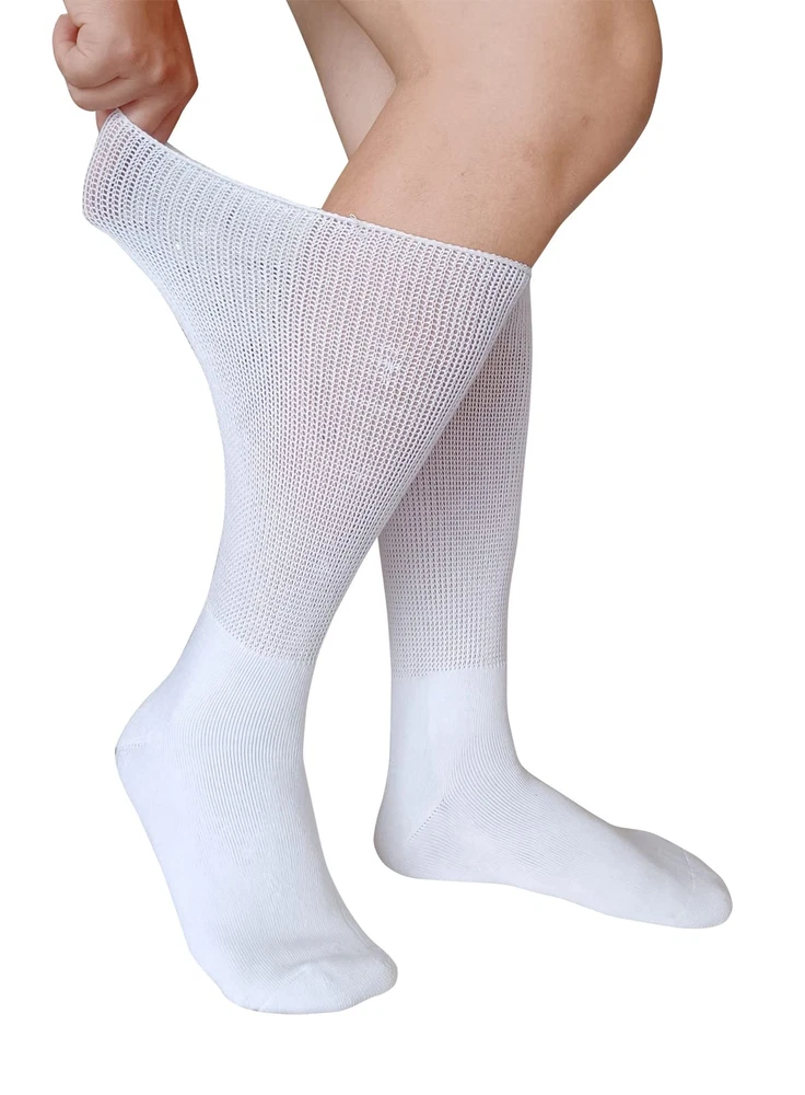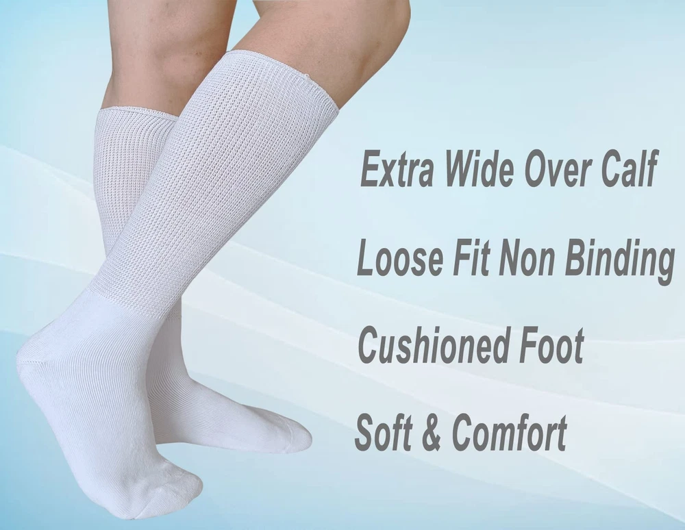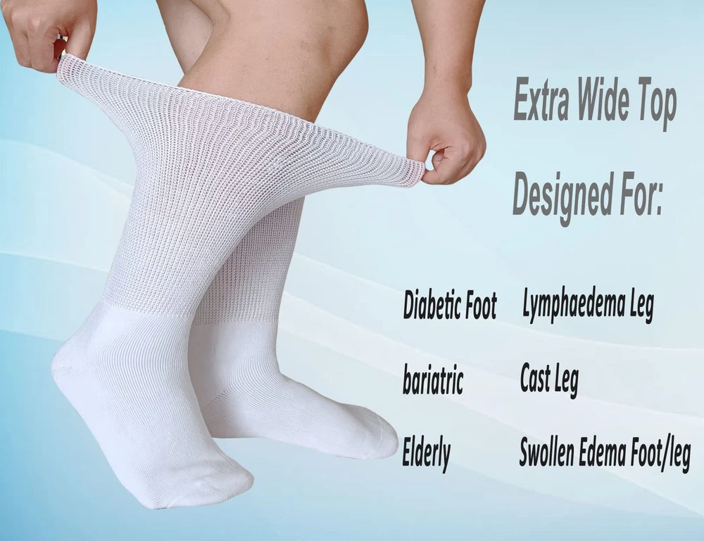 Description 2 Pairs Extra Wide Bariatric Socks Non Binding Extra Wide Diabetic Socks For Women Men- Viasox Lymphedema Cast Socks, Over Calves Medical Super Width Socks for Swollen Edema Foot Ankle Leg ★Diabetic Socks Non Binding: Super wide calf can stretch up to 30" wide, Super Stretchy, Super Comfort non binding socks, it is special idea socks for neuropathy bariatric diabetic swollen feet or leg. ★One Size For Men Women: The unisex extra wide diabetic socks fit for socks size Mens 10-13,Womens 9-11 or plus size. It is loose fit and stay up, leave no marks on leg. ★Thick Warm And Soft Diabetic Socks Over Calves: The people who are Suffering from circulation problem always feel cold at feet. These non binding edema socks will non constrict to circulation and the cushioned foot will keep feet warm. The thickly soft cushioned foot make your feet comfortable and happy. ★Extra Wide Socks For Diabetic Swollen Foot Leg Cast Cover: The material is soft and moisture wicking, loose fit to wide calf or cast leg, friendly to elderly or people wear casts or bandages, it is easy to put on and take off, but stay up. It is premium diabetic socks for lymphedema, bariatric, swollen edema wider or thick foot or cast leg, surgical leg, sensitive foot, medical hospital socks. ★Package & Washing instruction: 2 pairs of white extra wide over calf socks, machine wash and dry in lower temperature, do not bleach ★Diabetic Socks Non Binding: Super wide calf can stretch up to 30" wide, Super Stretchy, Super Comfort non binding socks, it is special idea socks for neuropathy bariatric diabetic swollen feet or leg. ★One Size For Men Women: The unisex extra wide diabetic socks fit for socks size Mens 10-13,Womens 9-11 or plus size. It is loose fit and stay up, leave no marks on leg. ★Thick Warm And Soft Diabetic Socks Over Calves: The people who are Suffering from circulation problem always feel cold at feet. These non binding edema socks will non constrict to circulation and the cushioned foot will keep feet warm. The thickly soft cushioned foot make your feet comfortable and happy. ★Extra Wide Socks For Diabetic Swollen Foot Leg Cast Cover: The material is soft and moisture wicking, loose fit to wide calf or cast leg, friendly to elderly or people wear casts or bandages, it is easy to put on and take off, but stay up. It is premium diabetic socks for lymphedema, bariatric, swollen edema wider or thick foot or cast leg, surgical leg, sensitive foot, medical hospital socks. ★Package & Washing instruction: 2 pairs of white extra wide over calf socks, machine wash and dry in lower temperature, do not bleach