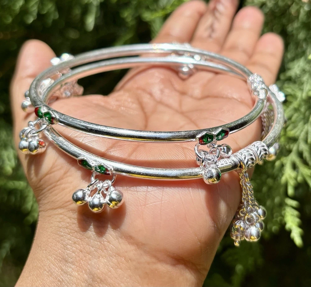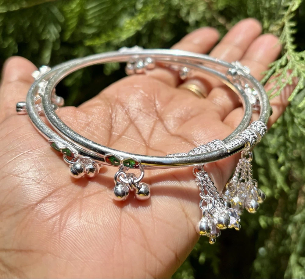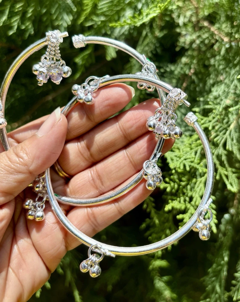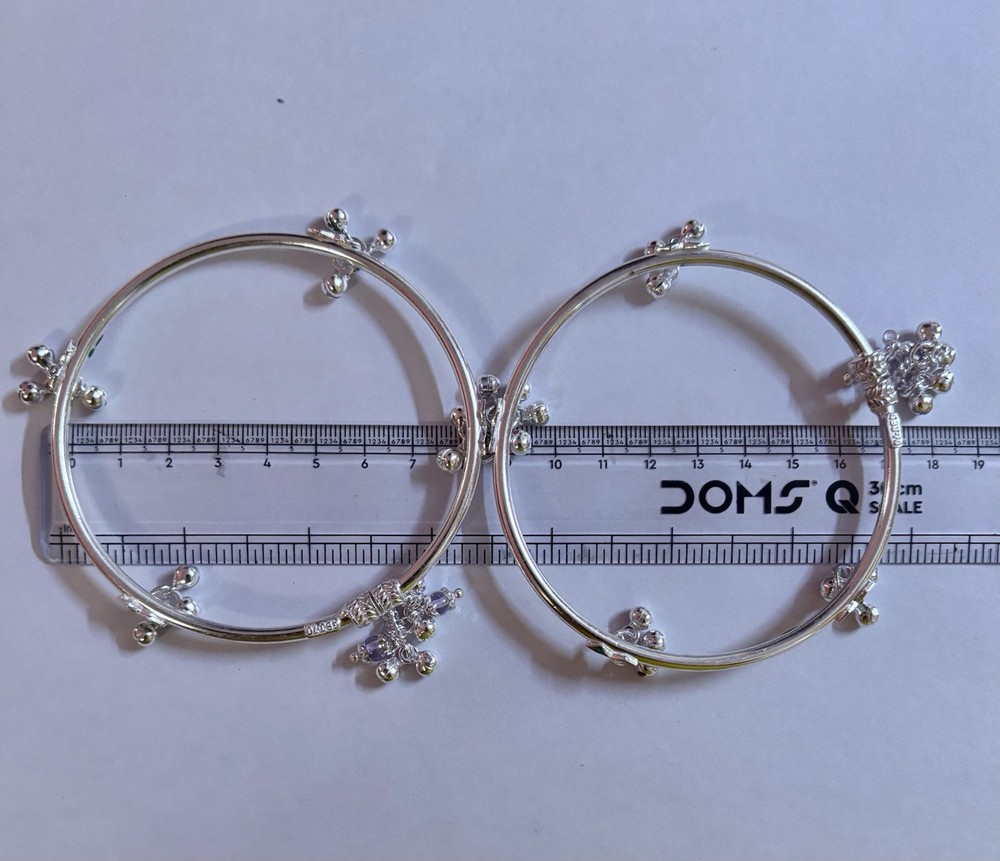 2 piece / 1 pair Evil Eye Anklet Ghungroo for girls, women Pure Silver With Bells ghungroos, makes beautiful sound when one moves. Hollow flexible Very light weight and comfortable Can be used as an armlet as well. Pls check the inside diameter is approx 8 cm each These are bangle bracelets, Please check the size properly before purchase.