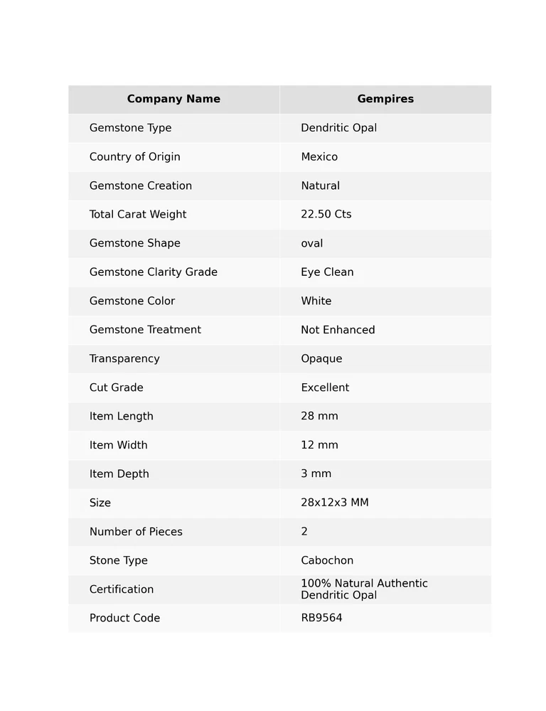 Welcome To Gempires This handmade set of two oval-shaped Dendritic Opal gemstones from Mexico features a white color with excellent cut grade and eye-clean clarity. Measuring 28mm in length and 12mm in width with a 3mm depth, these gemstones are polished and naturally created without enhancements. They come with a certification guaranteeing their authenticity as 100% natural Dendritic Opal. Perfect for those seeking transparent gemstones for jewelry-making or collection, these pieces offer a unique and elegant look. 2 Pcs 22.50 Cts Natural Dendritic Opal Pendant Making oval Cabochon 28x12x3 MM Check My Other Dendritic Opal Listings : Click Here Note: For Custom / Bulk Order, Please contact on Ebay Message Service. QUALITY ASSURANCE:- The photo may not give you the actual size, please refer to the item description for size details. Our product Images are original. We dont use Photoshop for any editing. We always do our best to display an actual image of the gemstone which is to be delivered to our customers. We check all our items and ensure the best quality standards. The item weight may vary 5% (+/-) at maximum and size may vary .10 cents (+/-) as per the gemstone standard. Return Policy:- Any reason, if you are not satisfied with our product, you may return item within 14 days from the date of product delivered. The Item must be returned in its original condition. Return shipping will be paid by buyer. Shipping Policy: At Gempires, we offer two shipping options for our customers: Standard Shipping: 13-15 Days Express Shipping: 5-7 Days Standard Shipping: Our standard shipping option takes approximately 13-15 days for delivery. Please note that this is an estimated time frame and may vary depending on your location and any unforeseen circumstances. We strive to ensure that your order is processed and shipped as quickly as possible. Express Shipping: If you need your order delivered quickly, we offer an express shipping option that takes approximately 5-7 days for delivery. This option is available at an additional cost, which will be displayed during the checkout process. Please note that this time frame is an estimated delivery time and may vary depending on your location and any unforeseen circumstances. Handling Time All orders are processed and shipped within 1-2 business days after payment has been received. Once your order has been shipped, you will receive a tracking number via Ebay notifications, which you can use to track your package. Custom Duty Note Please note that we are not responsible for any customs or import duties that may be charged once the package reaches your country. These charges are the responsibility of the buyer and are not included in our shipping fees. We take great care in packaging our products to ensure that they arrive at your doorstep in pristine condition. However, if your package arrives damaged or you have any other concerns about your order, please don't hesitate to contact us. We will do our best to resolve any issues and ensure that you are satisfied with your purchase. Feedback Policy:- At Gempires, we value your feedback and strive to provide the best customer experience possible. We welcome your reviews and appreciate your time in sharing your thoughts about your purchase with us. If you are satisfied with your purchase and our service, we would love to hear about it. Your positive feedback can help other buyers make an informed decision about our products and services. If for any reason you are not completely satisfied with your purchase or our service, please reach out to us before leaving a negative review. We are committed to resolving any issues that may arise and ensuring your satisfaction. Thank you for choosing Gempires for your natural gemstone needs. Your feedback is valuable to us, and we look forward to providing you with exceptional service in the future. Best Regards Gempires