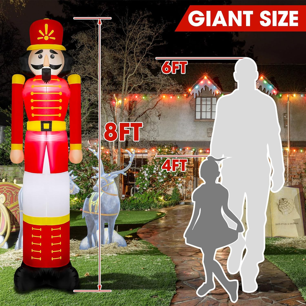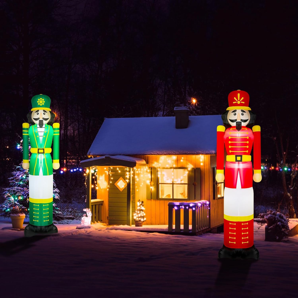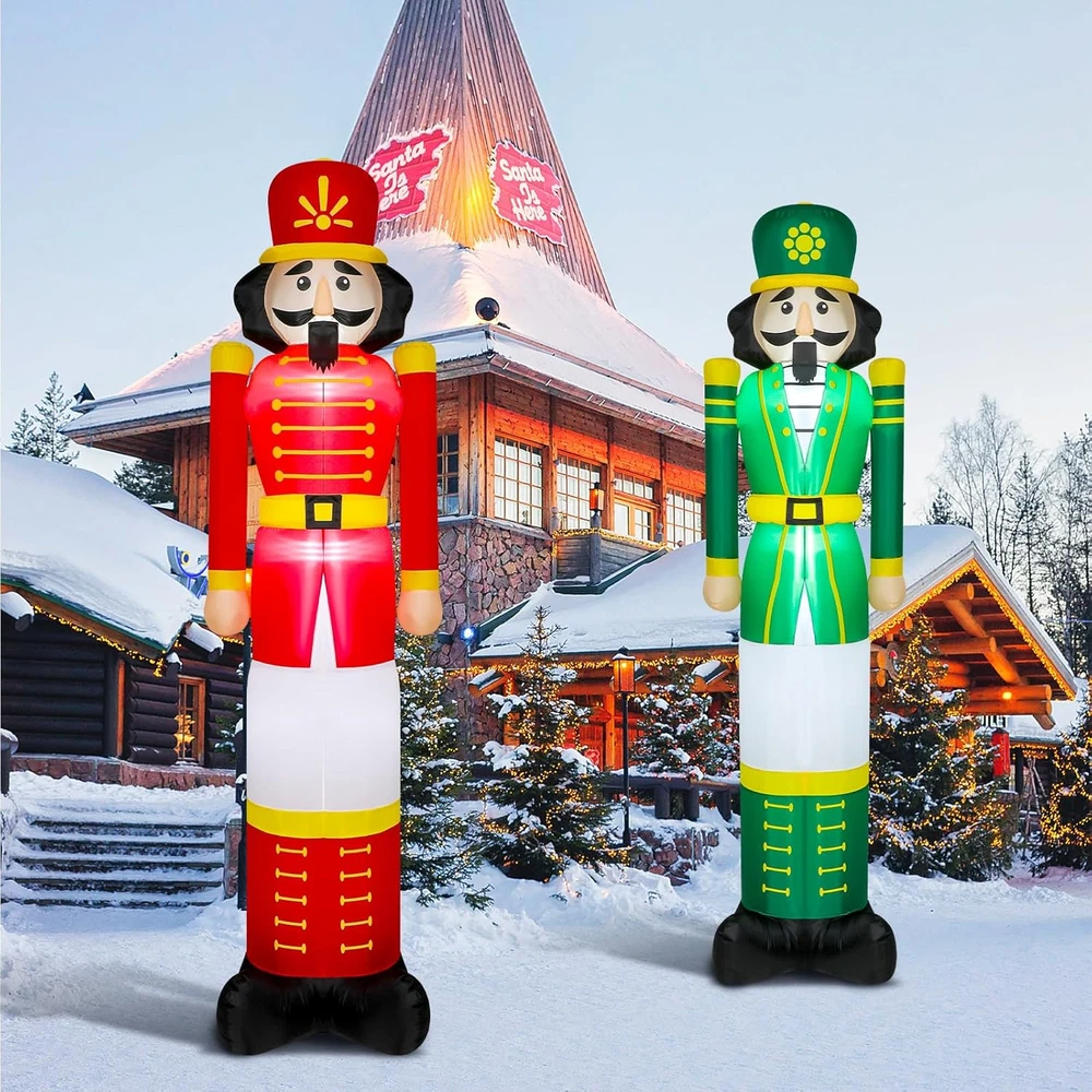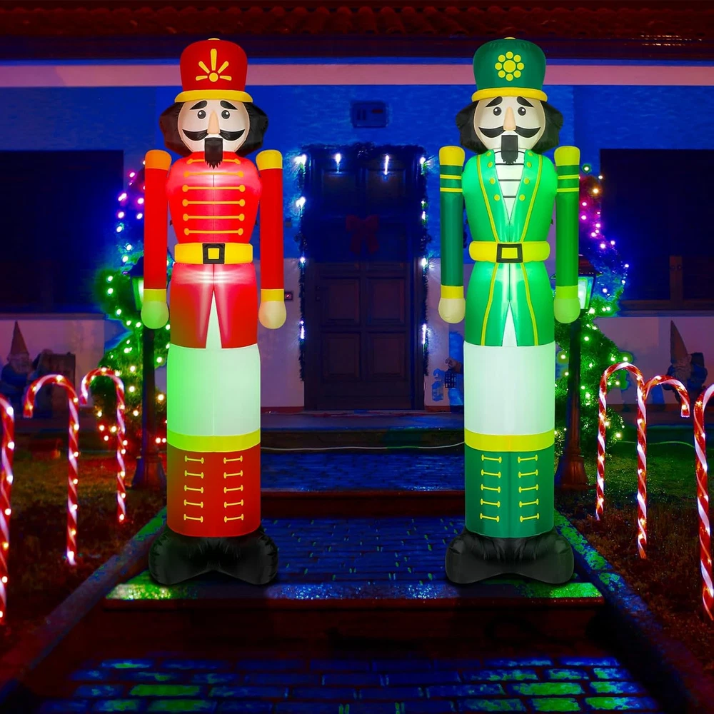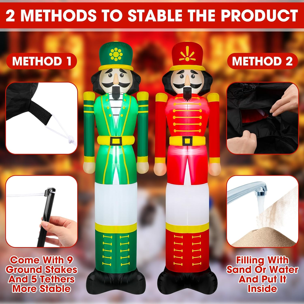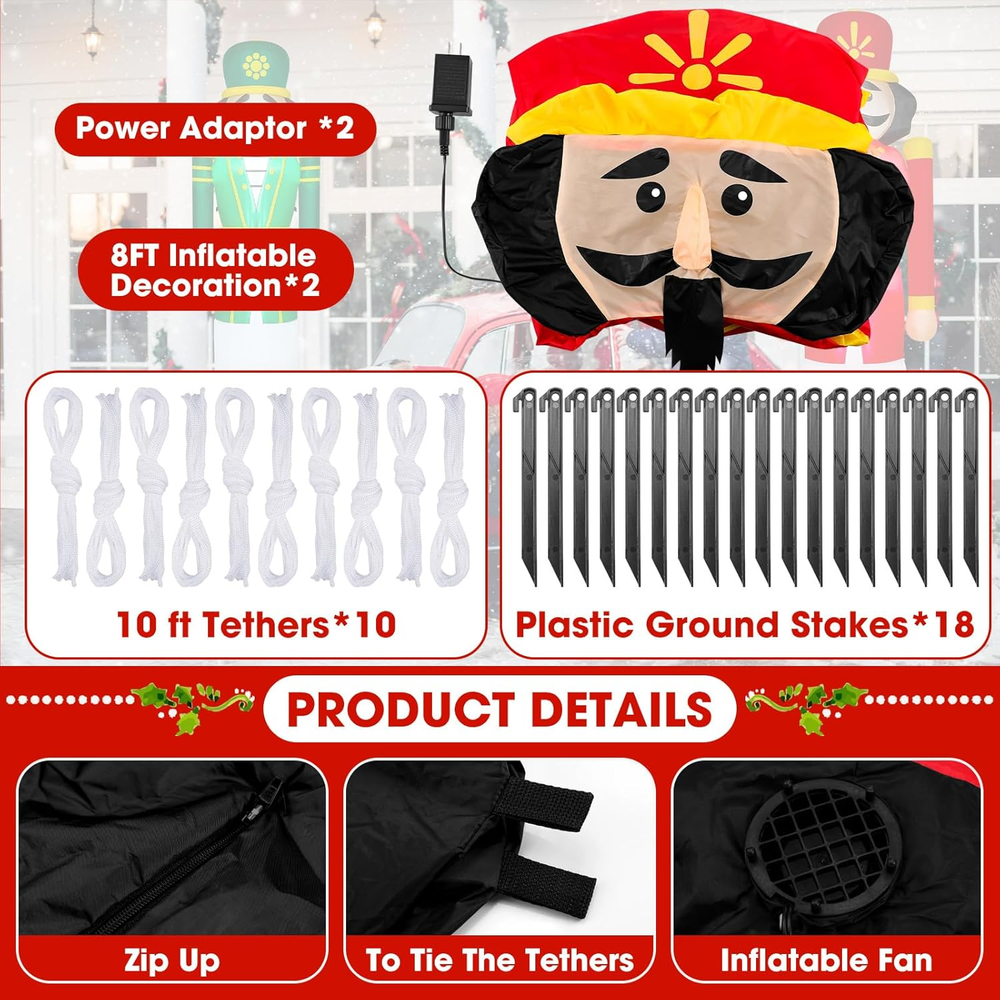 Christmas Decorations: You will receive 2pcs 8 ft Christmas inflatable Nutcracker soldier decorations in different styles, which are ideal for giant Christmas decorations, each equipped with a blower, adapter, stake and rope, with built-in Led lights to create a warm and bright festive atmosphere for your holiday decorations. Light up your Christmas:This inflatable nutcracker soldier has four bright LED lights inside to create a nighttime light display;Lighting Christmas inflatable decorations are suitable for display in your yard and are ideal for Christmas light display events that will captivate your guests and neighbors Easy to Use: this lighted nutcracker yard stake can be automatically inflated with a 1A built in fan and a 1.25A adapter; You just plug it in, and it will inflate completely in a few minutes; Just zip up the bottom to avoid air leaks; When it's time to put them away, you can unzip them for quick deflating and compact storage Quality Material: Christmas Nutcracker soldier with waterproof polyester fabric; It's lightweight, waterproof, weather resistant, fade resistant, and well-sewn, so you never have to worry about any tears or holes; Inflatable nutcrackers, stakes, and strings are all made of more sturdy and durable materials, and they will create a festive focal point in your front or backyard and a joyous atmosphere around your family Versatile Decoration: this giant inflatable Christmas decoration can be applied in yards, sidewalks, doorways, yards, gardens, lawns, outdoor home Christmas decorations and more, as well as making ideal Christmas gifts for friend, family and colleagues Product description