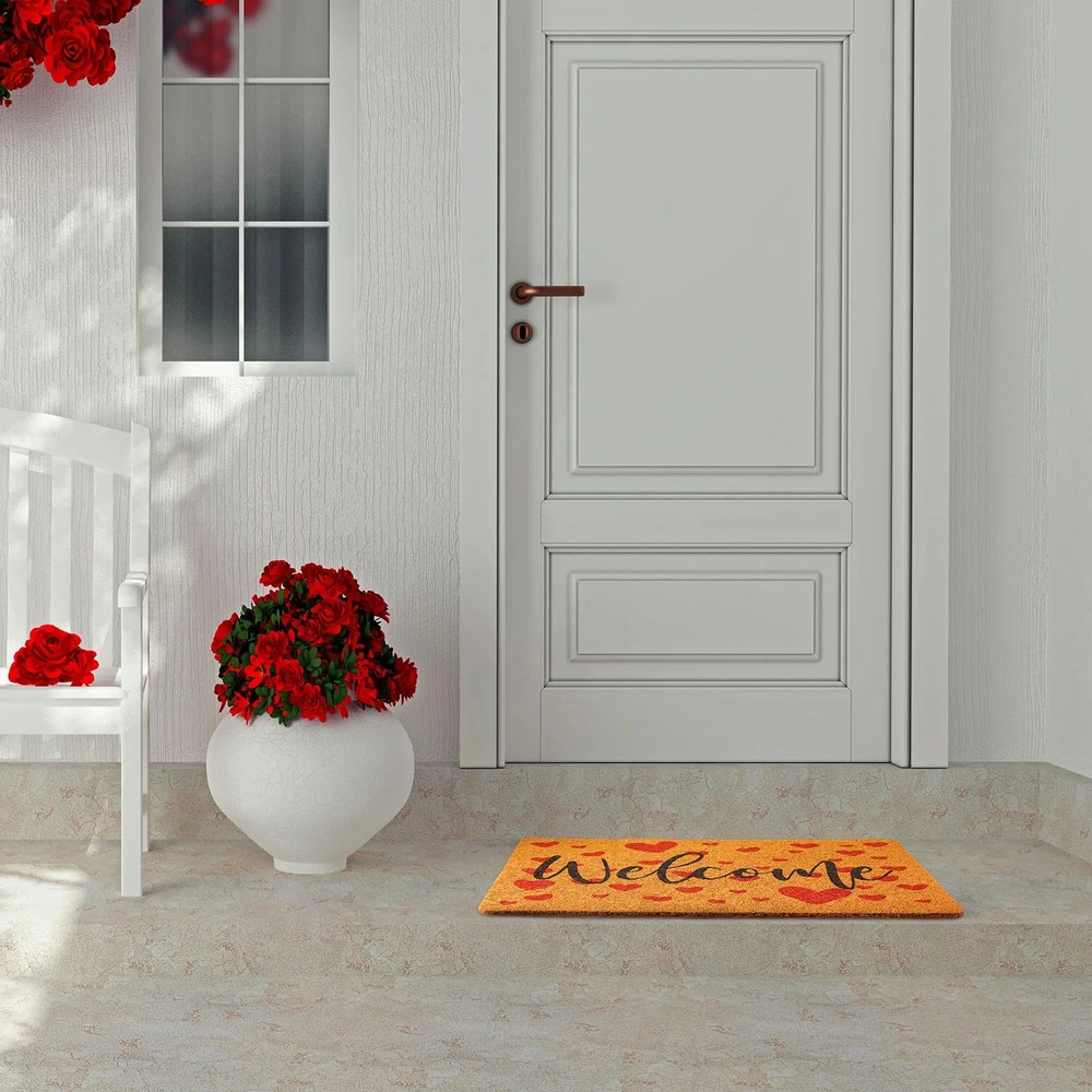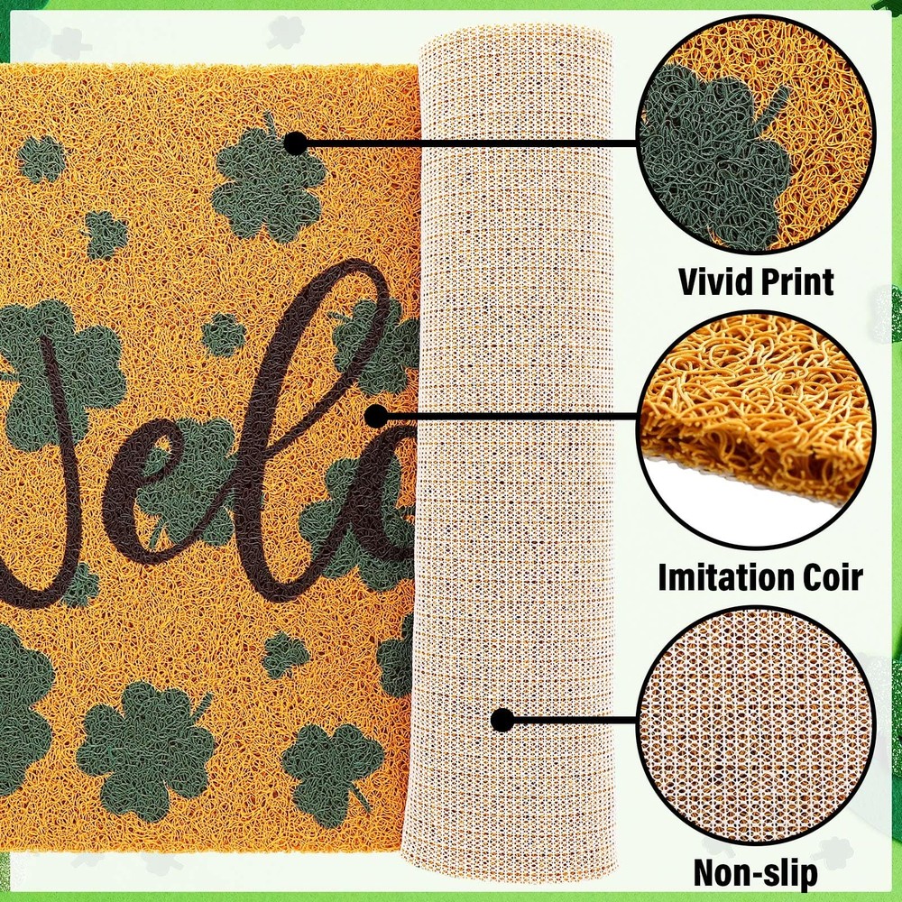 Features: Festive decoration: The holiday inspired designs of these welcome door mats are fit for adding a touch of warmth and cheer to your home during special occasions such as Valentine's Day and St. Patrick's Day. The red hearts and green shamrocks are eye catching and inviting, making your guests feel welcome and comfortable. They're also an ideal way to showcase your festive spirit and add a sense of color to your home decor. As gifts: These heart and shamrock door mats make ideal gifts for family and friends who appreciate practical yet stylish home decor accessories. They're suitable for housewarming parties, weddings, birthdays, or other special occasions. The festive designs add a personal touch to your gift and show that you care about their well being. Specifications: Material: imitation coconut, nonslip rubber backing Color: as pictures show Size: about 17.7 x 29.5 inches/ 45 x 75 cm Styles: red hearts, green shamrocks Package includes: 2 x Imitation coir welcome door mats Notes: Manual measurement, please allow slight errors on size. The color may exist a slight difference due to different screen displays. Package Content: each package contains 2 imitation coir outdoor welcome mats for front door in 2 styles, providing you with a spare mat or allowing you to use them in multiple locations; The doormats are printed with the word 'Welcome', one has red Valentine's Day hearts, and another has St. Patrick's Day green shamrocks; You can use one mat at the front door and another at the back door, or use them in different rooms of your house Large Size: measuring about 17.7 x 29.5 inches/ 45 x 75 cm, this welcome rug is large enough to accommodate most doorways and provide ample space for wiping shoes; The size is suitable for households with high traffic areas, ensuring that people can wipe their shoes before entering the house; The large size also makes it suitable for commercial use in restaurant, office, or other public spaces; You can stick these 2 doormats together or separate them at different entrances to welcome your guests Quality Material: the large welcome mat is made of quality imitation coconut material with a nonslip rubber backing, providing good protection against dirt, mud, and water, easy to clean; The imitation coconut material is reliable and long lasting, and strong stitching and sturdy finish ensure that these 2 door mats will serve you well for a long time; The nonslip rubber backing prevents the mats from slipping or sliding, keeping them in place and keeping you safe from accidental falls Hearts and Shamrocks Design: the festive holiday styles of these coir doormats make them an ideal addition to your home during special occasions; They add a touch of warmth and cheer to your guests' arrival, making them feel welcome and comfortable; You can use them to decorate your home during Valentine's Day, or St. Patrick's Day, Irish Day, daily life, or other special occasions that call for a festive touch, standing on them to avoid direct contact with the cold ground Wide Application: these outdoor door mats for outside entry are versatile and can be applied in a variety of indoor and outdoor areas, such as your front door, back door, porch, patio, garage, kitchen, bathroom, living room, bedroom, laundry room, office, and more; Their quality material and nonslip rubber backing make them suitable for high traffic areas that are prone to dirt and water; They're also easy to clean and maintain, making them a practical choice for busy households