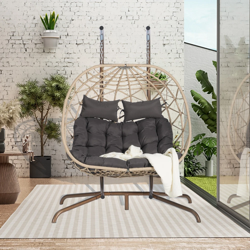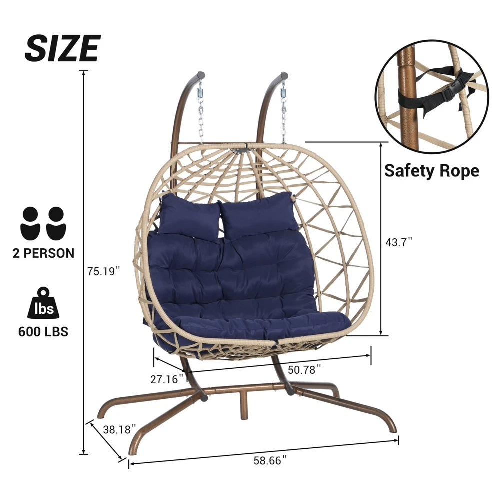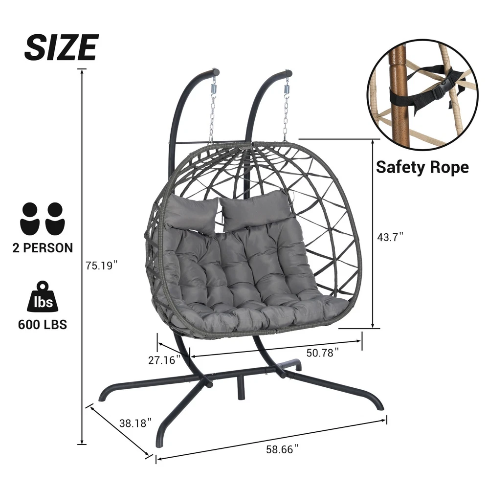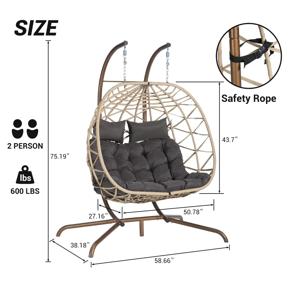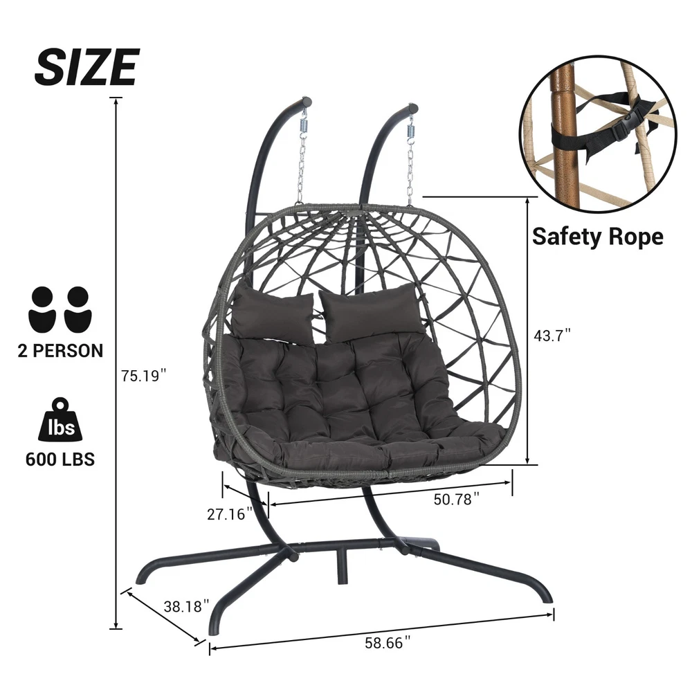 Description: This egg swing chair that fits 2 people comfortably was built to last in the outdoors with its strong durable iron frame it will be perfect for all weathers. Sit in luxurious comfort while surrounded by the peace and beauty of your backyard, or enjoy a good book indoors with this comfortable hanging chair. The seat cushions are made of premium polyester fabric and filled with cotton, it is soft and comfortable. The chair is crafted from wicker rattan, it is UV-Resistant, rust resistance and weather-resistant. Metal stand ensure the stability and safety for you and your family. Features: 1.High-quality durable iron frame, UV-Resistant, & rust resistance great for outdoor use 2.Hand-woven and handcrafted Wicker material by outstanding craftsmen 3.Cushion made from outdoor fabric and filled with soft Cotton, breathable design 4.Supported by a stand constructed from strong and durable iron 5.Fits 2 people and enough space for any position that you like 6.Iron Spreader Bar Included 7.Simple Assembly Required Specifications: Product Type: Egg Chair Style: Modern Seating Capacity: 2 Chair Frame Color: Dark Gray, Light Yellow Cushion Color: Dark Gray, Blue, Light Gray, Red, Khahi Frame Material: Iron Chair Material: Rattan With Stand: Yes Cushions Included:Yes Cushion Material: Polyester Fabric Seat Fill Material: Cotton Assembly Required: Yes Additional Tools Required: All Tools Included Est. Assembly Time: 30 Mins Weight Capacity: 600 lbs Dimension: 58.66"L x 38.18"W x 75.19"H Weight: 78 lb Number of Packages: 1 Package Included: 1x Egg Chair 2x Cushions 1x Stand 1x Hardware Bag 1x Instruction