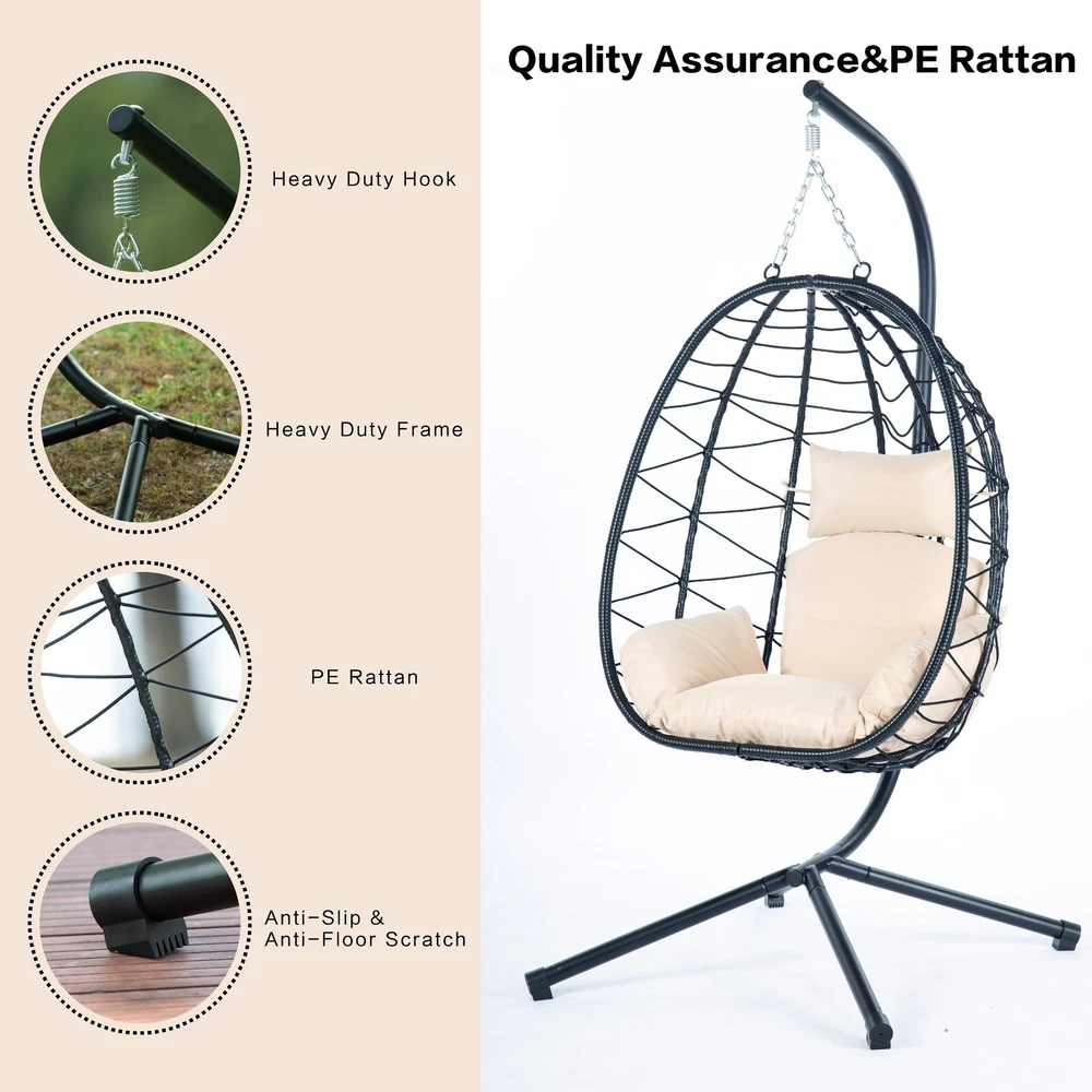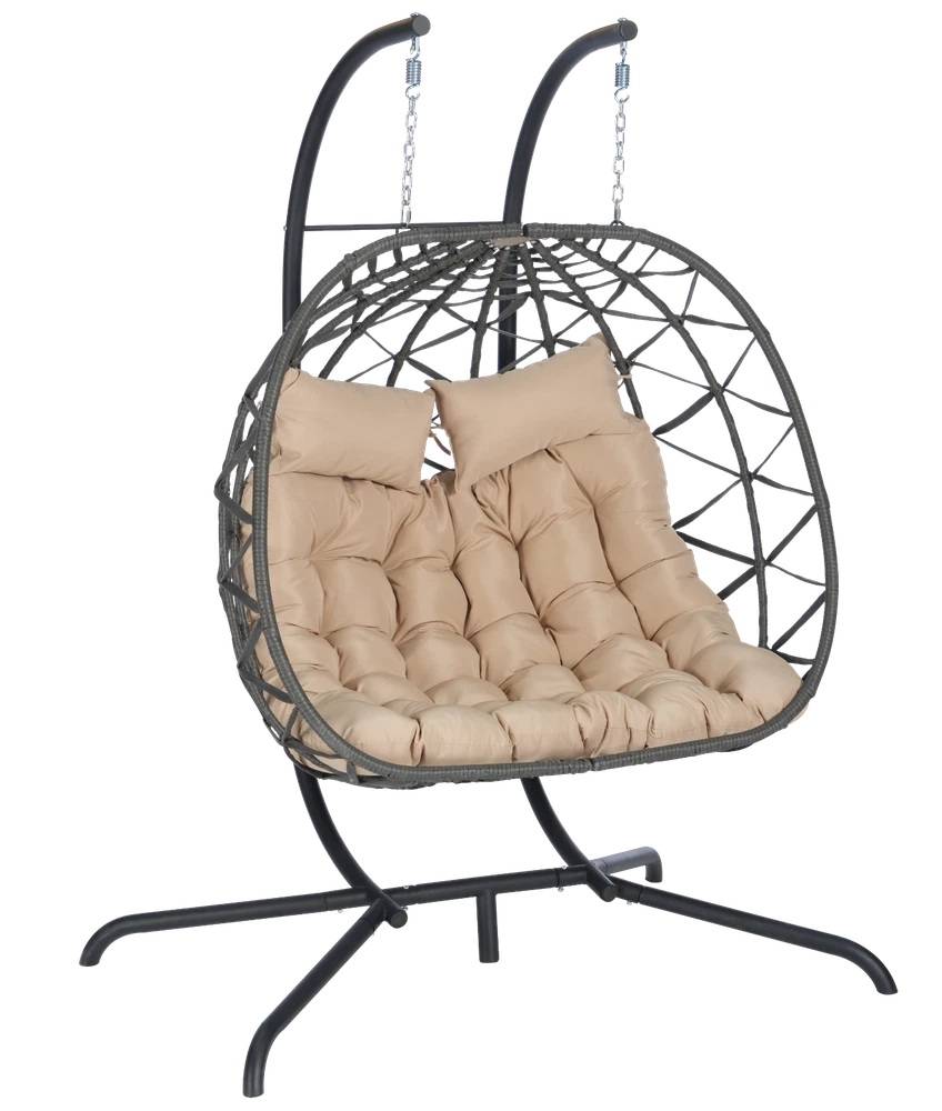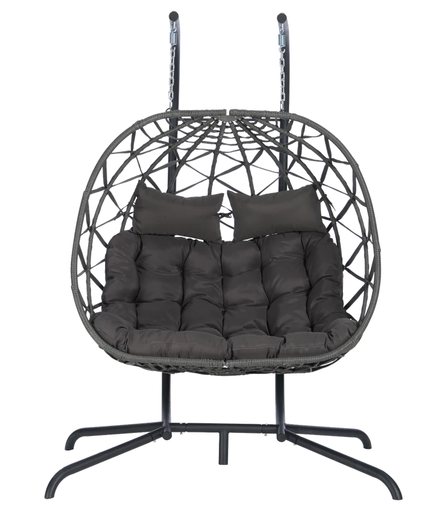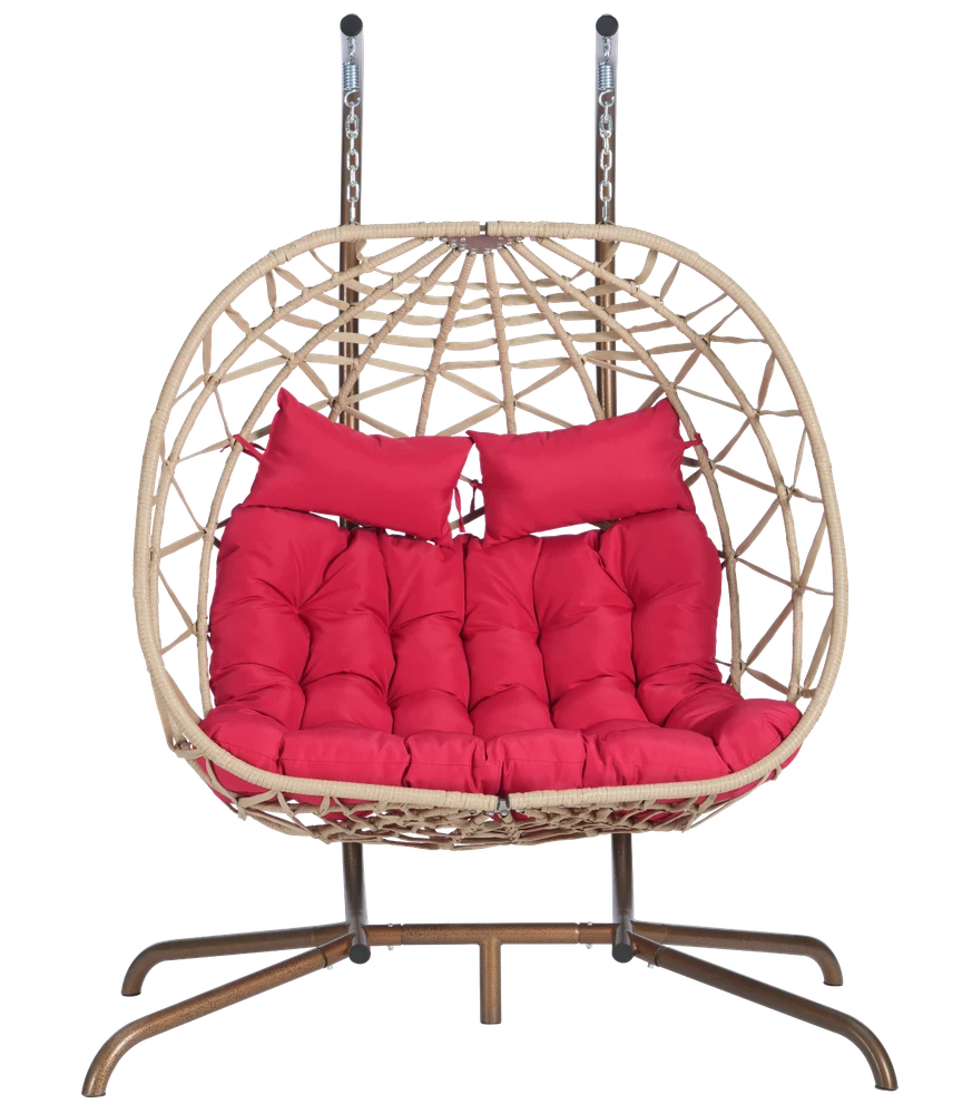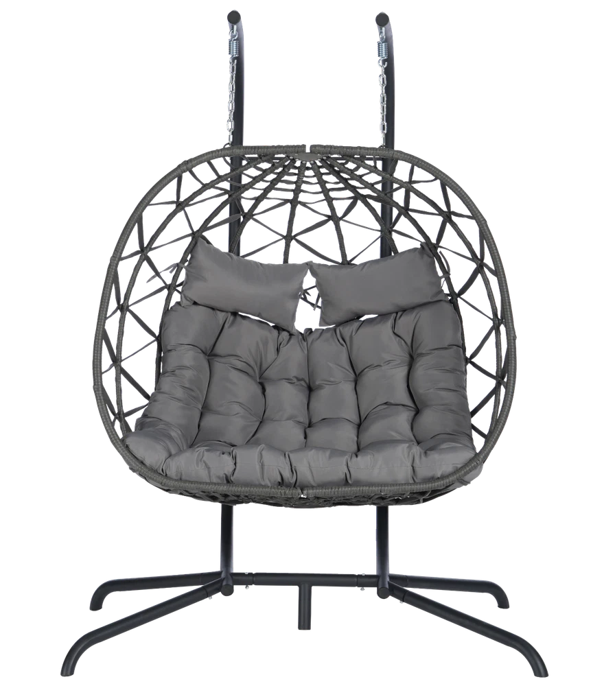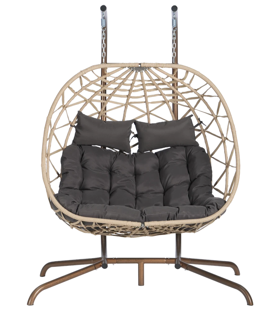 Description: This egg swing chair that fits 2 people comfortably was built to last in the outdoors with its strong durable iron frame it will be perfect for all weathers. Sit in luxurious comfort while surrounded by the peace and beauty of your backyard, or enjoy a good book indoors with this comfortable hanging chair. The seat cushions are made of premium polyester fabric and filled with cotton, it is soft and comfortable. The chair is crafted from wicker rattan, it is UV-Resistant, rust resistance and weather-resistant. Metal stand ensure the stability and safety for you and your family. Features: 1.High-quality durable iron frame, UV-Resistant, & rust resistance great for outdoor use 2.Hand-woven and handcrafted Wicker material by outstanding craftsmen 3.Cushion made from outdoor fabric and filled with soft Cotton, breathable design 4.Supported by a stand constructed from strong and durable iron 5.Fits 2 people and enough space for any position that you like 6.Iron Spreader Bar Included 7.Simple Assembly Required Specifications: Product Type: Egg Chair Style: Modern Seating Capacity: 2 Chair Frame Color: Dark Gray, Light Yellow Cushion Color: Dark Gray, Blue, Light Gray, Red, Khahi Frame Material: Iron Chair Material: Rattan With Stand: Yes Cushions Included:Yes Cushion Material: Polyester Fabric Seat Fill Material: Cotton Assembly Required: Yes Additional Tools Required: All Tools Included Est. Assembly Time: 30 Mins Weight Capacity: 600 lbs Dimension: 58.66"L x 38.18"W x 75.19"H Weight: 78 lb Number of Packages: 1 Package Included: 1x Egg Chair 2x Cushions 1x Stand 1x Hardware Bag 1x Instruction