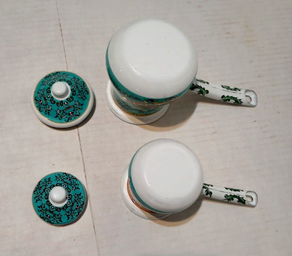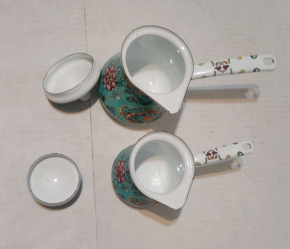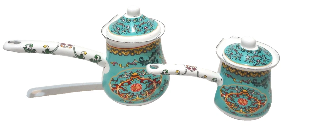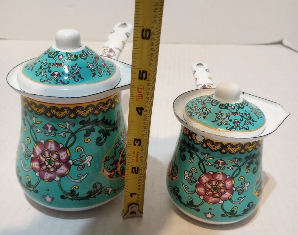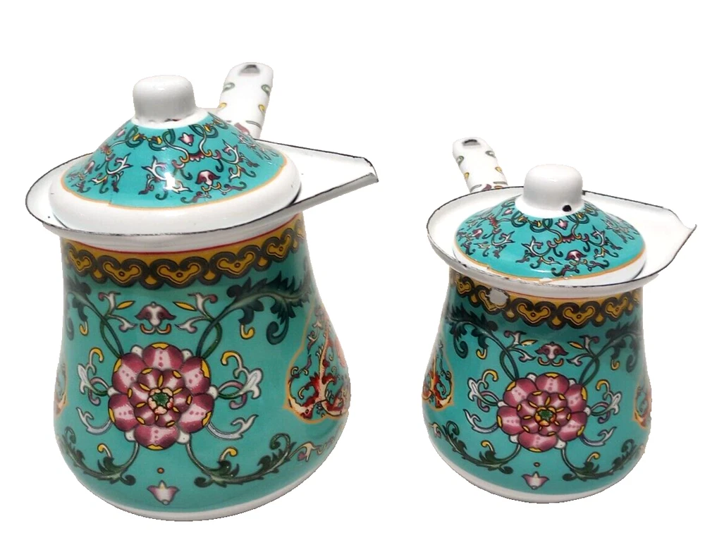 2 Piece Turkish Coffee Pot with Lids Blue Enamel Floral