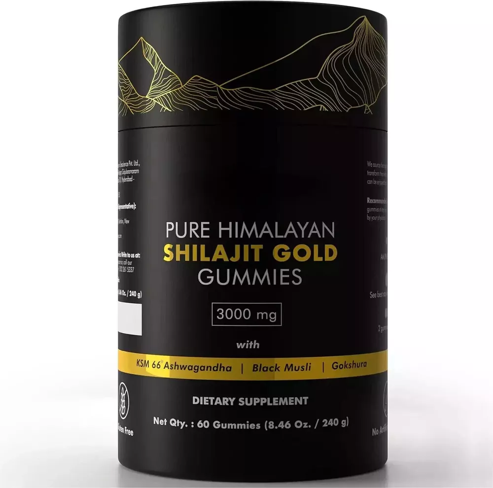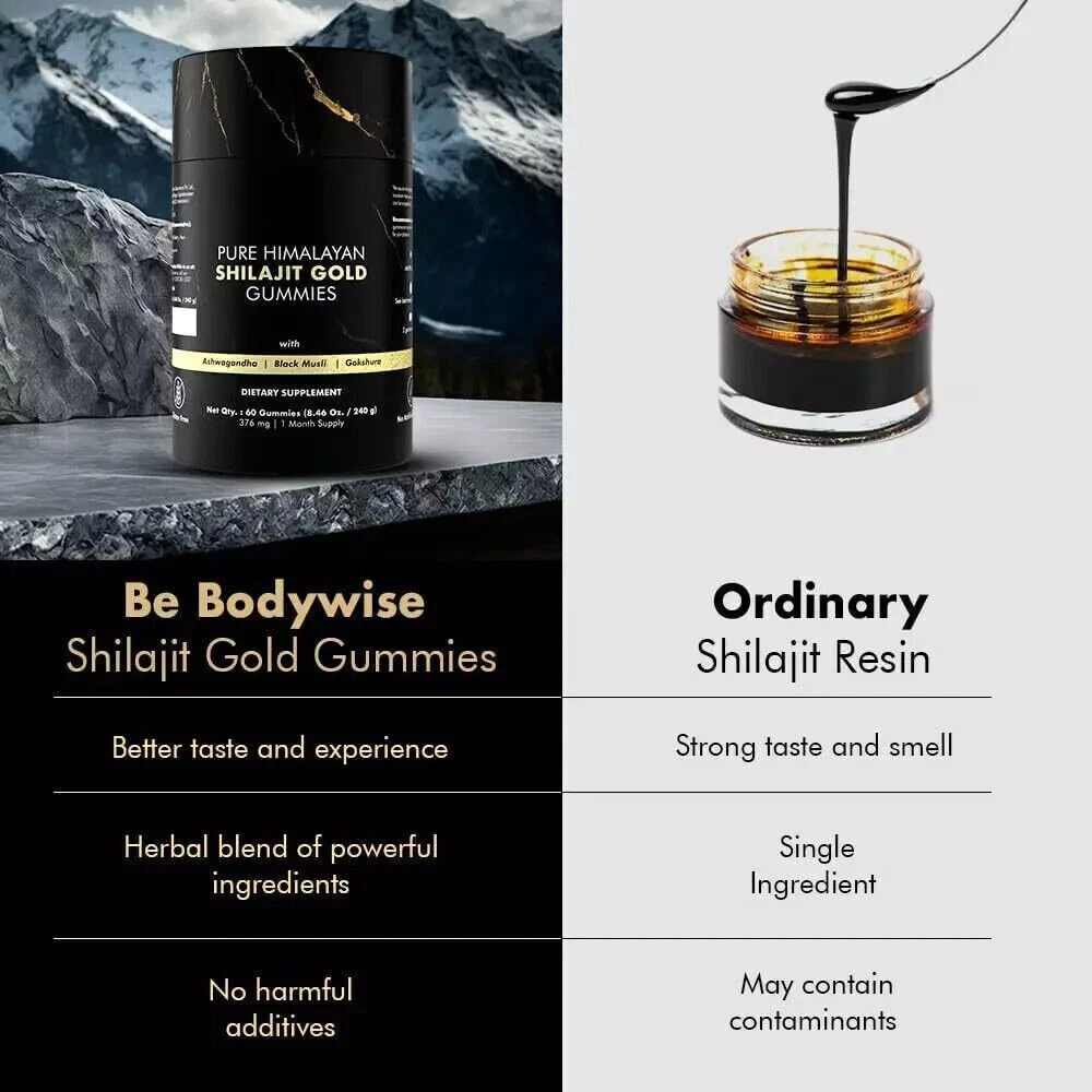 Package: 2 Pack = 120 Counts Pure Himalayan Shilajit Gummies Gold I Lab Tested I No Added Sugar I Ashwagandha, Gokshura| Fulvic Acid & 85+ Trace Minerals I for Men, Women I Non-GMO I 100% Natural & Organic I 60 Gummy SOURCED FROM HIMALAYAS: Harvested from pristine heights of Himalayan Mountain, our Pure Himalayan Shilajit Gold Gummy contains pure & organic gold grade shilajit, sourced from 18,000 ft above sea level. Especially prepared to aid transformational journey towards wellness by boosting energy and aiding enhanced workout routine & recovery. Our gummy is a modern way of consuming our trusted power packed supplement. LAB TESTED & PREMIUM QUALITY: Be Bodywise Pure Himalayan Shilajit Resin Gold Gummy is “Lab Tested” to be free from heavy metals, fillers, and harmful additives. Crafted in its most authentic form, it has no added sugar, corn starch, glucose syrup, artificial colours, or gum. It's completely vegan, natural, and non-GMO. NATURE’S POWERHOUSE: With "3000 mg Pure Shilajit" , “ No Added Sugar” and infusion of potent ingredients including Ashwagandha, Black Musli & Gokshura; our Shilajit Gold Gummies pack a powerful punch of essential nutrients that are 100% natural and organic. Our Shilajit Gold Gummy comes free of heavy metal and chemical contaminants. STRENGHTEN & REVITALISE: Our Power packed, all-in-one supplement combines potent action herbs like Himalayan Shilajit Resin, Ashwagandha, Saffron, Gokshura and Safed Musli. Every gummy delivers a powerful dose of Shilajit and Ashwagandha. These ingredients help enhance strength, aid post workout muscle recovery and reduce fatigue, giving you a boost to your overall wellbeing. TRAVEL FRIENDLY & INDIVDUALLY WRAPPED: Goodness of traditional ayurveda in a modern avatar; our travel friendly, “individually wrapped” gummies are a delicious way to add natural shilajit to energise your active daily lifestyle & enhanced workout routine. Have 2 Gummies a day for optimal result.