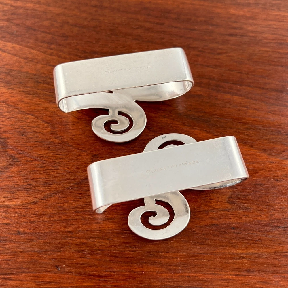 Awaiting your purchase are (2) rare sterling silver napkin rings crafted by Tiffany & Co. in a wonderful Pierced Modernist style pattern. These special items remain in Excellent condition, (see condition report above), and each bears no monogram . Height: 3/4" Width: 2 3/4" Length: 2" Weight: 83.8g _______________________________________________ JEWELRY SIZING WRIST SIZE = TOTAL INSIDE CIRCUMFERENCE INCLUDING CUFF GAP WE LIKE TO PROTECT THE INTEGRITY OF THE PIECES SO WE DO NOT OFFER OR SUGGEST SIZING METAL PURITY SOLID SILVER = .700-.899 / 1 COIN SILVER = .900 / 1 STERLING SILVER = .925 & ABOVE *WE HAVE TESTED ALL STONES & METALS THAT WE IDENTIFY AND GUARANTEE THEIR PURITY. ALL UNIDENTIFIED STONES AND METALS HAVE A ???. *DISPLAY ITEMS AND BOXES ARE NOT INCLUDED UNLESS STATED OTHERWISE. *WE OFFER COMBINED SHIPPING FOR DOMESTIC & INTERNATIONAL PURCHASES. THANK YOU FOR SUPPORTING SMALL BUSINESS! Browsing Silverware for Baby? See new store at : https://www.ebay.com/str/ohbabies