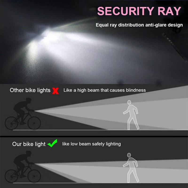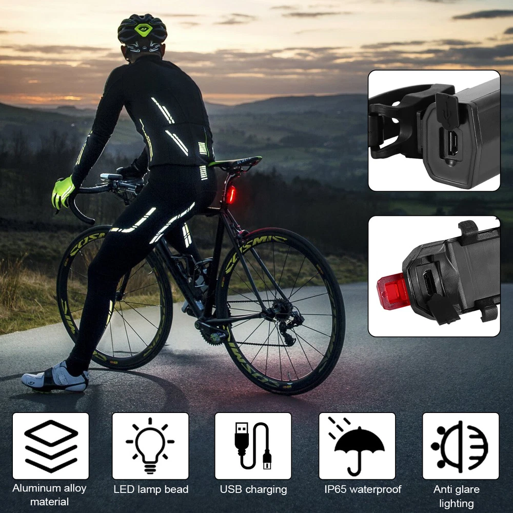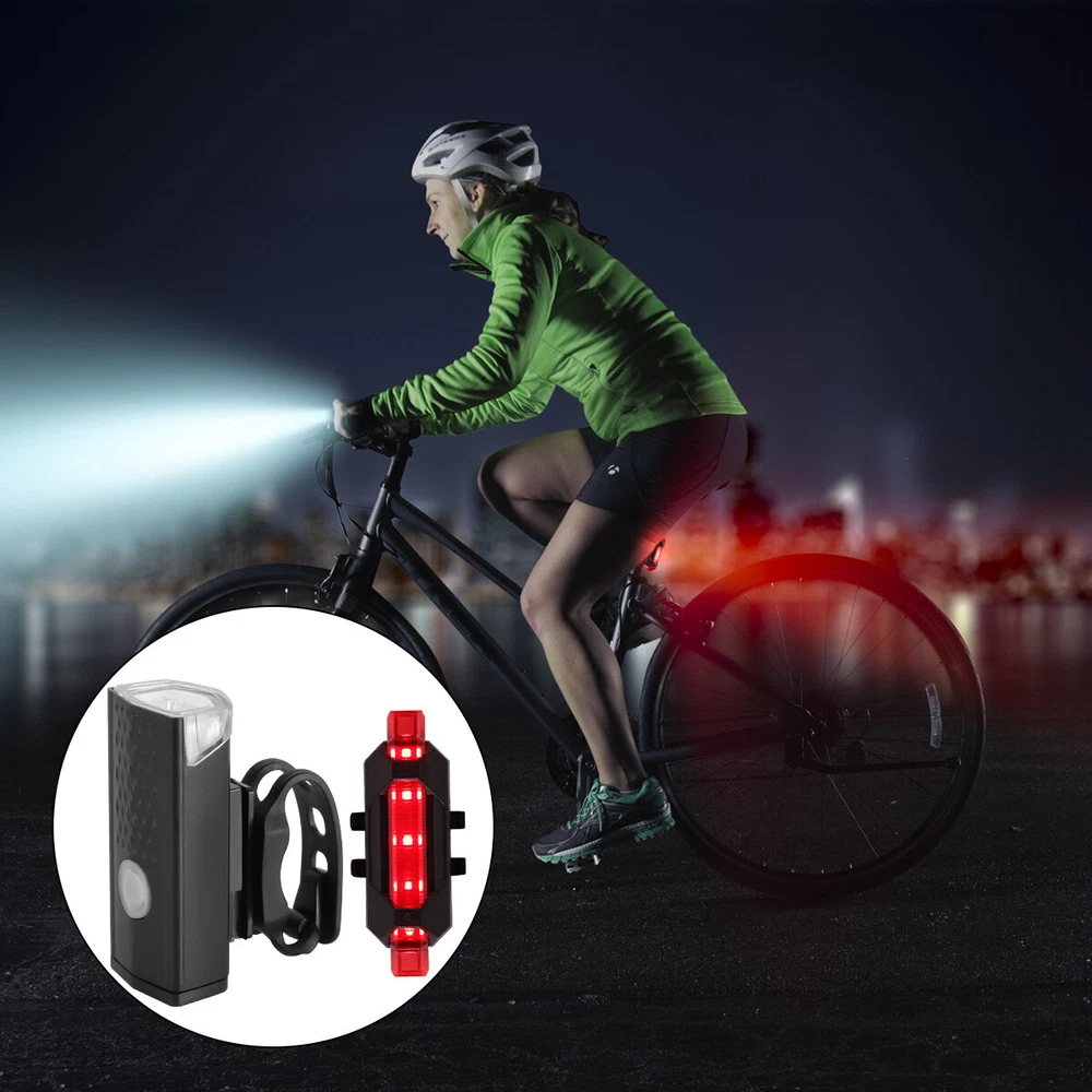Product Features: Super Bright Bike Lights: Include Front Cycling Light and Back Light Front light has 3 modes-High/Low/Flashing,torch light with bike clamp, Button switch. Special designed light beam produces powerful lumen and generates a brilliant floodlight for Large area without wasting energy. USB rechargeable: Built in Rechargeable Li-ion battery, easily charged from your computer or any device with a USB port. 360º Visibility: Safety set for riding at night.Both a headlight and a tail light making your bicycle stand out with unmatched 360º visibility so you and your loved ones are safer in any low light conditions. Durable bike lights-Durable aluminum body, shock-resistance endure rough handling. Do not be afraid of the rough road. Waterproof: IP65-rated water resistant and designed for use in heavy rain and outside riding. Mini design ,lightweight,space-saving. A perfect gift for yourself or friend Installations: Easy to install with no tool required The fla shlight is easy to install on the bicycle with the adjusta ble bracket(3 small holes to adjust) without detach the mount from the bike. Specification: Condition: 100% Brand New and High Quality ! Type: Bicycle Light Materials: Aluminum alloy+Rubber Color: Black headlight+Red tail light Charging Method: USB Rechargeable Headlight Light Modes: (High/Low/Flashing) Taillight Light Modes: (Slide-Flashing-Always on) Waterproof Rate: IP65 Power Indicator: Battery Indicator LED flashes when battery power is low giving you time to lower light mode and conserve power. Mode Memory Function: returns to the mode last selected before powering down. Application: for cycling, hiking, camping, or any outdoor activity Package Includes: 2 x Front Light 2 x Back Light 4 x USB Cable 4 x O-ring