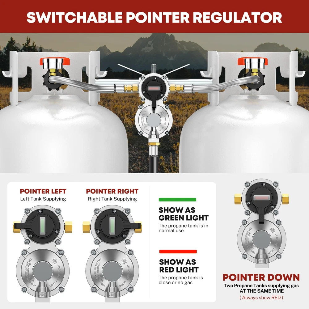 High-Quality Materials - Made of 100% solid brass, propane hose and regulator are durable and long-lasting. The RV pigtail propane hose is made of stainless steel braided material, ensuring air tightness and stability. All fittings are CSA certified. Package Includes: 1 PC 2 Stage Auto Changeover RV Propane Regulator, 2 pack 18'' Stainless Braided QCC1 1/4" Inverted Male Flare RV Pigtail Propane Hoses with Gauge, 1 PC Roll Sealing Tape, and 1 PC Wrench. Function Upgrade & 3 Zones Gas Gauge - Connect propane tanks at once with 's 2-Stage regulator, won't stop working because of them is out of gas, automatically switches from primary to reserve tank when primary is empty. At the same time, you can use the rotary pointer to designate of the tank to work on, and the indicator changes color to let you know when a tank needs to be refilled. 3 Zones gas level gauge for reading the gas level accurately at different temperatures! Specification & Parameters - 's RV propane regulator has a primary cylinder capacity of 210,000 BTU/hr and a reserve cylinder capacity of 130,000 BTU/hr. Inlets are 1/4" SAE Inverted Flare, Outlet is 3/8" Female NPT. RV pigtail propane hose has a 1/4" Male Inverted Flare and QCC1 Fitting. Versatile Application - Suitable for RVs, campers, and travel trailers with dual propane tanks. These 18" RV pigtail propane hoses with 2-stage propane regulator can connect dual 5-40 lb refillable propane tanks or LP gas tanks to your camper's 1/4" inverted male flare. Replace any existing automatic changeover regulator on your current RV, Travel Trailer, Camper, maintains constant and continuous gas. We Not Only Provide Propane Hoses - All propane hoses are under 1-Year . As we value every customer’s voice and experience with our products as well as with our service, we provide 24hrs/7days non-stop customer support to you. Pls feel free to us whenever you are concerned about the product or after-sales service.