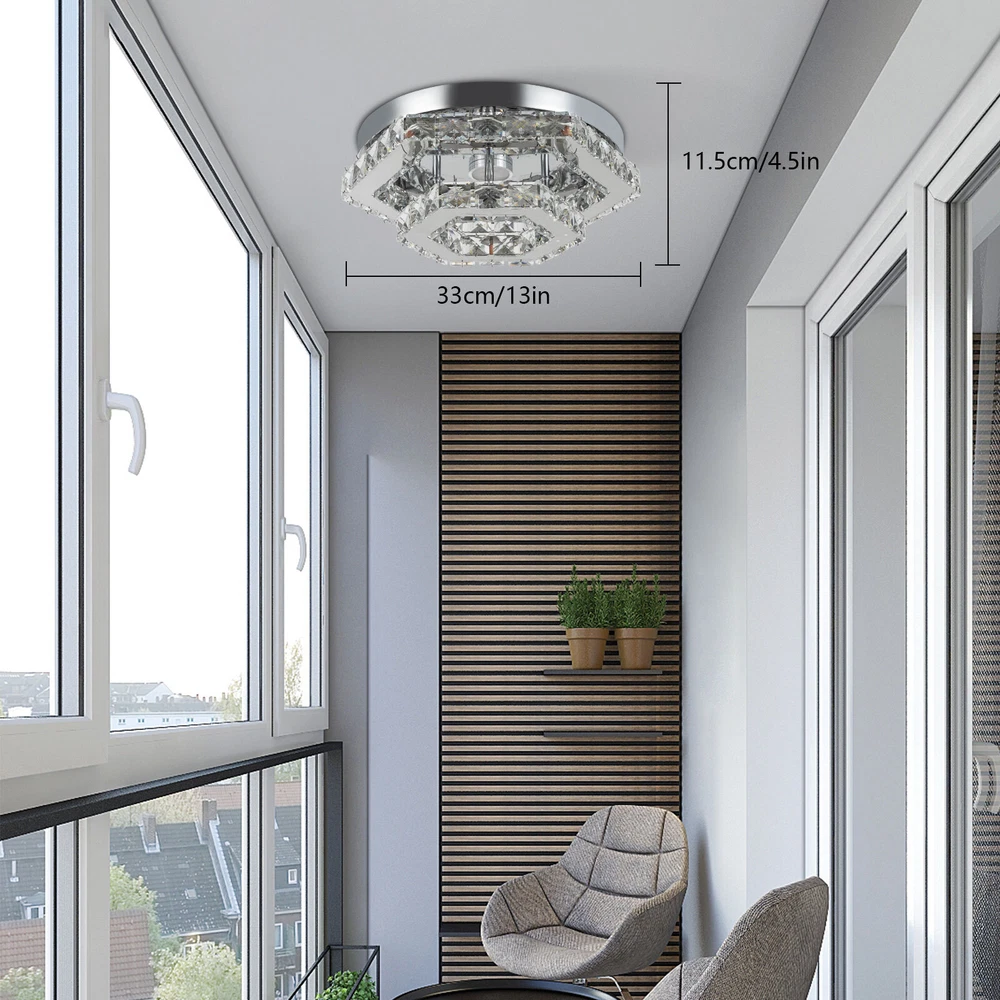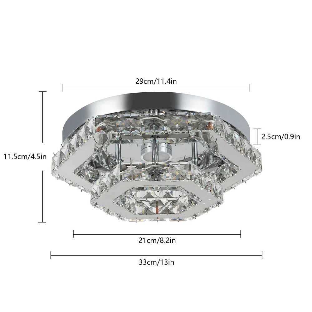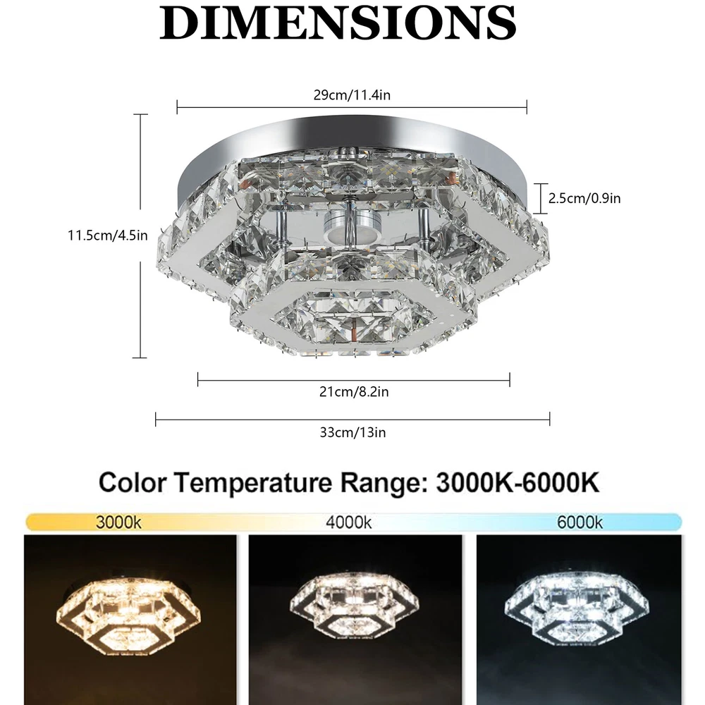 Description This crystal ceiling light combines a sophisticated look and a very modern atmosphere, not only creating a romantic and warm atmosphere for the living room but also creating a high-quality lifestyle. The high-quality material and exquisite workmanship make it durable. Bring it home quickly and add infinite excitement to your home environment! Key Features Build to Last: High-quality stainless steel, crystal, and exquisite laser cutting, and welding processes make the product resistant to high temperature, corrosion, and fading, which reduces the frequency of replacing lamps. Wide Application: The wide voltage (85-265V) allows it to be used in a wider range of applications. Excellent Light Source: The environment-friendly and energy-saving LED light with a high color ind 2 Tiers Crystal Ceiling Light, Modern Ceiling Mount Lamp Fixtures Remote Control Description This crystal ceiling light combines a sophisticated look and a very modern atmosphere, not only creating a romantic and warm atmosphere for the living room but also creating a high-quality lifestyle. The high-quality material and exquisite workmanship make it durable. Bring it home quickly and add infinite excitement to your home environment! Key Features Build to Last: High-quality stainless steel, crystal, and exquisite laser cutting, and welding processes make the product resistant to high temperature, corrosion, and fading, which reduces the frequency of replacing lamps. Wide Application: The wide voltage (85-265V) allows it to be used in a wider range of applications. Excellent Light Source: The environment-friendly and energy-saving LED light with a high color index can effectively avoid glare and stroboscopic, protect your eyes, restore the most authentic color of objects, serve an area of 53.82ft², and save your costs. Stylish Appearance: A hexagonal shape, shining chrome color, smooth lines, and beautiful two-layered crystals make it an unparalleled home décor piece that enhances the elegance of a room and adds a sophisticated aesthetic. Carefully Designed: The infinitely adjustable brightness, adjustable color temperature (3000-6000K), and three different light colors (warm, neutral, and white) can fully meet your usage needs in different scenarios, making it more convenient. Excellent Gift: The beautiful appearance and good practicality make it a great gift for parents, friends, and lovers on birthdays, holidays, and housewarming. Convenient to Use: It is basically assembled for you, and the ceiling light kit includes an English manual containing installation guides, all you need to do is follow the instructions to install the product to the ceiling. Easy Maintenance: A simple construction and smooth surface make this product easy to clean, and you just need to clean it with a dry cloth. Embrace Smart Life: Applied with a remote control, you can easily adjust the light colors and brightness while lying in bed within 16.4ft and don't need to get up and press the switch, bringing more convenience to your life. Protective Packaging: To prevent as much as possible damage to the product during transport, this product is packaged with foams that can effectively resist normal crushing and dropping. Details Stable Chassis : The 11.4" diameter round chassis increases stress area, ensures stable support for the light body, and presents beauty. Sparkling Crystals : Layered crystals have good light transmission and can enhance the visual effect of the entire lamp. Smooth Edges: They can care for your skin during cleaning and installation and also improve the beauty of the product. Application With an application area of 53.82ft², it can be widely used in indoor spaces, such as bedrooms, dining rooms, living rooms, kitchens, dressing rooms, bars, hotels, restaurants, offices, and so on. Specifications Material: Stainless Steel, Crystal Process: Laser Cutting, Welding Color: Chrome Style: Modern Efficiency: E Assembly Required: No Shape: Hexagonal EU Energy Label Efficiency Labeling Class: A++ to E Mounting Type: Ceiling Mount Control Method: Remote Control(Included), Wall Switch(Not Included) Remote Control Battery Type: 2* AAA Batteries (Not Included) Remote Control Distance: 5m/16.4ft Light Source: LED Light Strip( Included) Light Color: White, Warm, Neutral Luminous Flux: About 2200LM Color Temperature: 3000-6000K Brightness: Infinitely Adjustable LED Driver Power: 48W Actual Power: 20W Input: 85-265VAC Output: 36-85VDC 280mA Applicable Area: 5m²/53.82ft² Chassis Size(D*H): 29*2.5cm/11.4*0.9in Total Product Size(L*H): 33*11.5cm/13*4.5in Gross Weight: 3.05kg/6.72lbs Net Weight: 2kg/4.41lbs Package Size: 41*41*15cm/16.14*16.14*5.91in Package Included 1* Crystal Ceiling Light 1* English Manual All Accessories for Assembly Notes Please note that the wall switch (not included) does not control the color temperature. Please check the product size before ordering to make sure it fits your room. Please use the lamp within the applicable voltage range and clean it regularly. Please cut off the power supply when you clean the light. Please wipe with a soft cotton cloth and do not use household cleaning agents. To ensure your safety, we recommend that two people install this lamp together. Please install it by someone with an electrical license if necessary. Please wear electric insulation gloves (not included) and avoid scratching the surface of the lamp when installing. Please make sure that the power supply has been cut off before installation, and conduct a power test before installation. Please read the manual completely before use, and pay particular attention to the safety instructions included. Please allow the slight color difference caused by the shooting light and 1-3 cm error due to manual measurement, and make sure you do not mind before ordering. Payment Delivery details Terms of sales About us Contact us Payment We accept ebay payment 。 Fees such as import duties, taxes are not included in the item price or
