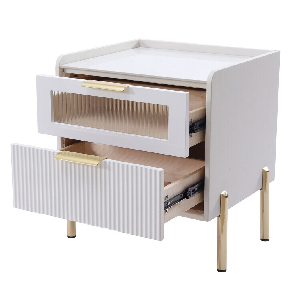 【For rooms】Overall Dimensions of Table:17.7" L x 15.7" W x 20.5" H, It strikes a clean-lined rectangular silhouette.It offers you enough space for your various things.You can use the open shelf to place your mobile phones, books, clocks, table lamps,magazines, etc. 【Modern and simple design】The modern minimalist design creates a homely and contemporary ambience. Best for decor, it will be the perfect addition to the room. 【Versatile use】This bedside table is versatile. Whether as a coffee table, end table, beside table or console table, it is a space-saving storage table. In addition, its elegant style will give modern accents to beautify your room. 【Smart storage】This modern two-drawer nightstand provides a storage solution for remotes,your favorite books, keepsakes, glasses... 2 Tiers End Table Storage Nightstand Side Table Bedroom Nightstand Decoration DESCRIPTION 【For rooms】Overall Dimensions of Table:17.7" L x 15.7" W x 20.5" H, It strikes a clean-lined rectangular silhouette.It offers you enough space for your various things. 【Versatile use】This bedside table is versatile. Whether as a coffee table, end table, beside table or console table, it is a space-saving storage table. In addition, its elegant style will give modern accents to beautify your room. 【Smart storage】This modern two-drawer nightstand provides a storage solution for remotes,your favorite books, keepsakes, glasses, and other necessaries at hand. The tabletop is perfect for displaying a lamp, clock, potted plant or photo frame to offer warmth and personalized decoration. 【No assembly required】You only need to simply install four table legs, saving you valuable time and effort. Enjoy a clean and tidy bedroom now. Describe: Product Dimensions: 17.7" L x 15.7" W x 20.5" H Material: Metal+MDF+glass+artificial leather Color: white + gold You only need to simply install four table legs, saving you valuable time and effort. Enjoy a clean and tidy bedroom now. Versatile and modern, leather, metal, glass are paired to create a modern, minimalist vibe. Smart storage, this two-drawer nightstand provides a storage solution for remotes, your favorite books, keepsakes, glasses and other necessaries at hand. Best for decorating,the tabletop is perfect for displaying a lamp, clock, potted plant or photo frame to offer warmth and personalized decoration. Payment Delivery details Terms of sales About us Contact us Payment We accept ebay payment 。 Fees such as import duties, taxes are not included in the item price or shipping costs. These charges are the buyer's responsibility. Delivery details Shipping: 2-9 working days to: USA Terms of sales We maintain high standards of excellence and strive for hundred percent customer satisfaction. Feedback is very important to us. We hope that you contact us immediately before you give neutral or negative feedback, so that we can address your concerns. It is impossible to address issues if we do not know about them! About us Your satis faction is our ultimate goal. We work hard to earn your trust and future business. Our certified technicians have tested each item before shipping. The unit comes with 1 year limited warranty on all manufacturing defects. a) If you receive a defective item, you may return it or ask for a discount. Please contact us within 14 days after you receive the package. b) What you returned must be intact and in its original packaging as re? u. Customer is responsible for shipping costs of the returned item. c) We will cover the cost of shipping back t with the shipping rate indicated in the registration page. We will send you a new unit or refund the full payment you paid. Thank you. Contact us Business Hour Business Hour: Monday To Friday: 8:30 AM to 5:00 PM (Beijing China time) Due to time zones, our reply to your questions may not be immediately. But within above working time, we will reply your email within 24 hours. If it's non-workdays, please kindly be patient and wait till Monday. Please contact us with ebay message. Please feel free to contact us if you have any questions. Monday To Friday: 8:30 AM to 5:00 PM (Beijing China time) Due to time zones, our reply to your questions may not be immediately. But within above working time, we will reply your email within 24 hours. If it's non-workdays, please kindly be patient and wait till Monday. Please contact us with ebay message. Please feel free to contact us if you have any questions.