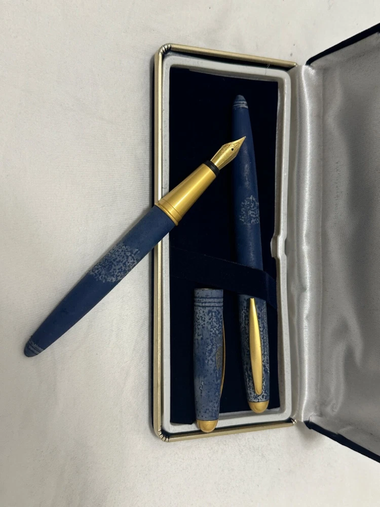 This exquisite vintage fountain pen holder, branded by the iconic Burj Al Arab in Dubai, is a must-have for collectors and pen enthusiasts. Known for its association with one of the world’s most luxurious hotels, this pen embodies elegance and sophistication. Crafted in Germany, it boasts a sleek blue design with gold chrome trim, making it a striking addition to any desk or collection. The medium-sized stainless steel nib ensures smooth, everyday writing, while the refined styling reflects the timeless prestige of the Burj Al Arab. Whether you're a passionate collector or simply seeking a distinguished piece for your writing experience, this fountain pen holder will certainly elevate your collection. Both pens have never been used, and come in original package.