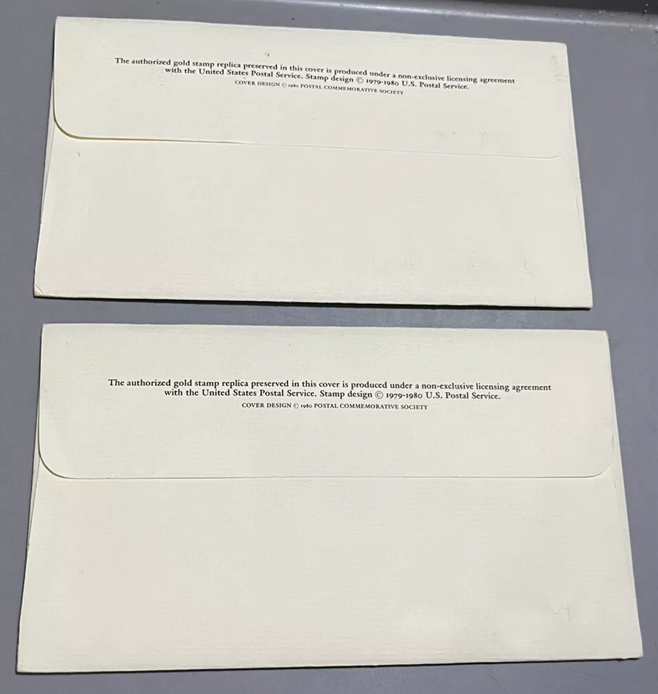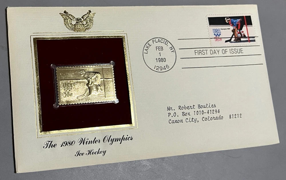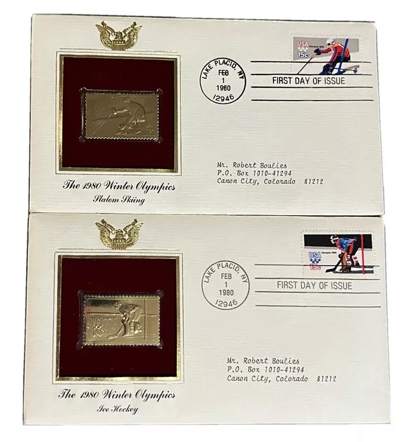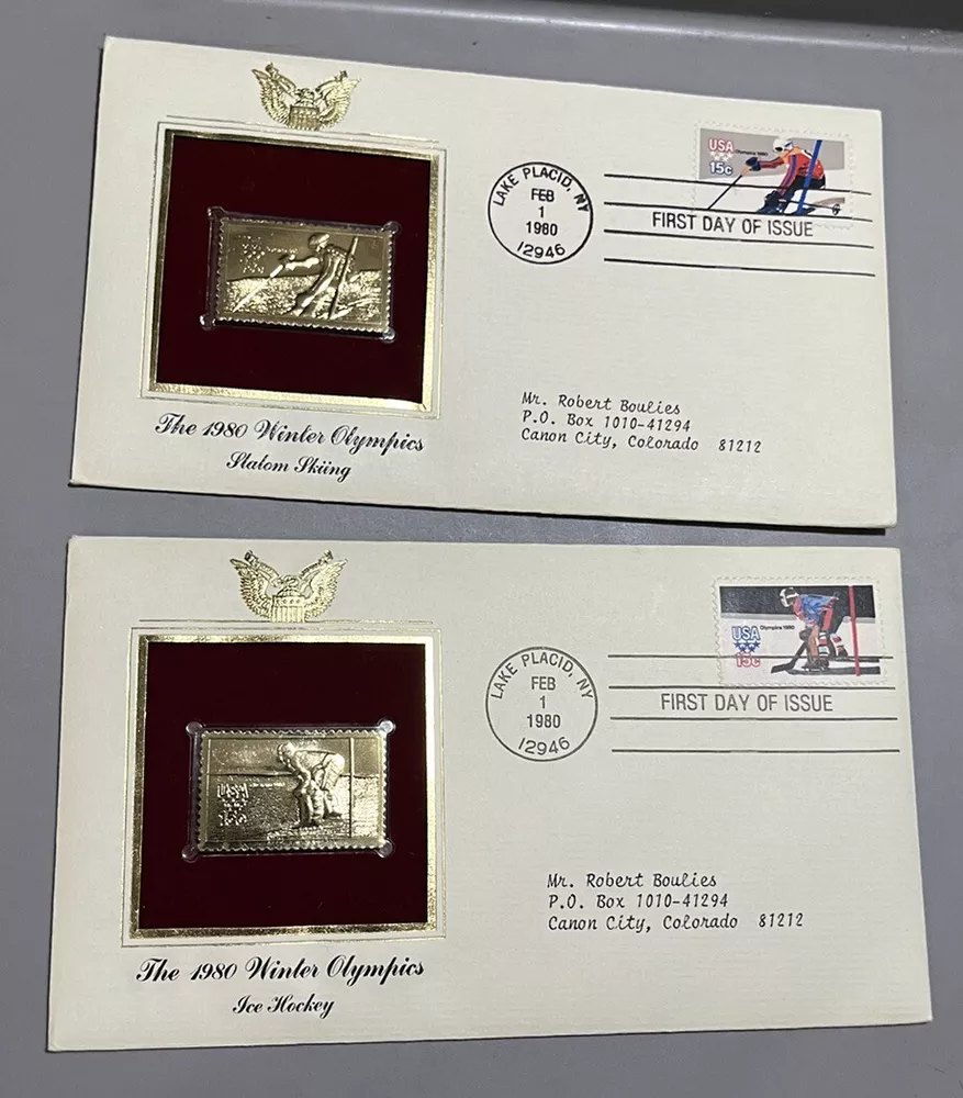 2 WINTER OLYMPICS 1980 1ST DAY ISSUE Gold Stamp Replica Hockey Slalom Skiing FDC Set of two first day cover envelopes sealed containing authorized replicas of gold stamps 15c Feb 1 1980 Envelopes have light storage wear. Review images Note: Ice hockey does not have red marks in gold replica. It is a reflection.