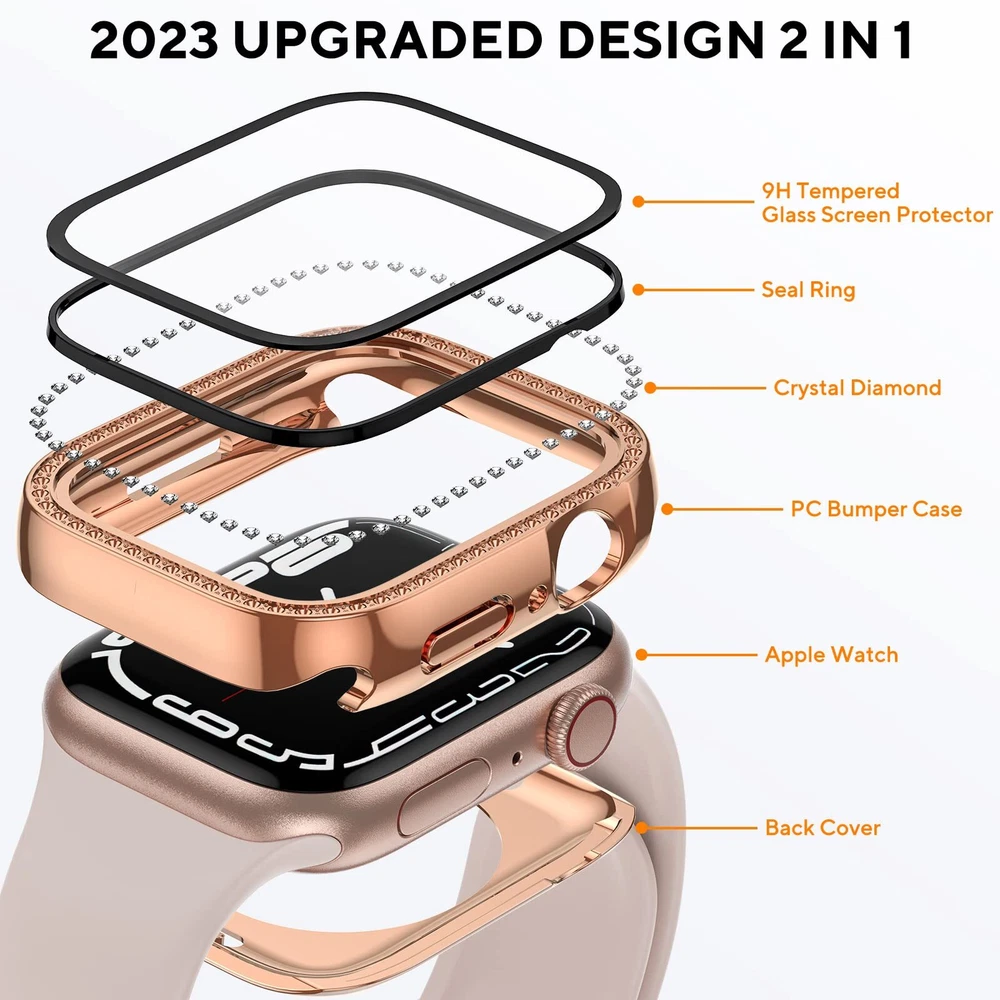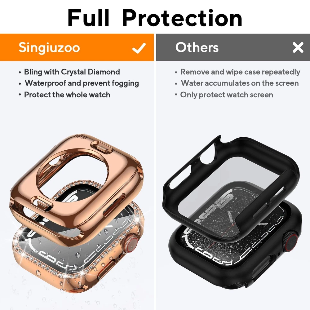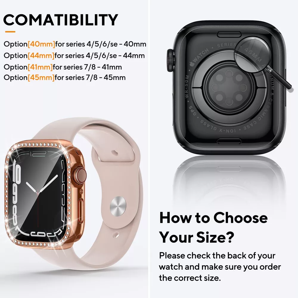 【For 41mm】This bling waterproof apple watch case with back cover is designed for Apple Watch Series 8 / 7 41mm. (Please confirm the size by checking the size mark on the back of the watch.) 【2 in 1 Full Protection】The design of the back cover makes the touch more sensitive. This new case make of hard PC material, built-in 9H tempered glass screen protector and back cover, protects your apple watch from dust, bumps, shatter, scratches and accidental drops in 360 degrees, protect the iwatch from everyday life. 【BEST GIFT】The bling apple watch cover set with sparkling rhinestones, turns sport watch into an elegant and stylish eye-catcher, shines bright in the sun or strong light, sparkle you all angle in any occasions and help you get many compliments. A best Birthday / Christmas / Anniversary / Thanksgiving Day / Mother's Day etc. gift for your friends, wife, mother, or even as a gift reward yourself to show on the party. 【Daily waterproof 】The built-in seal ring keeps water away from screen, the water will not seeps through the screen protector, which means you no longer need to remove case repeatedly and wipe water. (The old design case of others may cause the touch sensitivity to decrease disk when you wash your hands or take a bath etc.) 【Easy to Install and Charging】 Charge directly, don't need to take off the appe watch case and band. The back cover case is easy to install and remove, the instruction and a tool is included in package. We offer a two-year warranty with unconditionally refund or free replace if defective or any quality problems. Via "Login Amazon" → "Your Account" → "Your orders" → "Ask Product Question".
