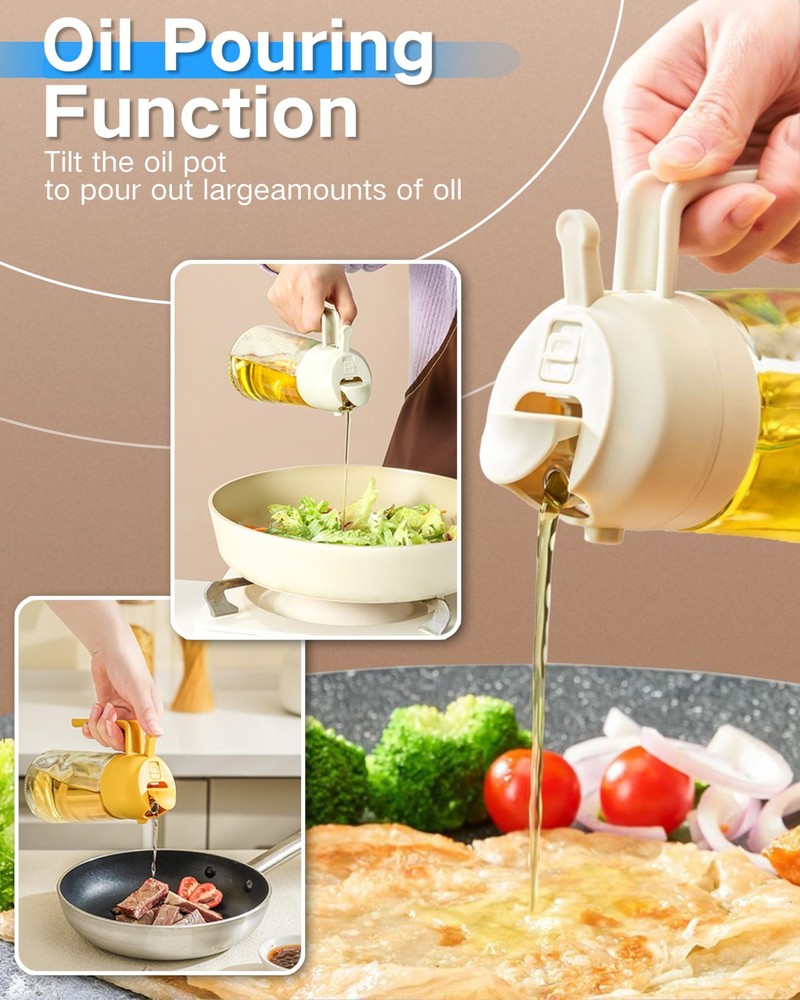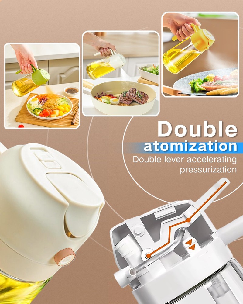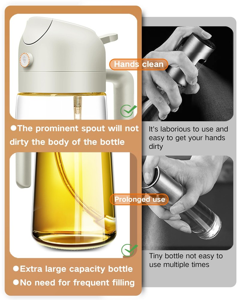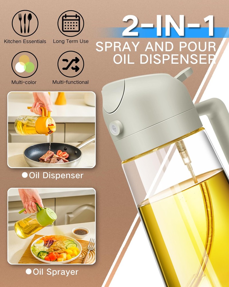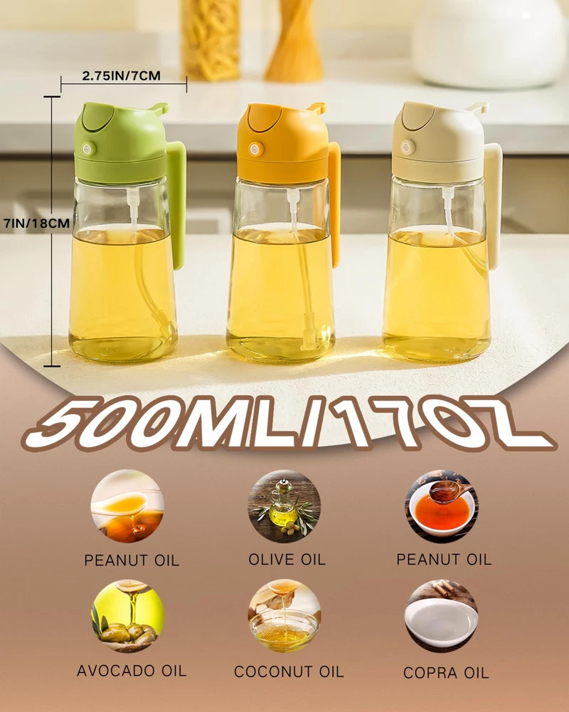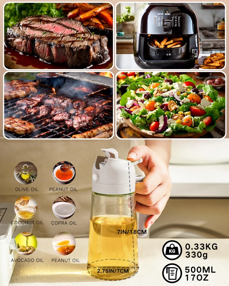 2-in-1 Oil Sprayer & Pourer: This versatile oil dispenser functions as both a spray bottle and a pouring bottle, perfect for salad dressing, frying, grilling, baking, and more. Easily switch between fine mist and steady stream for precise oil control Glass Bottle: Made of high-quality transparent glass, this 500ml oil dispenser lets you easily check oil levels while cooking Adjustable Nozzle: The Olive Oil Sprayer has a unique nozzle that pours or sprays oil without getting your hands dirty. When pressed quickly, it produces a wide-angle fine mist; when pressed slowly, it provides a steady stream of oil Leak-Proof & Easy to Refil: Designed with a secure seal to prevent spills, this oil sprayer is easy to refill and clean. The ergonomic design ensures a comfortable grip during use Multifunctional: Cooking oil dispenser can be used to hold liquids such as oil, vinegar, syrup etc and is suitable for hand and machine washing