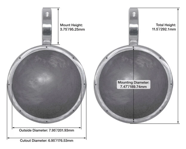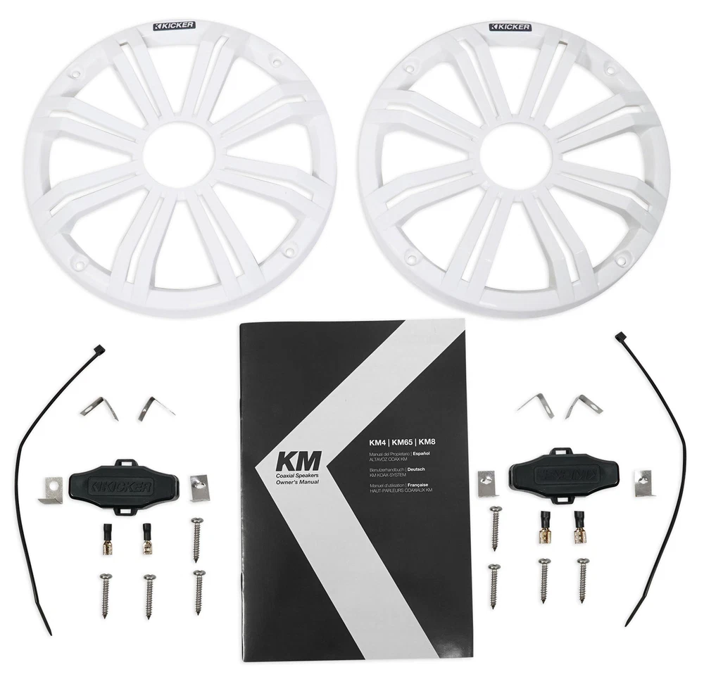 Car Audio & Video Pro Audio Marine Audio Lighting Karaoke Home/Portable Audio (2) kicker KM8 8" LED 360° Swivel Black Aluminum Wakeboard Tower Speakers Click Thumbnails to Enlarge Condition and Warranty Condition: BRAND NEW IN ORIGINAL PACKAGING Warranty: 1 YEAR AUDIOSAVINGS Product Description Package Includes: (1) Pair Rockville MAC80B 7.7” Black Aluminum Wakeboard Tower Speaker Pod Enclosures (1) Pair MAC360B 360° Degree Swivel Tower/Surface Mount Clamps 4 Rockville Wakeboards (1) Pair Kicker 45KM84L 8" 600 Watt Marine Boat Waterproof Speakers w/ LED's KM8 Video of MAC80B: Includes: 2 Wakeboard Cans All mounting hardware (2) 2.375” rubber inserts (2) 2.25” rubber inserts (2) 2.5” rubber inserts (2) 2” rubber inserts Rockville is proud to introduce our all new line of aluminum wakeboard cans. The MAC80B comes in pairs and includes our rugged universal aluminum clamp for easy installation to any wakeboard tower pole measuring from 2" to 2.5" diameter. Six precision molded high impact rubber inserts guarantee fitment on towers from 2” to 2.5”. Our clamp inserts are precision-fitted to sit perfectly inside the metal clamps. The speaker terminals are safely enclosed inside the waterproof speaker canister. ***Please note if you need an insert to accommodate a 1.75" diameter tube please let us know and we will send one out to you free of charge! These awesome pods are built of super strong aircraft grade 6061 aluminum. The MAC80B features a black powder-coat finish which offers unparalleled resistance to chipping, scratching, and fading. They are fully marinized which means they’ll withstand the elements on the water. These cans are 100 % waterproof. What makes our technology the best on the market is that our pods are internally wired! This means the terminals are inside the pod and the wires are fed through pre-drilled holes on the pod and clamp. Simply align the wire opening with the hole on your tower and you are done! No exposed wires or terminals! Aluminum cans will last forever! The sound quality of these are phenomenal! These are the perfect amount of air space to give you the perfect sound quality with the leading marine speakers on the market from brands like Kicker, Rockford Fosgate, etc. Our high efficiency design means more audio output from the same speakers! This means you get louder, cleaner sound with less distortion using our wakeboard enclosures than with other brands. Features: Pair of Rockville MAC80B black aluminum can wakeboard tower enclosures Made of high quality 6061 aircraft grade aluminum Beautiful black powder-coat finish 100% waterproof and fully marinized against salt and fresh water conditions Internally wired for clean install—no exposed wires or terminals High efficiency design features the perfect airspace for 7.7” speakers Rugged universal mounting clamps made of 6061 aluminum Includes precision molded, high impact plastic inserts for tower fitment from 2” diameter to 2.5” diameter Mounting Depth - 7.4" Total Depth - 9.5" Cutout - 6.95" Diameter - 7.95". Mounting diameter - 7.47" Height of mount - 3.75" Total height of unit - 11.5" *??Although the pre-drilled holes will accommodate most speakers on the market, there may be some that don't fit. If that is the case you can drill holes into the lip of the can to line up with your speaker's mounting holes. ?? Video of MAC360: Includes: (2) Swivel mount kits (2) Rubber washers that go between the swivel mount and the MAC clamp (2) Stainless steel quick release knobs (1) Hex key (2) M6 x 20 socket head bolts (to connect the block to the speaker enclosure) (2) Stainless steel deck screws for surface mounting Description: Rockville is proud to introduce a new accessory which is the perfect addition to our line of aluminum wakeboard enclosures. The Rockville MAC360 is a dual -purpose mounting clamp which will allow you to swivel your MAC enclosures 360 degrees and give you the ability to surface mount them. Surface mounting gives you the flexibility to quickly and easily install these enclosures anywhere on your boat! To add this clamp to your enclosure simply unscrew the existing clamp from your MAC can and screw the swivel bracket between the old clamp and the enclosure. These clamps are manufactured with high quality aircraft grade aluminum making them extremely durable and able to withstand the most extreme conditions. Features: Pair Rockville MAC360S 360 Degree Swivel and Surface Mount Clamp for MAC65, MAC69, MAC80, MAC90, MAC525 Pods Marine grade aluminum swivel clamps Designed for use with MAC525, MAC65, MAC69, MAC80, MAC90 speaker pods Aircraft grade aluminum construction Adds 360 degree rotational swivel to your MAC cans Ads Surface mount option to your MAC cans Includes all necessary mounting hardware Color: Black Specifications: Product weight: 1.5 lbs per pair Unit dimensions: 3.1" x 2.3" x 1.5" Authorized Kicker Dealer! What's In The Box: (2) 8" 4-Ohm Coaxials (8) Mounting Screws (8) Mounting Screw Clips (2) Wire Connection Cover (2) Zip Ties Description of 45KM84L: Loud and clear, the KM Coaxial Marine Speakers are built to pump out the tunes – and the fun - for years to come! Whether you mount your speakers in the hull or in KICKER® tower enclosures, you also get a pair of stout marine-grade grilles! Our speakers are made to thrive in the water. UV treatments on injection-molded cones, Santoprene surrounds, baskets and grilles all help maintain top-shelf performance. KM speakers will endure almost any weather conditions with splash-and-spray-resistant sealed motors, cones and Locking/Sealed Terminal Covers. Speaker hardware is forged from rustproof, 316L stainless-steel. Features: Pair KICKER 45KM84L 8" 600 Watt Marine Waterproof Speakers w/ LED's RMS Power Handling: 150 Watts (Per Speaker) Peak Power Handling: 300 Watts (Per Speaker) Sensitivity: 92 dB Four-Ohm Voice Coil One-Inch Titanium Tweeter UV-Treated Polypropylene Woofer With Santoprene® Surround UV-Resistant Po