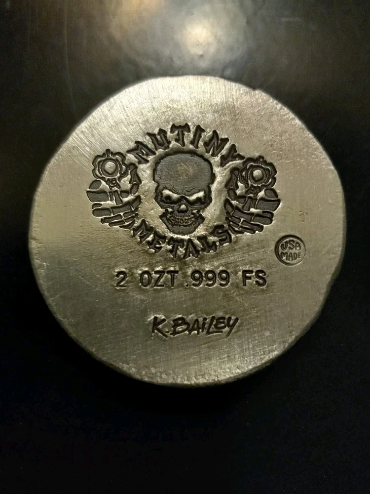 The product is a 2 oz silver round with a fineness of 0.999, featuring a design called "Ye Shall Not Pass" in high relief. It is hand poured by Mutiny Metals, known for their unique and quality silver products. The round shape and high silver content make it a desirable piece for collectors and investors looking to add a distinctive item to their precious metal collection.