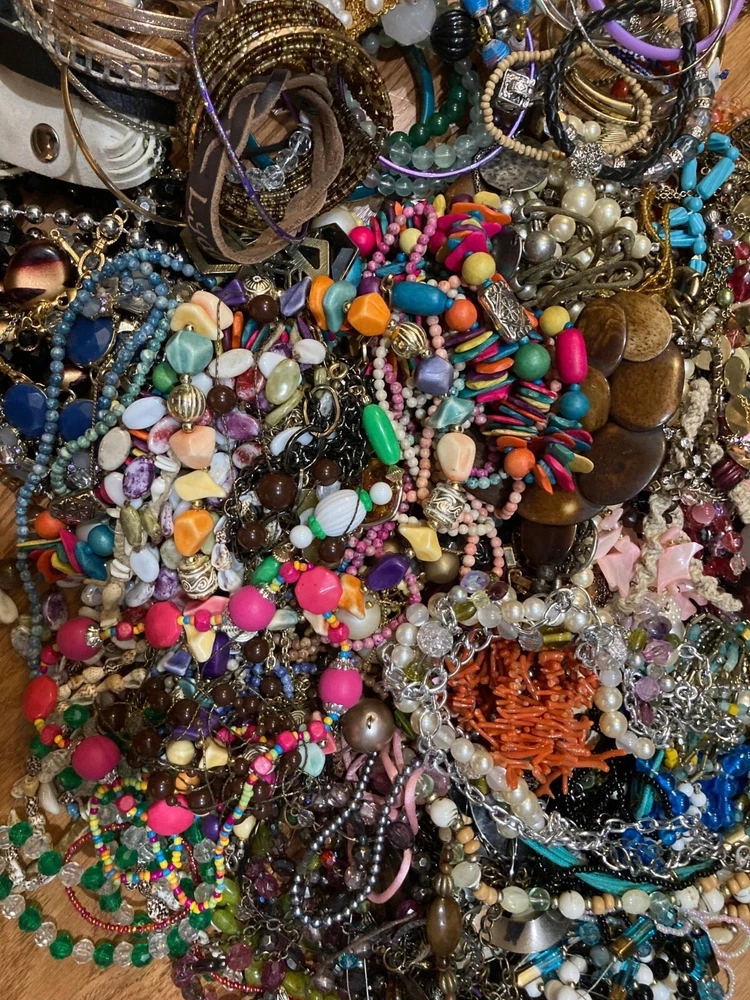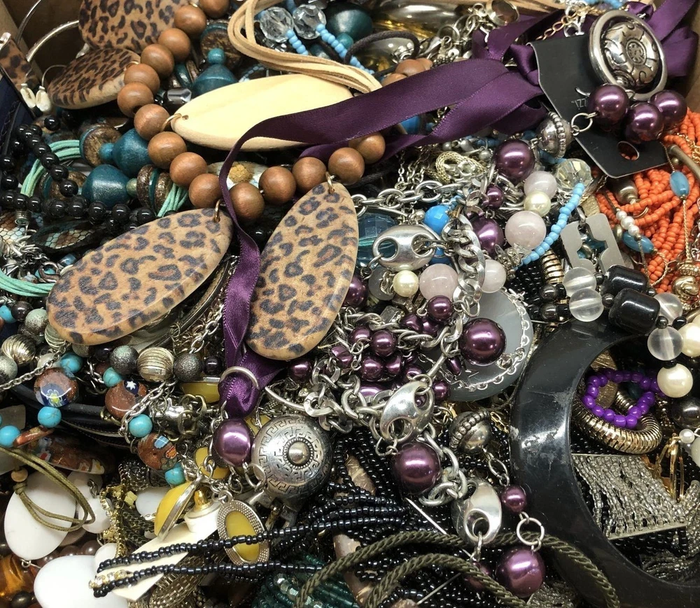 2+ lbs / pounds of wearable jewelry. Random mystery lot! I try to remove any broken or very worn pieces, but some may slip through. Vintage to modern costume jewelry. Mix of necklaces, bracelets, earrings, pendants etc. Sold in 2 lb lots; so one lot = 2 lbs, two lots = 4 lbs, three lots = 6 lbs, etc. The more you buy the more you save! Earrings will have matches but may be missing the backs. Items may be tangled but I do my best to untangle everything prior to shipping. Jewelry is grabbed at random and there are no guarantees of specific styles, color, size, or type. I do not include the children's plastic bangles as shown in one of the photos. I took these pictures over a year ago and just haven't gotten around to update them. Most of the jewelry now is more vintage-y since that seems to be what people like more. I still do include modern, and try to mix in other styles too. I aim to ship within 24-48 hours of the order being placed. Actual arrival time will depend on USPS. Even though you might get lucky, it is best to assume these lots don't contain any precious metals Due to the nature of the listing, there a no refunds or returns for these lots. They are sold as-is. However, do not hesitate to reach out if there is an issue with your purchase or you have a question. Good for crafting, reselling, wearing, gifting, and everything else! Updated to FREE SHIPPING for everyone! ** NOTE - photos are examples, actual lot will vary from the photos!