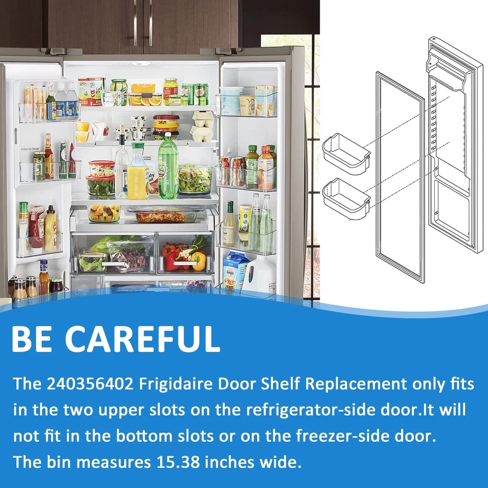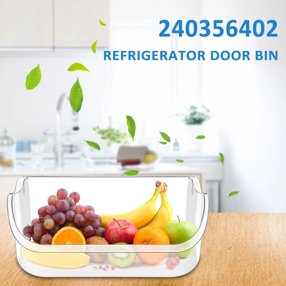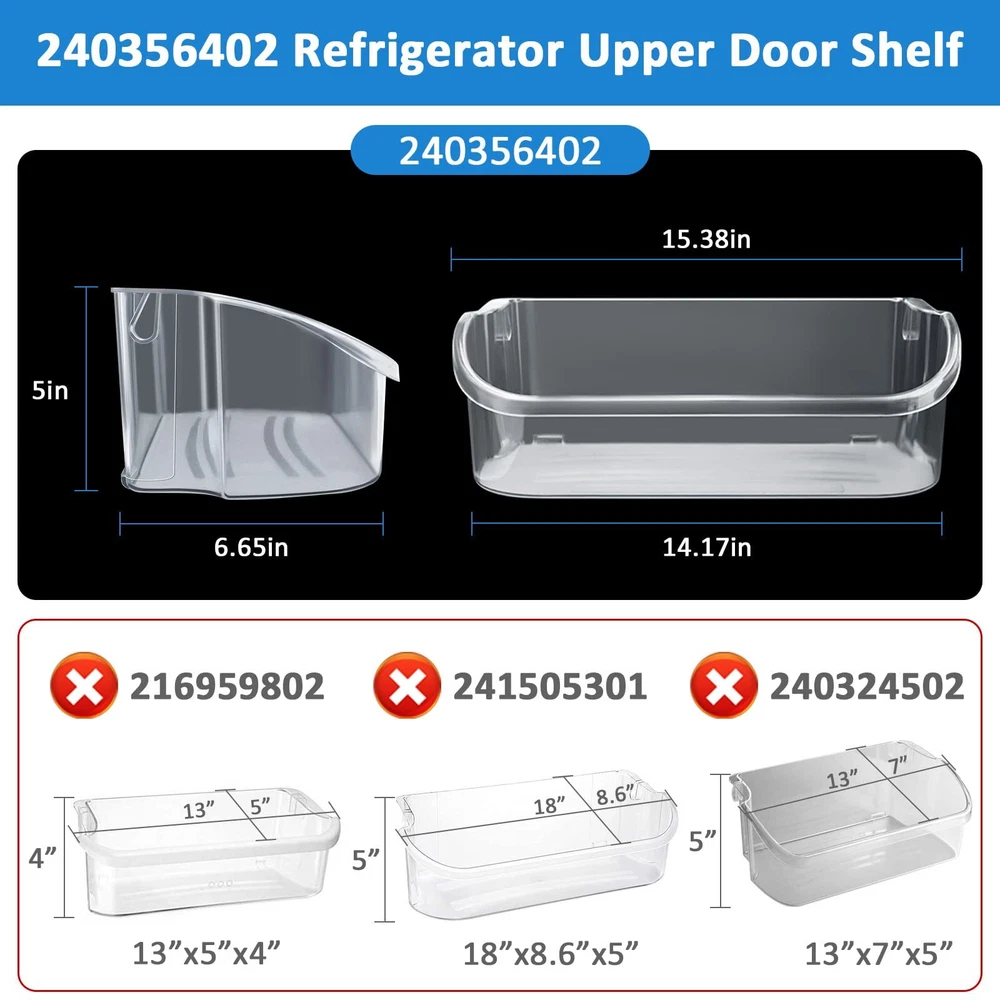 🍑product description: 1. Compatible models include: BGHS2634KE0, BGHS2634KE1, BGHS2634KE2, BGHS2644KF0, BGHS2644KF1, BGHS2644KF2, BGHS2634KP0, BGHS2634KP1, BGHS2634KP2, CRSE264FB0, CRSE264FB1, CRSE264FB3, CRSE264FQ0, CRSE264FQ1, CRSE264FQ3, CRSE264FSS0, CRSE264FSS1, CRSE264FSS3, CRSE264FW0, CRSE264FW1, CRSE264F, DGHS2634KB2, DGHS2634KE1, DGHS2634KE2, DGHS2634KP1, DGHS2634KP2, DGHS2634KW0, DGHS2634KW2, DGHS2644KF1, DGHS2644KF2, FRS6LC8FS1, FRS6LC8FS3, FRS6LC8FS4, FRS6LC8FS5 and more. 2. Works with most top name brands: Electrolux, Gibson, Crosley, Kelvinator, Westinghouse,,Tappan and others. 3. Specifications: Clear, upper door bin. Affixes to the interior of the refrigerator door. Package Approx. 15.5"L x 7.25"D x 5"H. 4. Note:These Refrigerator replacement parts are compatible spare parts (non-original) and the brand names mentioned above and any associated model names are only used to demonstrate compatibility.(Please contact us if there is any infringement) [240356402 Refrigerator Door Bin Size]: Length: 15.38 in, height: 5 in, depth: 6.65 in, only fits the top two shelves, before buying, please check the part number or measure the original size to ensure the shape and size are the same! This cannot replace 240324502 and 216959802 [Replace Part]: 240356402 door shelf replacement fit for Frigi-daire, Cro-sley, Ken-more, White Westing-house Refrigerator, replace PD00000402, 240356407, 240356408, 240356410,240356411, 240356413, 240356414, 240356415,240356416, 240430305, 240430307, 240430311,240430312, 241808205, 241808206, 241808221, 891214, AP2549958, PS430122, EAP430122, If you are not sure if it is the right shelves for you, please feel free to contact us and we will be happy to answer your questions [Premium Quality]: Our 240356402 refrigerator door bin is crafted from premium thickened food-grade resin, ensuring non-toxicity, safety, hygiene, and exceptional environmental friendliness. Designed to endure the daily rigors of refrigerator usage, this 240356402 bin boasts robust durability, making it less prone to breakage compared to transparent plastic materials [Easy to Install]: 240356402 frigi-daire door shelf replacement is easy to install, saves time and effort,If your shelf case has cracks, is damaged, or wants to add extra storage space to the refrigerator, you can replace parts of it. Just hang the refrigerator door shelf replacement on the refrigerator door.Easy to install, no tools required [Buy with Confidence]: The 240356402 Refrigerator door shelf bin supports no reason to return and exchange,We have a professional after-sales service team, if you have any question about this 240356402 Refrigerator door shelf replacement, please feel free to contact us through amazon email or question and answers, we will solve your problem within 24 hours. Don’t hesitate to solve the refrigerator problem easily