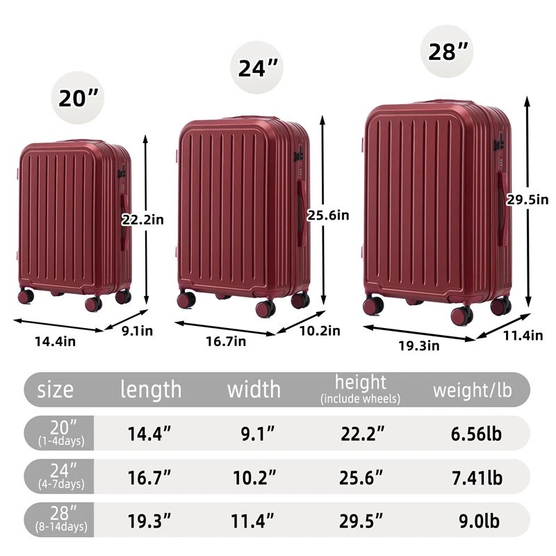 Features and Details: Durable & Waterproof: Our family suitcase set features sturdy watertight ABS external, which is easy to clean and long-term use. It can carry a large weight while having four swivel wheels that can move effortlessly in any direction. Built-in USB Port: The Carry-On features a built-in USB port, Type C port, provide quick connection to your portable electronic device for a quick charge.Not worried about the phone is out of power any more. Multifunctional Holder Design: Especially designed water cup holder, and the handle hook, all is to provide a comfortable and convenient travel experience. Retractable Handle: The ergonomically designed push-button 3-step adjustable telescopic handle makes opening and closing a breeze. What's more, it fits any size hand and reduces stress when climbing stairs. Modern Appearance: The stylish and smooth vertical stripe design of the rolling luggage makes it more resistant to pressure and wear and brings a good mood to your journey. It includes four molded side feet, they allow the luggage to remain upright even when standing on its side. Specification: Color: BroWINE RED Material: ABS Product Dimensions: 19.3"L × 11.4"W ×29.5"H Weight (lbs.): 22.96