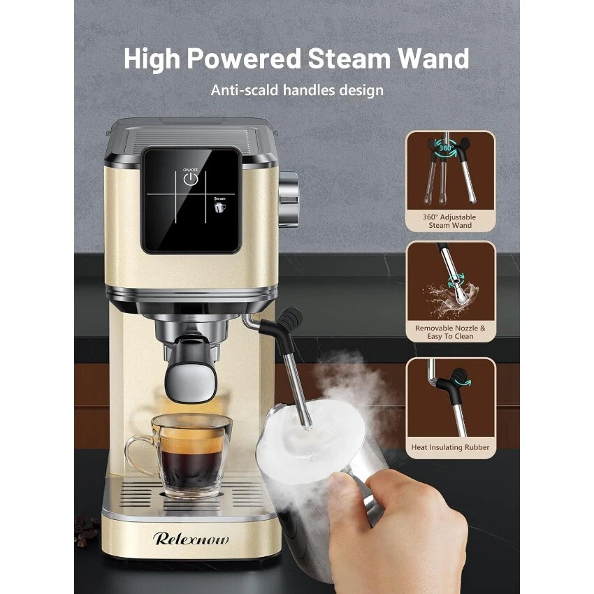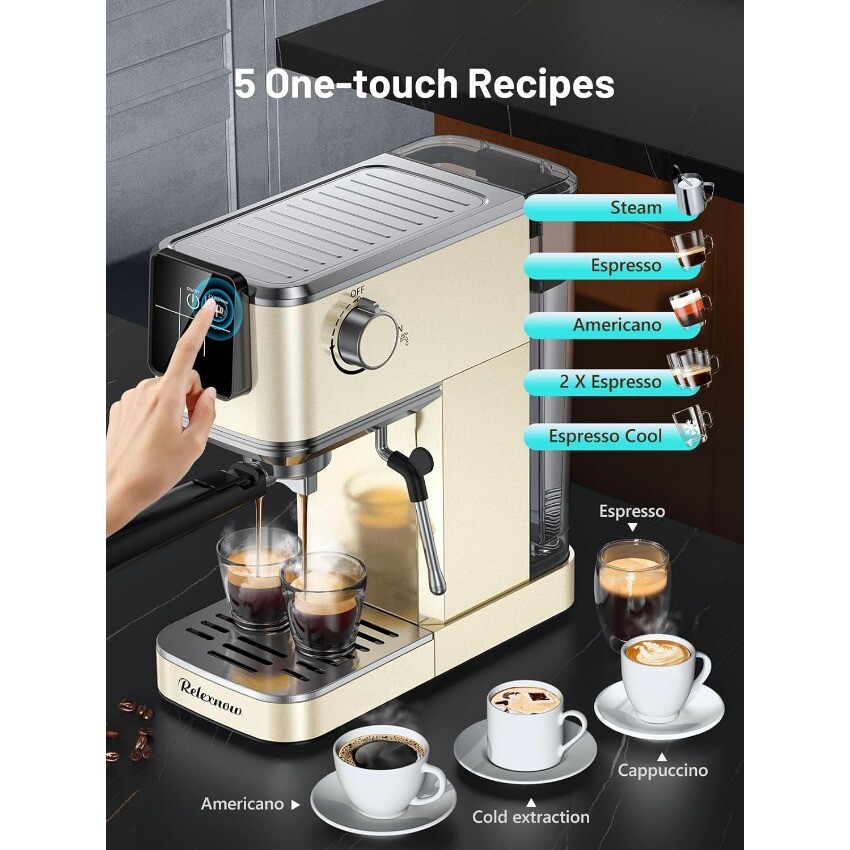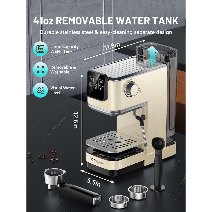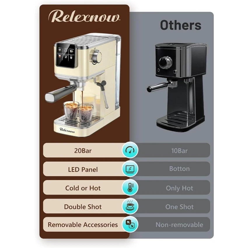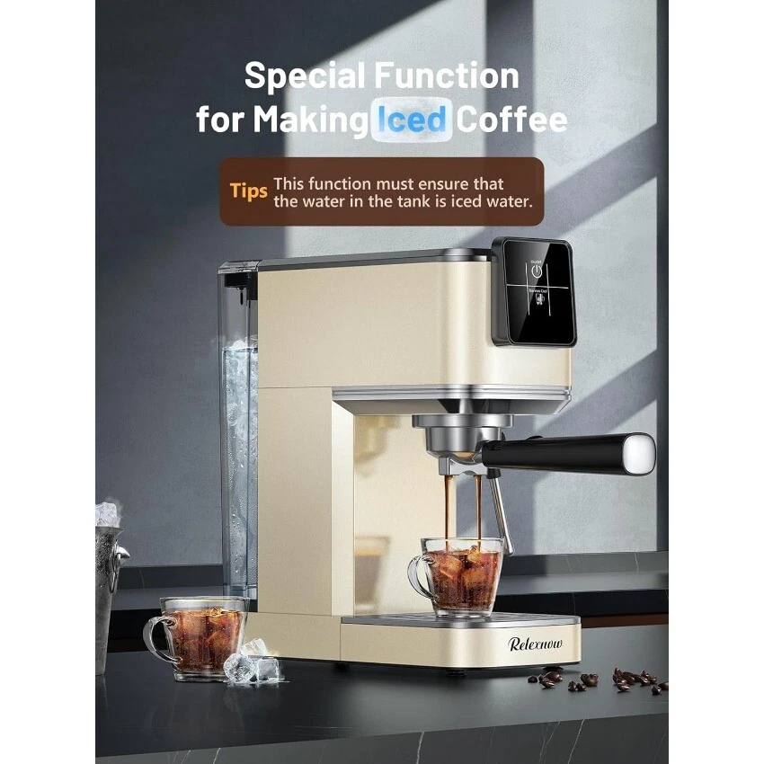 About this item Enjoy Espresso Coffee At Home: The RELEXNOW coffee machine with milk frother allows you to make all your favorite espresso-based coffees.You can enjoy a barista-brewed latte, cappuccino or macchiato at home.Stainless steel appearance, stylish and durable, ideal for any size kitchen.This compact espresso coffee maker is perfect for birthday presents, Christmas presents, mom presents, dad presents and wife presents. 20-Bar Pressure & Pre-infusion Extraction: With a 20-bar pressure system and a robust 1350W boiler, the coffee makers can extracts premium coffee.Craft your perfect brew, adjusting to your taste.The espresso machine's pre-infusion technology allows a small amount of water to moisten the coffee powder before coffee extraction, increasing the extraction area, and ensuring that each coffee powder is fully extracted. Hot & Cold Coffee Extraction: RELEXNOW espresoo coffee machine using unique cold extraction technology can allow you to enjoy cold coffee anytime.Just add ice water to the water tank and brew a cup of cold coffee in minutes. You could also make hot coffee such as Latte, espresso, or americano as you like. Powerful Steam System: The espresso coffee maker with frother features a powerful steam wand that quickly turns milk into silky smooth microfoam. Easily create café-quality, cappuccinos, and other espresso beverages,ideal for making delicious lattes and enhancing the flavor of your coffee. The removable froth nozzle makes the cleaning easily.Easily adjust the stainless steel steam wand turn the side button to create silky smooth froth. Satisfaction Guaranteed: Instruction manual included to ensure the recipient knows how to use it. We offer a 30-day money-back guarantee, free replacement within 1 year, and lifetime after-customer service from the date of purchase. So you can buy with confidence! 1---Please feel free to contact us through eBay Message ifrou have question,such as tracking number,shipping statusct.. 2---Please DON'T GIVE NEGARTIVE or NEUTRAL REVIEW or OPEN ANY CASES before contact us through ebay inbox. 3---Sometimes we may send small gift for you,please keep it if you get some gift from us.And hope you like it. 4---To offer best service,sometimes we will update the status of your order,please check your ebay inbox time by time. Anyway,thanks so much,enjoy shopping.