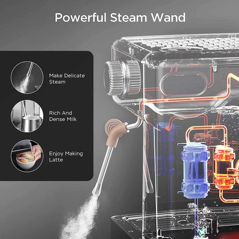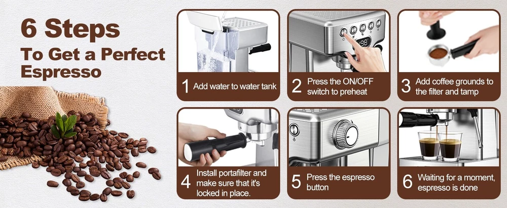 NOTE: Ocaasional water spots or stains found in the recieved product is considered normal, which is due to factory's water flow test, and is not qualified for a return/refund. 【PROFESSIONAL ESPRESSO MACHINE】This electric espresso maker has single shot and double shot, and the extraction will stop automatically when the right coffee strength is reached. And it has a strict temperature control system to make your coffee taste perfect. 【20 BAR PROFESSIONAL PUMP】20 bar high pressure extraction out of the quality coffee liquid filled with golden crema, making the espresso more aromatic and richer.Stainless steel boiler system makes espresso more fragrant and rich in crema. 【POWERFUL MILK STEAMER】Espresso machine with milk frother has steady steam wand turns milk into silky smooth microfoam. Latte machine is convenient for you to create latte, cappuccino, Mocha or plain white coffee art at home or office. Removable frothing nozzle makes cleaning easy. 【QUICK ON START SYSTEM】Espresso Machines 30s quick preheat and automatic stop when the desired amount of espresso is reached. Two independent thermostat controls adjust the temperature of the water and milk foam. 【ACCESSORIES & TIPS】Home espresso machine comes with: portafilter, double shots filter, single shots filter, scoop.Two cups of 60ml/ 2oz, about 14g/ 2 spoons powder for the best concentration.