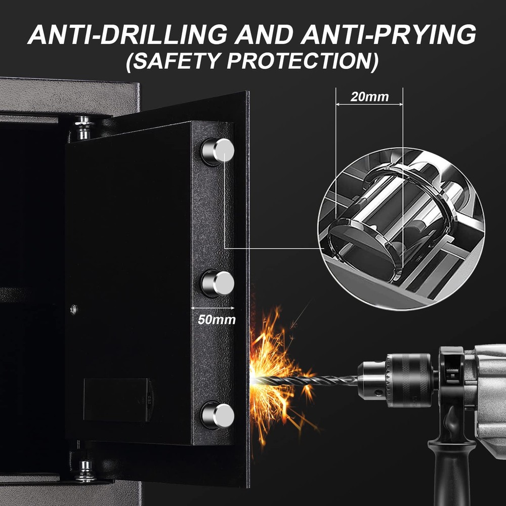 ✅STRONGER MATERIAL: safe box is made of the better solid steel, the surface has anti-corrosion and anti-wear powder coating. This security safe has a pry-resistant steel door and concealed pry-resistant hinges to offer you complete peace of mind. It ensures that your cabinet safe is stronger and more durable. If necessary, you can fix it on the wall or the ground. ✅RELIABLE LOCKING SYSTEM: Set a password of your own! The stronger solid steel structure makes it impossible for others to use violence to open it from the outside, only use the key or the password you set, the door will open. ✅BETTER CONFIGURATION: security box has the newest humanize design. There is a carpet inside the safe, which can prevent your valuables from being worn out. In addition, there is a plastic cover on the keyhole to confuse people who visit illegally. ✅NECESSARY ALARM SYSTEM: home safe has a good alarm system. 3 continuously wrong entries will activate the warning beep for 20 seconds. You can open the safe by key and remove the battery to stop the beeps. ✅SIZE AND PACKAGE: Exterior Size: 13.78"*12.99"*16.54". Interior size: 13.58"*12.8"*16.34" (Please pay full attention to the dimension for this smart safe box before you buy it). This size is very suitable for use for hotel, home, office safe. Package includes: 1*cabinet safe, 2*mounting screws, 2*keys, 1*user manual. ❗If you have any questions about the product, please feel free to contact us, and we will do our best to solve the problem for you.❗
