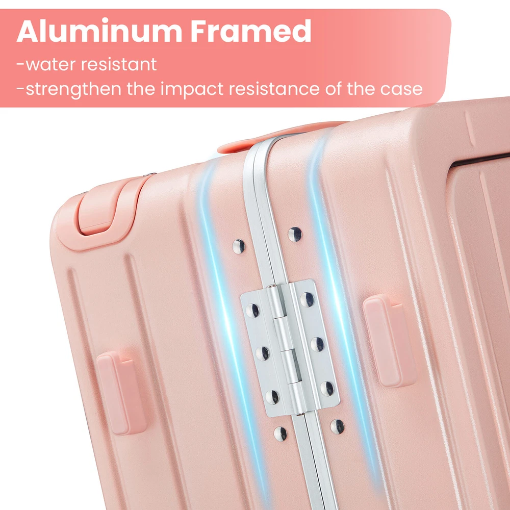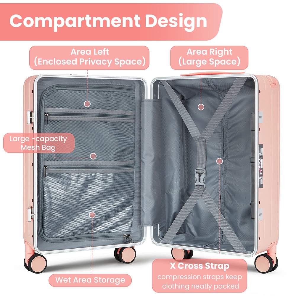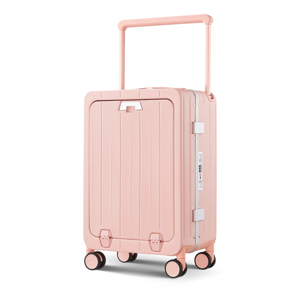 Specification Product Information Item Code:W2098P185053 Product Type:General Item Product Name:Aluminum Frame 20 Inch with Front Open Carry-on Luggage, PC Hard Shell Suitcase, Bounce Wide Handle Pull Rod Luggage with 360°Double Wheels, Built-In TSA Lock, Airline Approved Suitcase for Business Place of Origin:China Main Color:Pink Main Material:PC Product Dimensions Assembled Length (in.):Not Applicable Assembled Width (in.):Not Applicable Assembled Height (in.):Not Applicable Weight (lbs.):Not Applicable Package Size Length (in.):15.00 Width (in.):9.50 Height (in.):23.00 Weight (lbs.):12.00 Product Features 【Carry on Luggage Set include】1*Crossbody Bag (Black), 1*Cosmetic Bag (White), 1*Carry-0n luggage (20inch) 【PC and Aluminum Frame】Size:14.5 x 9.5 x 21.5 inch with 10.4 LBS. The luggage is made of PC material, which makes the suitcase more durable, lighter, impact-resistant and less scratchy. 【TSA Combination Lock】 TSA customs locks allow for more security and privacy during the journey, with the ability to perform non-destructive opening and inspection. 【Front Opening Compartment】This suitcase has a front compartment to categorize your computer or iPad and passport registry items for easy access, easy to separate electronic devices from clothing. 【Multiple Pockets】Luggage includes multiple pockets of varying sizes, including an integrated wetpak pocket for easy sorting and organizing your belongings. Making the travel easier. 【360°Double Wheels】The luggage rollers maneuver very smoothly whether the wheels are on the ground or airport floors. Reduced friction and shock absorption. 【Aluminum Frame & Wide Handle】This carry on luggage by Somago made from 100% new PC material, Meanwhile the hard shell luggage combined with luxury aluminum frame, providing ample usage space up to 98%, Multi-stage push button locking handle to adjust comfortably to any size traveler- three adjustable positions for convenient adjust it.