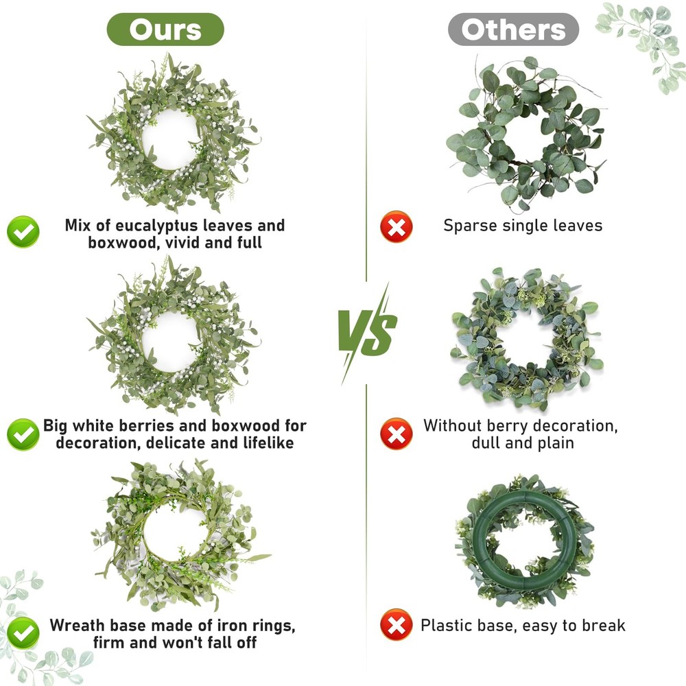 Green Eucalyptus Leaf Wreath, 20 Inch Artificial Spring Summer Wreaths for Front Door Decor Rich, Realistic Handmade Appeal Our hand - crafted eucalyptus wreath is truly something special! Packed with eucalyptus leaves, boxwood, and delicate white berries, it looks incredibly full and natural. It's so realistic, you'll feel like you've brought a piece of nature indoors. Its beauty will instantly brighten up your home, creating a warm and inviting atmosphere. Ideal Size and Gift - Worthy Measuring 20 inches in diameter, this wreath is perfect for any space. It comes in a sturdy, elegant box, making it an ideal gift for your friends. During shipping, it's compressed to keep it safe. But don't worry! Just give it a good stretch, and it'll reach its full, glorious size. Incredibly Versatile Decor This wreath is a decorator's dream! It's suitable for every season of the year. Add maple leaves for a touch of fall, or bells for a festive winter look. You can customize it however you like, and it'll always be the most unique piece in your home. Hang it on the wall, front door, porch, or in any room like the bedroom or living room. Whether it's an indoor or outdoor event, like a wedding or a party, this wreath will make a statement and impress everyone. Exceptionally Durable Crafted from top - notch materials, this wreath is built to last. The colors won't fade over time, the leaves won't fall off, and the berries won't rot. There's no need for watering or any special cleaning. You can enjoy its beauty for years to come, without any hassle. We're Here to Help If you have any issues with our product, don't hesitate! right away, and we'll get back to you as soon as possible. Your satisfaction is our top priority. 【Rich, Realistic Handmade Appeal】Our hand - crafted eucalyptus wreath is truly something special! Packed with eucalyptus leaves, boxwood, and delicate white berries, it looks incredibly full and natural. It's so realistic, you'll feel like you've brought a piece of nature indoors. Its beauty will instantly brighten up your home, creating a warm and inviting atmosphere 【Ideal Size and Gift - Worthy】Measuring 20 inches in diameter, this wreath is perfect for any space. It comes in a sturdy, elegant box, making it an ideal gift for your friends. During shipping, it's compressed to keep it safe. But don't worry! Just give it a good stretch, and it'll reach its full, glorious size 【Incredibly Versatile Decor】This wreath is a decorator's dream! It's suitable for every season of the year. Add maple leaves for a touch of fall, or bells for a festive winter look. You can customize it however you like, and it'll always be the most unique piece in your home. Hang it on the wall, front door, porch, or in any room like the bedroom or living room. Whether it's an indoor or outdoor event, like a wedding or a party, this wreath will make a statement and impress everyone 【Exceptionally Durable】Crafted from top - notch materials, this wreath is built to last. The colors won't fade over time, the leaves won't fall off, and the berries won't rot. There's no need for watering or any special cleaning. You can enjoy its beauty for years to come, without any hassle 【We're Here to Help】If you have any issues with our product, don't hesitate! right away, and we'll get back to you as soon as possible. Your satisfaction is our top priority