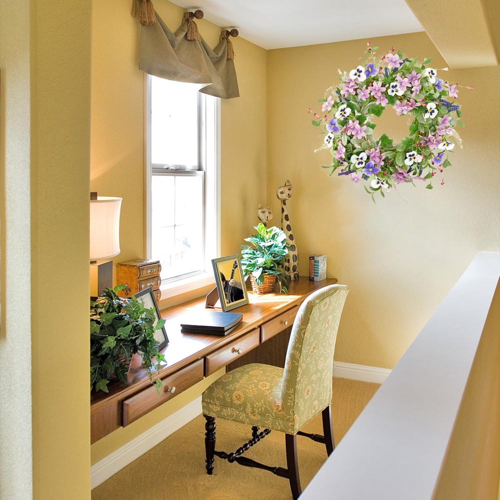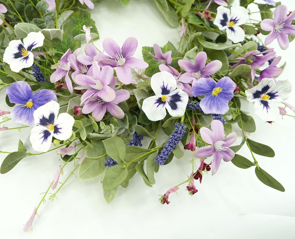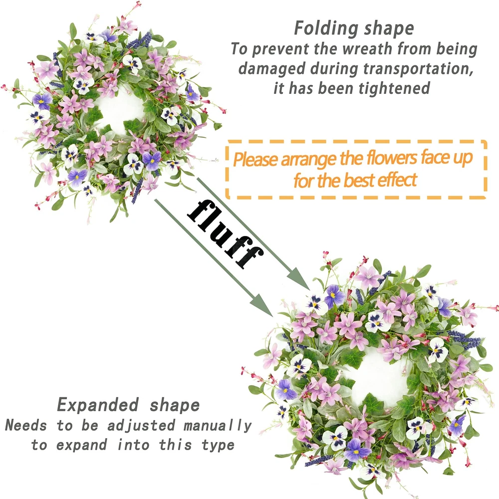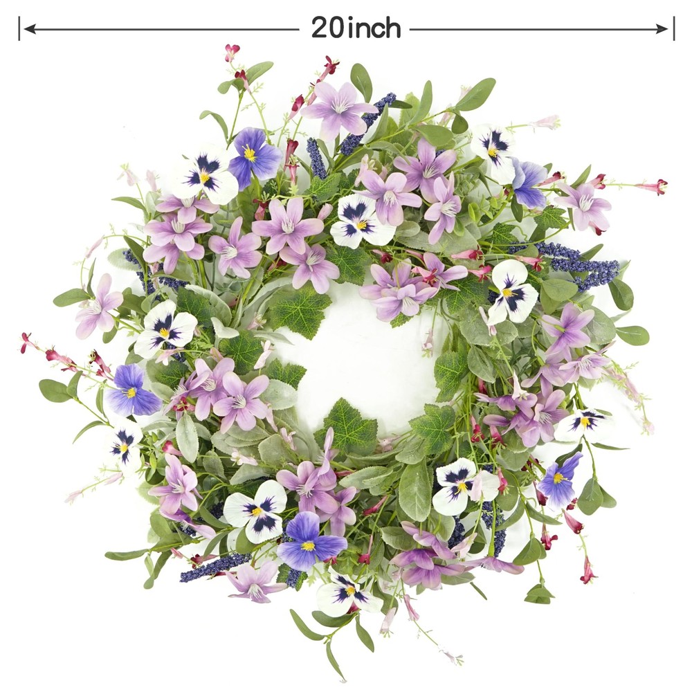 spring wreaths for Front Door Indoor Outdoor Farmhouse Porch Wall Holiday Window Decoration ADJUST WREATH SHAPE : branches of the spring summer wreath are made of bendable wire, so you can shape things as you go, and keep monkeying with them until you make it look just as you want. Please adjust or bend the branches on the wreath and arrange the pansy flower heads upward for best display.,the maximum size of wreath can be 20". VERSATILE DECOR:This spring summer floral wreath is suitable for front door, wall, indoors,outdoors,window,fireplace,farmhouse, living room, porch, centerpiece party, wedding, holiday and festival celebration. It will provide your home a feeling of natural and vatality. BEST FRIENDS FOR spring summer wreath : Suitable for spring, wedding, home, wall, window, front door, fireplace, living room, bedroom, dining room, fireplace, porch, window and other indoor and outdoor decoration. Add glamour to your spring and summer season with this striking pansy and lavender wreath. EASY CLEAN: The handmade wreath is convenient to clean, just wipe it with a try towel to make the wreath like brand new. The green leaves and branches are not easily falling apart. This wreath can be used for a long time. PACKAGING DESIGN: we pack the wreath to gift box and we Tighten the wreath when packing so that the wreath can be protected when delivery,pls open and fluff the wreath and adjust the branches,flowers, the maximum size of wreath can be 20".