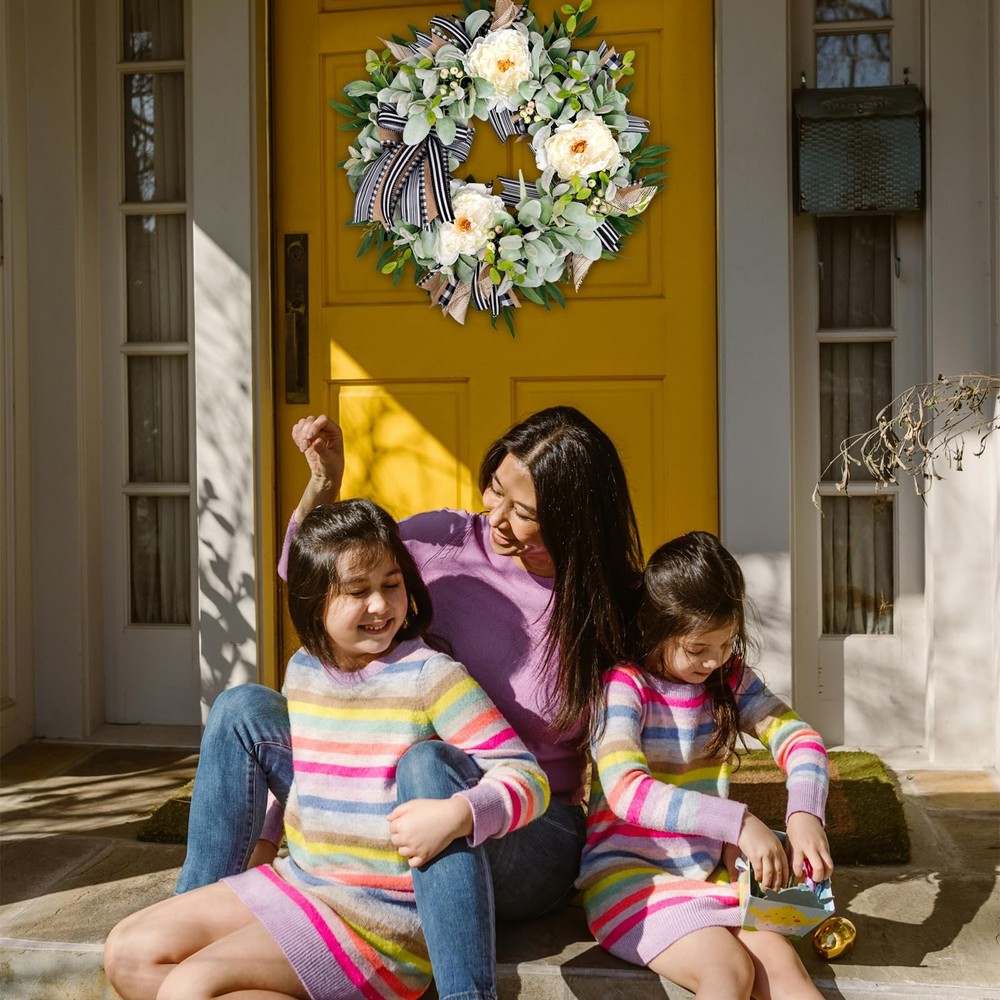 This handcrafted premium peony wreath brings the beauty of nature into your home, perfect for year-round display with a unique and elegant style. Featuring three large, realistic white peonies, delicate berries, and soft lamb’s ear leaves, this wreath front door creates a rich, layered look that perfectly balances simplicity and sophistication. The classic black-and-white buffalo plaid bow adds a touch of modern charm, making it a focal point in any setting. Whether celebrating a holiday, enhancing your front door décor, or adding ambiance to special occasions, this door wreath brings warmth and elegance to your space. Ideal as wreaths for front door, this versatile design fits seamlessly with any season or home style. Perfect for spring wreaths for front door, it can also be displayed year-round, making it a standout front door wreath for all seasons. Whether used as a winter wreath, lamb's ear wreath, or farmhouse wreath, it complements your décor beautifully. This artificial wreath is designed for both indoor and outdoor wreath use, making it a perfect door wreath for front door outside. Lambs Ear Wreaths for Front Door All Season:Enhance your home with the unique beauty of nature. This handcrafted wreath brings a touch of elegance with a design that’s perfect for every season. Not only ideal for holidays and seasonal décor, but it’s also a wonderful accent to brighten everyday spaces. Bring this stunning wreath home today High-quality Materials: Featuring three large, realistic white peonies, delicate berries, and lush lamb’s ear leaves, this wreath offers rich layers and a unique design that showcases the refined beauty of nature Artificial Spring Summer Farmhouse Wreath: A classic black-and-white buffalo plaid bow adds a stylish, timeless touch, making this wreath versatile for various settings Front Door Wreath for Home Decor:Whether displayed on your front door, in the living room, porch, fireplace, dining room, or for special occasions like Thanksgiving, Birthdays, Mother's Day or Christmas, this wreath effortlessly elevates any space Gift Box:It arrives in gift-ready packaging and is an excellent gift choice. Just adjust the lamb’s ear leaves and bow upon receiving for the perfect look