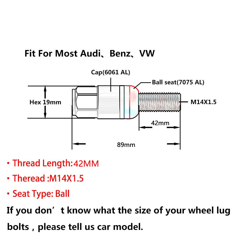 20PCS M14x1.5 Wheel Lug Bolts with 42mm Shank Length Ball Seat, Compatible A3 A4 A6 A8 S4 S6 S8 TT Jetta Allroad VW Quattro Golf Tiguan Passat and Most Ben.Z Feature: 【Application】: Fit For Most A.udi、VW、B.enz With Ball M14X1.5 【High Performance Material】 : Forged 35CrMo material and aircraft grade aluminium material,12.9Grade Heat Treated, avoid the problem of original bolt expansion and cracking 【Seat-Floating design】 :avoid the problem of hub assembly and hub misalignment 【Precise Specification】: M14x1.5 Thread Pitch|17mm Hex|42mm Shank|Ball Seat|89mm Length|Use Hand Wrench 【Rigorously Tested】: These wheel studs follow the factory bolt shape. These wheel bolts have passed proof load, salt spray, hardness and thread testing and meet the strict standards. High temperature resistance, can be repeatedly.