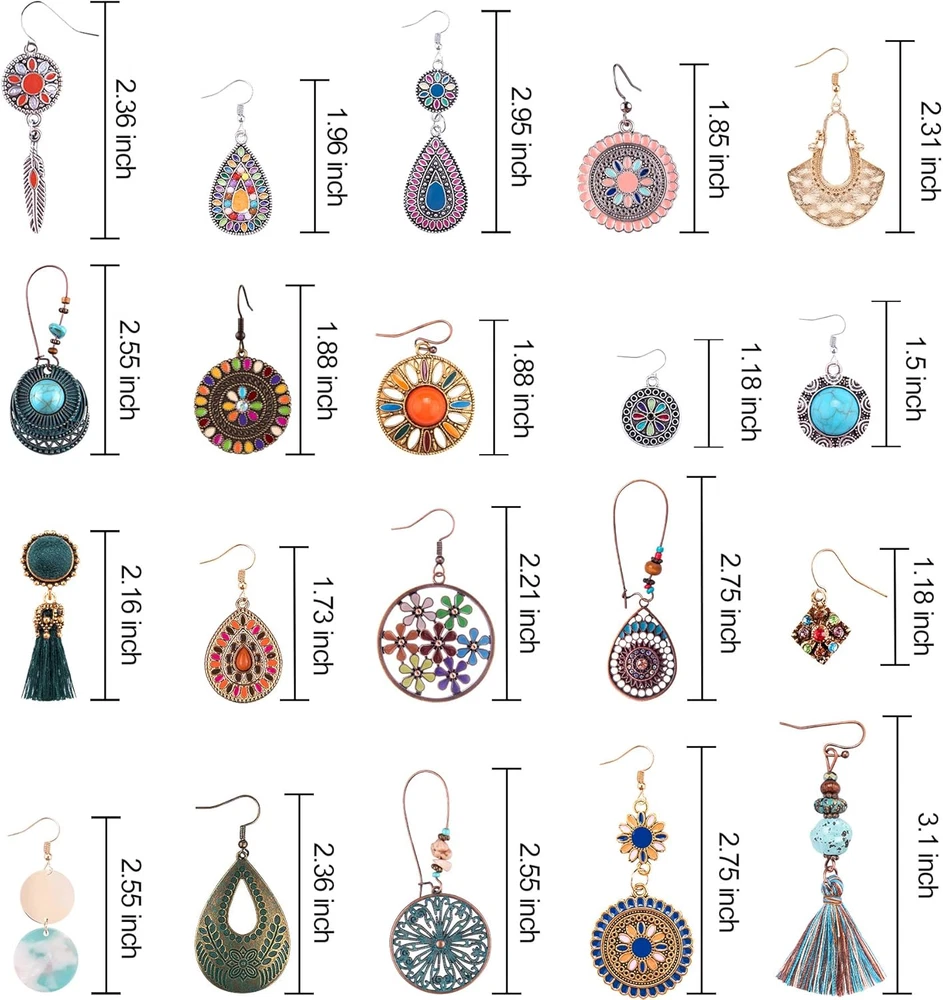 Store New Arrivals Add to Favorite View Feedback Contact Fast deliveries to the customer's home Quality customer service John Make the customers happy! 20 Pairs Bohemian Earrings Vintage Drop Dangle Earrings Boho Earrings Set Statement Earrings Alloy Long Boho Dangle Earrings for Women Description Product Description Style Elegant Gem Type No Gemstone Material Acrylic Metal alloy Model number DE-22-151 Back finding French Wire Number of stones 20 Clasp Lobster Clasp ABOUT US We offer the best prices around on high quality products. Our E-store includes media such as books, movies, music and games while offering electronics, toys, sporting apparel, clothing, tools, general home, garden items and more. SHIPPING We are always working hard to ensure your package arrives as soon as possible. Please understand that some factors like weather, high postal traffic, and the performance of shipping companies are outside of our control. We offer free shipping to the lower 48 states and ship within 2 business days of payment, usually sooner. We do not accept P.O. Boxes. Please provide a physical address. For shipping outside of the continental USA, we only use eBay's Global Shipping Program. The item is shipped to KY and then sent to the rest of the world. International customers are responsible for all duties and taxes. Continue to 'check out' to calculate costs for shipping the item to your country. Messages regarding eBay's Global Shipping Program MUST be directed at eBay EXCLUSIVELY. RETURNS We offer a 30-Day Return Policy on items in which you are not completely satisfied with. You have the option of a full-refund or an exchange of the item. No returns are available on items shipped outside of the USA PAYMENT We accept PayPal. CONTACT US This page content is yet to come Please ad us to your favorite seller and visit again later Thank You CUSTOMER SATISFACTION We try our very best to make sure every customer is completely satisfied. If there's a problem, message us! We're happy to help. WE ACCEPT
