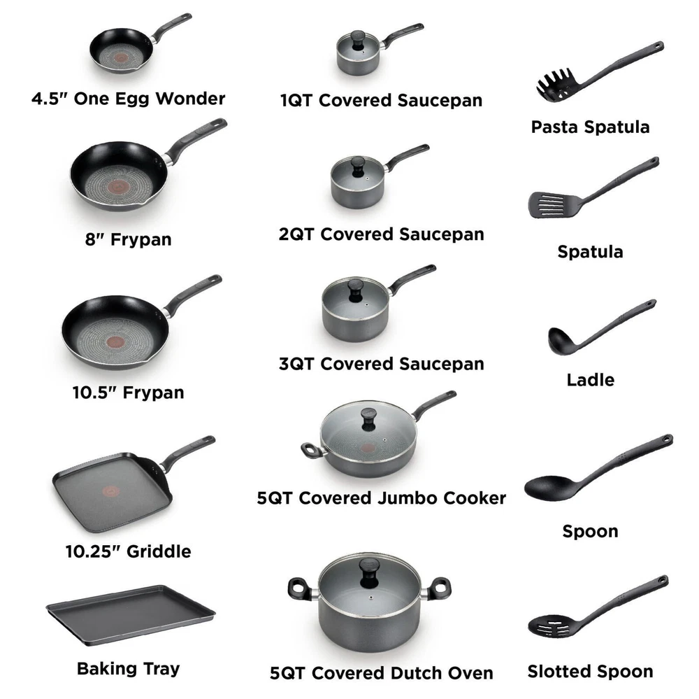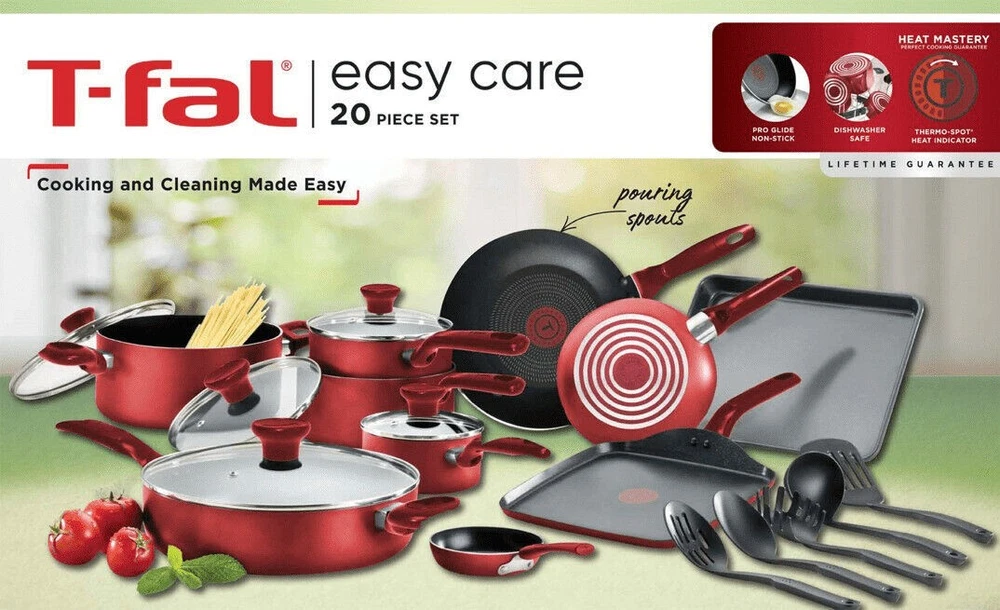 You may also like 12-Piece Pots Pans Cookware Set Nonstick Toxin-Free Ceramic Dishwasher Safe NEW 117.56 USD 123.75 USD Free shipping 5% off 12pcs Nonstick Aluminum Cookware Set Fry Pan Saucepan Dutch Oven Bakeware Green 93.72 USD 98.65 USD Free shipping 5% off Stainless Steel Cookware Set 14 Pc Induction Compatible Dishwasher Safe Kitchen 112.75 USD 118.68 USD Free shipping 5% off 10 Pcs Clean Ceramic Nonstick Cast Aluminum Cookware Set W/ Heart Knobs Durable 93.81 USD 98.75 USD Free shipping 5% off 12-Piece Toxin-Free Nonstick Cookware Set Dishwasher Safe Durable Easy Cleanup 135.28 USD 142.4 USD Free shipping 5% off 12 Pc Non Stick Cookware Set Pots Pans W/ Lids Handles Cooking Tools Kitchen New 94.92 USD 99.92 USD Free shipping 5% off 7 Piece Nonstick Cookware Set Carbon Steel W/ Glass Lids & Bakelite Handles New 47.5 USD 50.0 USD Free shipping 5% off 12 Piece Non-Stick Cookware Set Aluminum Ceramic Kitchen Cooking Essentials New 143.34 USD 150.88 USD Free shipping 5% off 10 Piece Nonstick Cookware Set Dishwasher Safe Riveted Cool Handles Glass Lids 75.0 USD Free shipping 18 Piece Nonstick Cookware Set Kitchen Essentials Dishwasher Safe Utensils Red 59.34 USD 62.46 USD Free shipping 5% off Nonstick Cookware Set 14 Piece Soft Grip Handles Straining Lids Even Heat Base 94.86 USD 99.85 USD Free shipping 5% off 10 Pcs Non Stick Ceramic Cookware Set Aluminum Pots & Pans Dishwasher Safe New 84.22 USD 88.65 USD Free shipping 5% off Cooking and cleaning made easy with T-fal easy care nonstick 20 piece set, ensuring reliable results when preparing meals for the whole family. Includes 4.5" one egg wonder, 8" fry pan with pouring spouts, 10.5" fry pan with pouring spouts, 10.25" griddle, 5 qt jumbo cooker with glass lid, 1 qt saucepan with glass lid, 2 qt saucepan with glass lid, 3 qt saucepan with glass lid, 5 qt stewpot with glass lid, baking tray, pasta spatula, spatula, ladle, spoon, and slotted spoon. Pro-glide non-stick interior ensures easy food release, and enables healthy cooking with little to no oil. Features comfortable handles and vented tempered glass lids. PROGLIDE NONSTICK COOKWARE INTERIOR: Easy release and cleanup every time THERMO-SPOT TECHNOLOGY: Unique heat indicator that turns solid red to show when pots and pans are properly preheated to start cooking EVEN HEAT BASE: No hot spots for reliable cooking results COMFORTABLE HANDLES: Sturdy and secure grip POURING SPOUTS: Extra convenience in the kitchen MEASURING MARKS: Helps save time VENTED TEMPERED GLASS LIDS: Maintain visibility while trapping heat and moisture DISHWASHER AND OVEN SAFE: Up to 350°F ALL COOK TOPS COMPATIBILITY: Excluding Induction LIFETIME LIMITED GUARANTEE You may also like 6ft Prelit Artificial Slim Pencil Christmas Tree with Remote Control Hinged 98.7 USD 103.89 USD Free shipping 5% off Corner Shower Caddy Tension Pole 4-Tier Rustproof Adjustable Storage Rack Duty 61.74 USD 64.99 USD Free shipping 5% off Stylish Coffee Table Space Saving Durable Indoor Furniture Living Room Durable 47.4 USD 49.89 USD Free shipping 5% off 8A Belt Sander 380RPM Variable Speed 5 Sanding Belts Dust Bag Stock Removal New 61.74 USD 64.99 USD Free shipping 5% off 2000lm COB LED Work Light Rechargeable Magnetic Hands Free Waterproof Battery US 40.53 USD 42.66 USD Free shipping 5% off Single Burner Propane Stove Compact Portable Camping Kitchen Backpacking Outdoor 29.65 USD 31.21 USD Free shipping 5% off Heavy Duty Adjustable Metal Shelving Unit 5 Tier Storage Rack 2000 lbs Capacity 54.52 USD 57.39 USD Free shipping 5% off 11X4-5 Smooth Lawn Garden Tire 4PLY All Season Radial Off Road ZTR Mower New 36.85 USD 38.79 USD Free shipping 5% off 12-Piece Toxin-Free Nonstick Cookware Set Dishwasher Safe Durable Easy Cleanup 135.28 USD 142.4 USD Free shipping 5% off 16" Round Water Hyacinth Woven Tray W/ Handles Tan Lightweight Sturdy Home Decor 178.91 USD 188.33 USD 19.99 USD 5% off Orthopedic Plush Pet Bed Dog Cat Non Skid Sofa Design Egg Crate Foam Support New 35.54 USD 37.41 USD Free shipping 5% off 76" x 25" Camping Cots Sleeping Bed Folding Portable Lightweight Travel Outdoor 93.24 USD 98.15 USD Free shipping 5% off