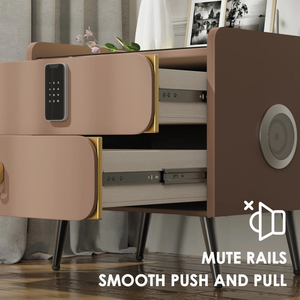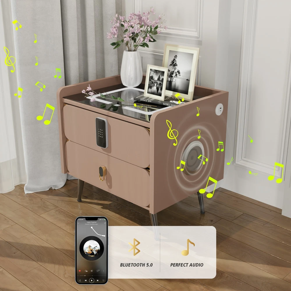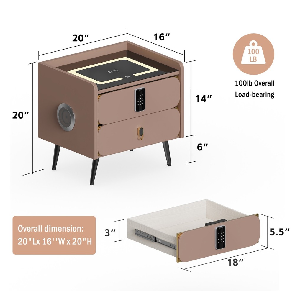 20" Tall Smart nightstand with combination lock &Bluetooth player(Light coffee) Features Smart nightstand: The smart nightstand uses a tempered glass desktop, which is not only wear-resistant and scratch-resistant; but also easy to clean. The soft sliding drawer design provides ample space to organize items and keep them tidy. With USB and TYPE-C ports and wired charging: The nightstand’s charging function with USB and Type-C ports and wireless charging makes it easy for you to charge mobile devices such as phones, tablets, readers, and more. (Only supports charging mobile phones with built-in wireless charging function). Secure combination lock: Simply set a digital password before storing and you can keep your personal belongings safe. Bluetooth speakers: There are Bluetooth speaker players on both sides of the nightstand. You only need to connect your smartphone to the speaker via Bluetooth, and you can easily enjoy wonderful music before falling asleep at night. LED 3-color adjustable light: The nightstand comes with 3-color LED (warm/cool/natural), you can adjust the lighting effect with just one touch button, you can adjust the light to suit the room as needed. No assembly:The nightstand is fully assembled before delivery and can be used without installation! Dimensions and load-bearing capacity: the nightstand is 20 inches long, 16 inches wide,20 inches high, and weighs 31 pounds. The top can bear a load of 90 pounds. Other Dimensions Legs 6'' H Overall 14'' H X 16'' W X 20'' D Drawer Interior 3'' H X 18'' W X 16'' D Overall Product Weight 31 lb. Tabletop Thickness 2'' Details Frame Material Solid + Manufactured Wood Top Material Solid + Manufactured Wood, Stainless Steel, Tempered Glass Drawers Included Yes Number of Drawers 2 Drawer Glide Type & Extension Soft Close, Metal Slide Interlocking Drawers Yes Handle Material Metal Gloss Finish Yes Lighting Included Yes Compatible Bulb Type LED Finished Back No Plug-In Yes Smart Enabled Yes Smart Home Hub Compatibility Bluetooth Natural Variation Type Natural Wood Grain Color Variation, Natural Stone Color Variation Built-In Electrical Outlet Yes Imported Yes Durability Water Resistant, Slip Resistant, Chip Resistant, Shatter Resistant, Fray Resistant Shape Rectangular Tabletop Weight Capacity 90 lb. Product Care Wipe clean with a dry cloth, Do not use harsh chemicals or cleaners, Do not use any cleaning agents, Do not put removable parts in dishwasher Integrated Wireless Charging Surface Yes USB Powered Yes Handle Finish Metal Finish Lockable Yes Manufactured Wood Type MDF Wood Species Pine Bulb Included Yes Assembly Assembly Required No Payment Delivery details Terms of sales About us Contact us Payment You could make payment via: Delivery details Packages will ship via by UPS or USPS within our handling time,once the package is shipped out ,normally shipping takes about 3-10 working days,but due to different cities and states,shipping time will be different. Terms of sales If you any problem about shipping information, or the item you got : Arrived damaged; Wrong item sent; Missing parts or pieces; Doesn't work or defective; Doesn't match description or photos. Pls click "Contact Seller" and send us message firstly. Then we could have a check and will take responsibility to resolve the problem with you in good communication. About us Our company specializing in selling all kinds of light fixtures,such as ceiling fans,chandeliers,crystal lights,retro lamps,pendant light,etc. If there's any light fixture you are interested,pls feel free to contact us for more details. Contact us Normally your message will be replied in 1 business day,If after 24 hours you do not receive our reply,please kindly re-send us the message,because sometimes ebay message system will have technical problem,so your message can't send to us successfully.