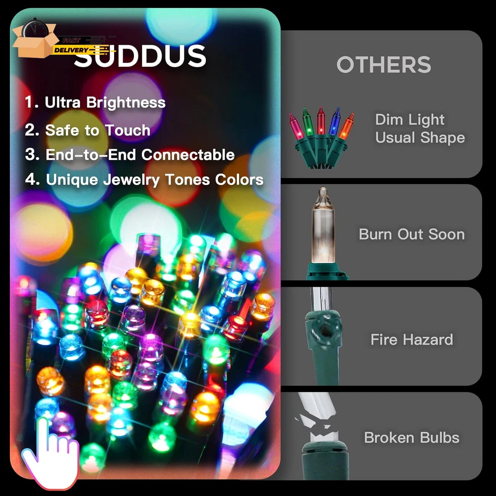 Store New Arrivals Add to Favorite View Feedback Contact 200 LED Multicolor Christmas Lights, 8 Modes Blinking Christmas Tree Lights with Remote, Colored Christmas String Lights for Outdoor Indoor Party Decoration Description Item model number SDSW-200MC Light Source Type LED Style Modern Number of Items 1 Power Source Corded Electric Number of Light Sources 200 Control Method Remote Theme Jewelry,Christmas Style Number SDSW-200MC Controller Type button,remote Wireless Communication Technology Infrared Occasion Type Easter, Wedding, Christmas, Halloween, Thanksgiving Seasons winter Additional Features Corded Package Dimensions 7.13 x 4.06 x 3.74 inches; 1.1 Pounds Indoor/Outdoor Usage Outdoor, Indoor Material Type Plastic, Rubber Light Color Multicolor Water Resistance Level Waterproof Item Weight 0.5 Kilograms Occasion Easter, Wedding, Christmas, Halloween, Thanksgiving Special Feature Corded Color Multicolor Indoor Outdoor Usage Outdoor, Indoor Voltage 120 Volts Included Components Remote Style Name Modern Size 200 LED π[Long Length and END-TO-END]: 200 LED multi colored Christmas Lights 66ft long, plus a 10ft extension cord. The updated mini outdoor Christmas lights are end-to-end connectable. It could be extended to a maximum of 6 light strings (total 396ft/1200led). Choose more than one, these extra-long strings of lights can be used to decorate any big scene you want. Just need 1 remote to control all lights and 1 socket for electricity. π[Super Bright and 4 Brightness Levels]: Super brightness Christmas tree lights to give your Christmas decoration icing on the cake. Both day and night, it is particularly conspicuous. The Christmas lights have 4 brightness levels, you just need to press the dim +/- button on the remote for settings of 100%, 75%, 50%, or 25%. π[5 Gorgeous Colors and 8 Modes]: SUDDUS blinking christmas lights have five unique colors: lime green, aquamarine, rose, ruby, and orange. SUDDUS exclusive multi-color Christmas lights have 5 superior jewelry tones colors, and higher quality. This 200led colored Christmas lights have 8 lighting modes: steady on and 7 flashing modes (comb, in waves, sequential, slo-glo, chasing/ flash, slow fade, and twinkle/ flash). Creating a colorful and twinkling dream world for you. π[Waterproof and Safety]: IP44 Christmas string light is waterproof (Both the plugs and end-to-end connectors have caps to block the ingress of water), suitable for indoor and outdoor decorations, including trees, pathways, garlands, houses, roofs, balcony, party, porch, garden and anywhere. UL588 safety-certified Christmas lights come with 3 strands of wires, which can withstand long working times. So it will be more durable. It will not have an overheating problem. Save to touch any time. π[Remote Control and Timer Function]: The range of the remote control is 32ft. With a wireless remote, you donβt need to walk across your yard to control the lights. The updated XMAS lights have 3 different Timer Functions to meet your various needs. When you press this button, you can free your hands and it will work functionally. Product Description Holiday Joy Shines Brightest with Festive Christmas Lights! The video showcases the product in use. The video guides you through product setup. The video compares multiple products. The video shows the product being unpacked. The colorful and twinkling lights bring joy to children and families, often becoming a source of wonder and excitement. Christmas lights are not just decorations; they become a backdrop for family photos and cherished memories. A Tree Filled with Kids' Holiday Delight Christmas Comfort Begins at the Fireplace's Glow Make Your Home's Yard the Talk of the Town From lawn to porch, create a merry winter wonderland with SUDDUS Christmas Lights! A well-decorated Christmas yard becomes a visual focal point in the community, drawing the attention of neighbors and passersby. It becomes a beacon of holiday cheer and celebration. IP44 Waterproof No matter what the weather, this Christmas light can work normally. Perfect for Christmas trees, garden decorations, balconies, shrubs, and fences. Safe to Touch It is safe to touch it at any time, do not worry about overheating. The light comes with 3 strands of wires, which can withstand a long working time. 8 Modes Christmas lights have 8 lighting modes: 1 steady on and 7 flashings. The memory function of the remote control can remember the last mode you set. 3 Timer 6: 6hr on, 18hr off. 8: 8hr on, 16hr off. 6639: 6hr on, 6hr off, 3hr on, 9hr off, every 24 hours Limitless Creativity with Connectable Christmas Lights! Whether you're decorating a vast garden, an expansive front yard, or creating a breathtaking holiday scene within your home, connectable Christmas string lights provide the flexibility and adaptability you need to bring your creative ideas to life. SUDDUS CHRISTMAS LIGHTS Add to Cart Add to Cart Add to Cart Add to Cart Add to Cart Add to Cart Add to Cart Customer Reviews 4.5 out of 5 stars 460 4.3 out of 5 stars 8 4.4 out of 5 stars 583 4.5 out of 5 stars 703 4.4 out of 5 stars 6,521 4.3 out of 5 stars 685 4.3 out of 5 stars 3,159 Price $29.99 $ 29 . 99 $24.99 $ 24 . 99 $29.99 $ 29 . 99 $24.99 $ 24 . 99 $14.99 $ 14 . 99 $18.99 $ 18 . 99 $15.98 $ 15 . 98 Power Source Plug in Plug in Plug in Plug in Battery Battery USB Color Multicolor Multicolor Warm White Warm White Warm White Warm White Warm White LED Quantity 200 LED 360 LED 200 LED 100 LED 200 LED 100 LED 200 LED Connectable YES YES YES YES NO NO NO Special Features Unique Light Color Unique Light Color Diamond-Shape Led Bulbs Clear Wired Strand Flexible Copper Wire Globe Shape Bulb Vertical Waterfall Lights ABOUT US We offer the best prices around on high quality products. Our E-store includes media such as books, movies, music and games while offering electronics, toys, sporting apparel, clothing, tools, general home, garden items and more. SHIPPING We are always working hard to ensure your package