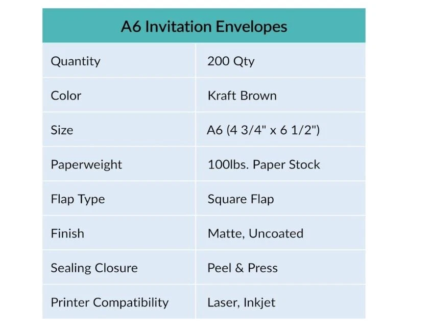 200 Pcs A6 Invitation Envelopes in Brown Kraft Peel & Seal Self-Seal 4 3/4 x ... Color Brown Kraft Closure Type Self-Seal Occasion Graduation Material Paper About this item 200 Pcs A6 Invitation Envelopes 4x6 Greeting Cards Envelopes Self Seal in Brown Kraft Come in A Nice Sturdy White Cardstock Storage Box. Box help you nice to keep on the shelf. The A6 square flap envelope is easily sealed by a Peel & Press strip located on the back flap. For social and invitation purposes, the A6 is also an ideal large reply envelope size as it easily fits inside A7, A8, A9 and A10 size envelopes. Material: A6 Invitation Envelopes are Crafted from 148 GSM / 100 lbs Text Paper, A6 Note Envelopes are thick enough to protect documents inside and not see through.Have tape with self-adhesive strip located on the back square flap, it is very convenient that they come with the adhesive strip so you do not have to lick or wet the envelope to close.The Blank Envelopes perfect for making homemade envelopes by painting and decorating. A6 announcement envelopes measure 4.75" x 6.5". A6 envelopes self seal are easy to use, the perfect size and sturdy enough to protect 4x6 treasured photo paper, 4x6 cards, postcards, 4 x 6 thank you cards, greetings cards, holiday cards, response cards, save the date cards, RSVP cards, gift cards, notes, invitations, letters, announcements, mailings, business applications and more. They are reply envelopes. They fit inside standard letters as well as envelopes which size of A7, A8, A9 and A10. Color: A6 Greeting Cards Envelopes Bulk feature an rustic texture and look in brown paper. Beautiful brown color perfect for lettering and will give a perfect low-key and natural feel to invitations you're sending out. A6 Invitation Envelopes perfect match for all occasions whether playful or formal. Featuring in brown kraft paper, A6 Self Seal Envelopes looks so earthy and natural that perfect match any theme occasions.For social and invitation purposes, A6 Envelopes stationery perfect for any formal invites, weddings, baby shower, wedding shower, bridal shower, baby announcement, pregnancy announcements, birth announcement, graduation announcements, business, banquets, birthday, holiday party, thanksgiving, bridal shower, graduation, and corporate events.