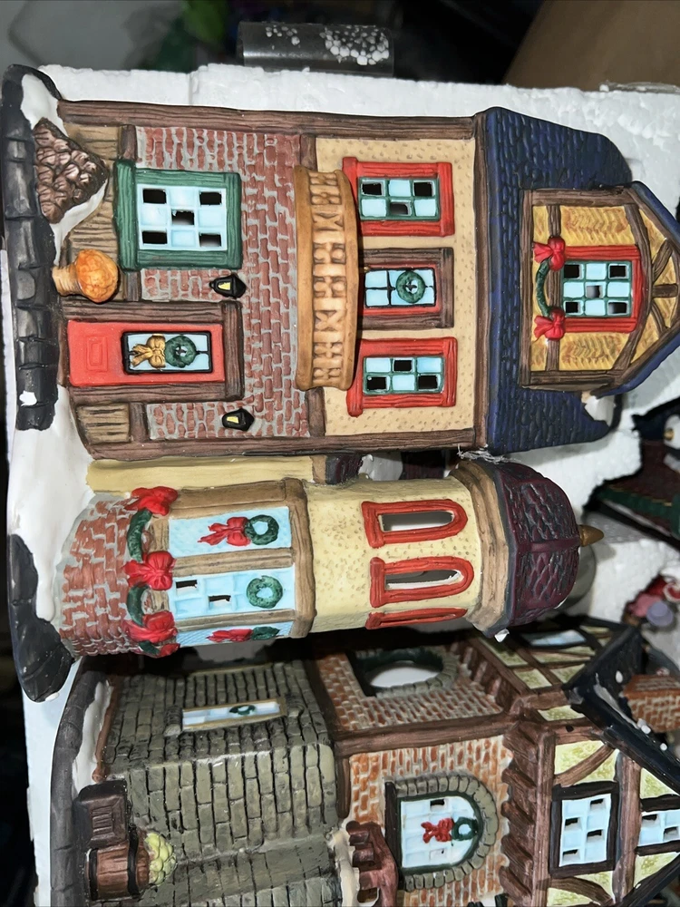 This exquisite 34-piece Victorian Village Set from Grandeur Noel is a must-have for any collector. The set features a variety of buildings and figures, all crafted from high-quality porcelain and painted in vibrant colors. It's perfect for creating a festive Christmas atmosphere in any room, and the set comes complete with a lighted village scene. The set is an original, from the year 2000, and is packaged in a beautiful box for easy storage. It's ideal for adults who appreciate the beauty of Victorian-style Christmas decorations, and would make a great addition to any collection. The set is not handmade, but it's sure to bring joy to anyone who displays it. Missing item #10. Everything else is in the box. Just like new.