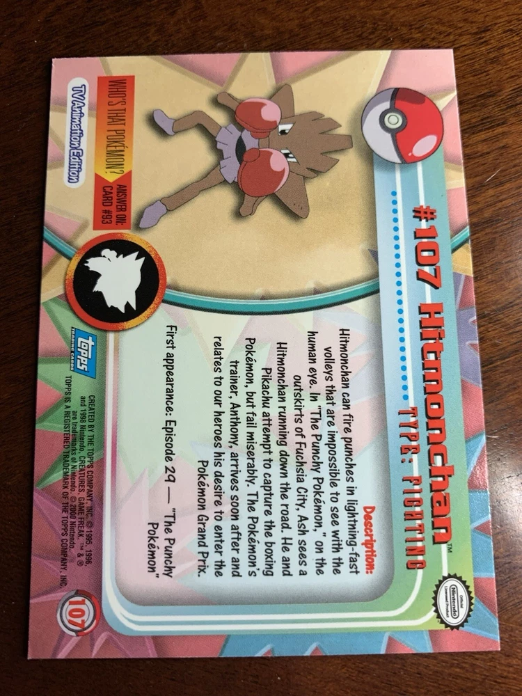 2000 Topps Pokemon TV Animation Series 2 #107 Hitmonchan Up for sale is a 2000 Topps Pokemon TV Series 2 card. Please review pictures as the card pictured is of the actual card that you will receive. The card will be placed in a penny sleeve and shipped in a cardboard box with delivery tracking. I have 100% positive feedback and have been selling items on ebay for many years. Let me know if you have any questions or need additional pictures and I will be happy to provide them. Yes - I do offer combined shipping. Additional shipping cost for each ungraded (raw) card is FREE and for each PSA graded item is only $0.50. Pokémon Official Trading Cards , informally known as Pokémon Trading Cards series 1 , was a set of Pokémon-themed trading cards manufactured by Topps in 1999. There were 90 cards in total: 76 Pokémon cards, 13 character cards, and a checklist card. Each of these 90 cards also had two foil card versions (silver and rainbow) in their main United States distributions. This set contained no bonus "chase cards". In the United States There were four different printings. These cards all had an oval Nintendo seal. The printings are distinguished by a blue, black, green, or red Topps logo, with card texts being updated between the first (blue) and second (black) printings. Due to an error, all foil cards after the first printing were printed with black logos, but can still be distinguished by the differences in their debossings. § 1st printing: blue logo on all cards, foil cards had a smooth texture with no debossings. § 2nd printing: black logo on all cards, Pokémon foil cards were debossed with rays and starbursts, while TV cards had a sandpaper finish. § 3rd printing: green logo on non-foil cards only, Pokémon foil cards were debossed with flames and teardrops, while TV cards had dots and rectangles. § 4th printing: red logo on non-foil cards only, Pokémon foil cards were debossed with Poké Balls and targets, while TV cards had dents. A fifth printing featuring foil cards with a smooth finish but a black logo (features of both the 1st and 2nd printings) was also produced to an uncertain extent. Pokémon Trading Cards series 2 was a set of Pokémon-themed trading cards manufactured by Topps in 2000. There were 72 cards in total: 41 Pokémon cards, 5 "Heroes & Villains" cards, 25 episode cards, and a checklist card. Each of these 72 cards also had two foil card versions (silver and rainbow). In addition, there were 27 bonus "chase cards" not included on the checklist, including 12 die-cut embossed cards, 10 animation stick-on cards, and 5 clear cards. Pokémon Trading Cards series 3 was a set of Pokémon-themed trading cards manufactured by Topps in 2000. There were 72 cards in total: 34 Pokémon cards, 12 "Heroes & Villains" cards, 19 episode cards, 6 puzzle cards, and a checklist card. Each of these 72 cards also had two foil card versions (silver and rainbow). In addition, there were 27 bonus "chase cards" not included on the checklist, including 12 die-cut embossed evolution cards, 10 pop-up cards, and 5 clear cards.