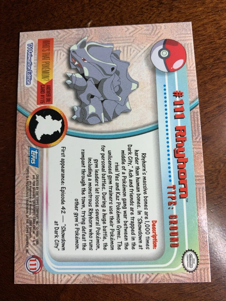 2000 Topps Pokemon TV Animation Series 2 #111 Rhyhorn Up for sale is a 2000 Topps Pokemon TV Series 2 card. Please review pictures as the card pictured is of the actual card that you will receive. The card will be placed in a PSA protective sleeve and shipped in a cardboard box with delivery tracking. I have 100% positive feedback and have been selling items on ebay for many years. Let me know if you have any questions or need additional pictures and I will be happy to provide them. Yes - I do offer combined shipping. Additional shipping cost for each ungraded (raw) card is FREE and for each PSA graded item is only $0.50. Pokémon Official Trading Cards , informally known as Pokémon Trading Cards series 1 , was a set of Pokémon-themed trading cards manufactured by Topps in 1999. There were 90 cards in total: 76 Pokémon cards, 13 character cards, and a checklist card. Each of these 90 cards also had two foil card versions (silver and rainbow) in their main United States distributions. This set contained no bonus "chase cards". In the United States There were four different printings. These cards all had an oval Nintendo seal. The printings are distinguished by a blue, black, green, or red Topps logo, with card texts being updated between the first (blue) and second (black) printings. Due to an error, all foil cards after the first printing were printed with black logos, but can still be distinguished by the differences in their debossings. § 1st printing: blue logo on all cards, foil cards had a smooth texture with no debossings. § 2nd printing: black logo on all cards, Pokémon foil cards were debossed with rays and starbursts, while TV cards had a sandpaper finish. § 3rd printing: green logo on non-foil cards only, Pokémon foil cards were debossed with flames and teardrops, while TV cards had dots and rectangles. § 4th printing: red logo on non-foil cards only, Pokémon foil cards were debossed with Poké Balls and targets, while TV cards had dents. A fifth printing featuring foil cards with a smooth finish but a black logo (features of both the 1st and 2nd printings) was also produced to an uncertain extent. Pokémon Trading Cards series 2 was a set of Pokémon-themed trading cards manufactured by Topps in 2000. There were 72 cards in total: 41 Pokémon cards, 5 "Heroes & Villains" cards, 25 episode cards, and a checklist card. Each of these 72 cards also had two foil card versions (silver and rainbow). In addition, there were 27 bonus "chase cards" not included on the checklist, including 12 die-cut embossed cards, 10 animation stick-on cards, and 5 clear cards. Pokémon Trading Cards series 3 was a set of Pokémon-themed trading cards manufactured by Topps in 2000. There were 72 cards in total: 34 Pokémon cards, 12 "Heroes & Villains" cards, 19 episode cards, 6 puzzle cards, and a checklist card. Each of these 72 cards also had two foil card versions (silver and rainbow). In addition, there were 27 bonus "chase cards" not included on the checklist, including 12 die-cut embossed evolution cards, 10 pop-up cards, and 5 clear cards.