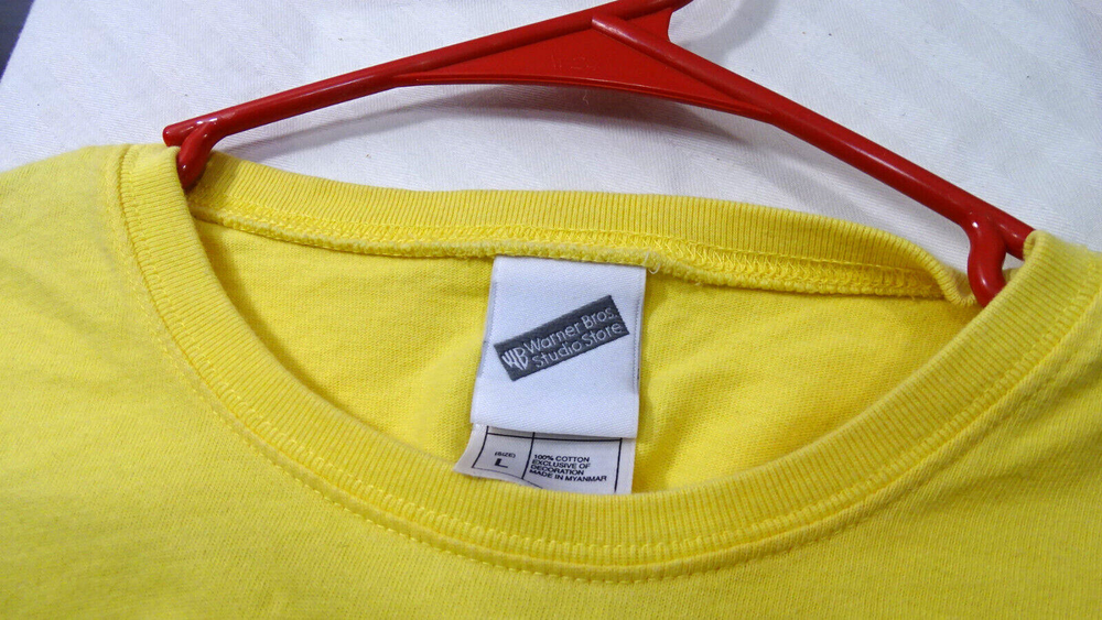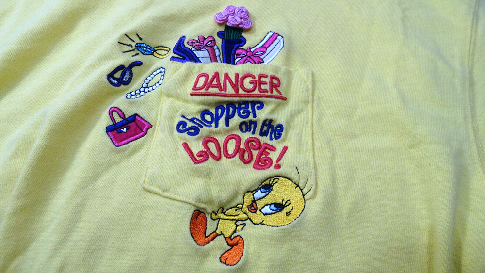 size large pocket t shirt made in 2000-warner bros store -danger Shopper on the loose -jewelry-sunglesses-purses-shoes-flowers Tweety bird is shopping embroidered for a 3-D look-Tweety Bird yellow chest 44" length 27"