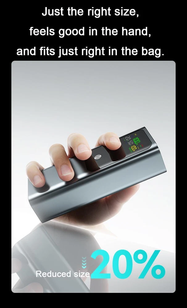 Ranwomen Powerbank 20000mAh 100W PD3.1 2PCS Battery Portable Bidirectional Fast Charging For Laptop Tablet Phone Apple Samsung Color:Gray,Blue Fast charging protocol:PD QC FCP SCP AFC UFCS and other Battery capacity:20000mAh(21700 specification lithium battery*4) The power level of the power bank is closely related to the temperature, the cable used, and the device being charged. Maximum output power:100W(PD3.1) Supported devices: mainstream laptops (USB-C charging), smartphones, tablets, mainstream electronic devices Screen material:LED Size:153*55*34mm Output: Type-C1: 5V/3A 9V.3A 15V/3A 20V/3A Type-C2: 5V/3A 9V/3A 15V/3A 20V/5A USB port: 5V/3A 9V12A 12V/1.5A 10V/2.25A Input: Type C1/2: 5V/3A 9V/3A 15V/3A 20V/3A Weight: 421 grams/ (power bank only) Highlight: *100W Total output,equipped with Dual USB-C and one USD-A port,quickly charge a laptop at 100W for maximun effciency *Smart LED display,track power levels and charging status at a glance. *Lightweight body, easy to carry. Package Include 1*20000mAh Powerbank 1*Fast charging cable 1*Manual 100w PD 3.1 Super fast charging LED display, intelligent temperature control 100W Bidirectional charging, fast charging 100W PD3.1 Fast charging,Intelligent power adjustment, suitable for most devices 20,000 mAh large battery with high battery density to ensure continuous output 421(laboratory data, not representative of final weight), small and lightweight, easy to carry LED screen intelligent display, charging data is clear at a glance Product specific data