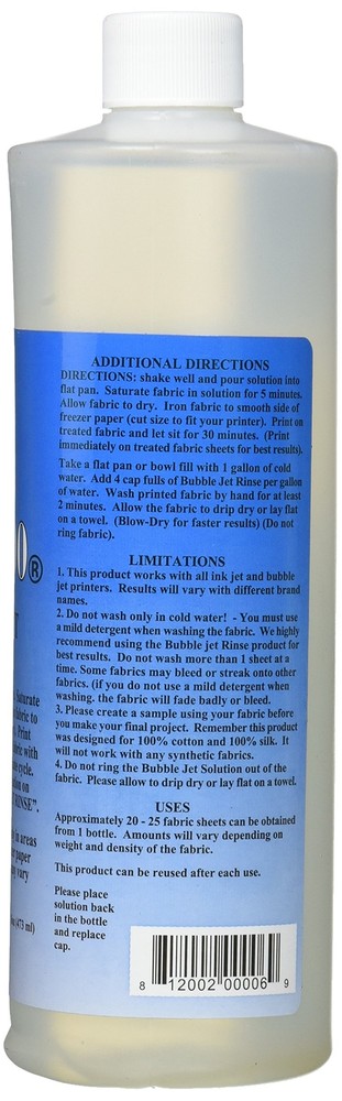 Imagine creating and printing your own fabric, from the comfort of your own home, using your ink jet printer! Use with 100% cotton or silk. Results may vary with different printers and inks. Set 2000 16oz- Excellent for printing fabric for quilting square. Set 2000 16 oz Imagine creating and printing your own fabric, from the comfort of your own home, using your ink jet printer Use with 100% cotton or silk Country of Origin : United States