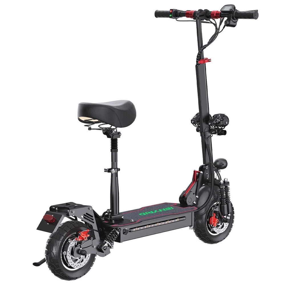 2000W Adults Electric Scooters Dual Motors Drive 48V Commute Off Road E-Scooter 2023 Upgraded iENYRID Electric Scooter ES10 Foldable Electric Scooter comes with a 960Wh (48V 20Ah) battery assisting 25-38 miles cruising range. ES10 becomes an excellent choice for high-quality and comfortable riding. It is suitable for commuting to work, shopping in supermarkets, mountain cross-country and traveling. Powerful Motor & Long Lasting Battery ES10 electric scooters f With powerful Dual 1000W Motors, detailed parts, detachable seat and foldable design,, brings faster acceleration and climbing ability to this electric scooter, which can reach 35 mph max and max 30°climbing angle. Comfortable Commuting IENYRID ES10 adult off road electric scooter comes with upgraded 10-inch off-road tires and front and rear dual suspension to ensure max comfort even on bumpy roads. Also, the aviation-grade aluminum frame is stronger and lighter, which makes the scooter much more elegant to look at and handle as well. And it has a max load of 280 lbs. Foldable Electric Scooter Easy to fold and carry, carry it on public transportation or store it in your car to get to wherever you want. Dynamic, Easy storage in car trunks and other compact spaces, occupying little space and suitable for travel and transportation commute. IPX5 Super Waterproof & LED Intelligent Lighting System The waterproof frame and deck are tightly sealed against water, accredited with an IPX5 ingress protection rating painting. The head of the e scooter is equipped with three LED lights with different functions to ensure safe and worry-free riding at night. Specification: Type: Electric Scooter for Adults Model: IE - ES10 Motor: 2000W Battery specification: 48V 20AH Charger specification: Input AC100-240V, output 54.6V 2A Max aviation plug Controller specification: DC48V/36A Charging time: 4-8 hours Drive mode: front and rear wheel dual drive Max Speed: 31MPH Max Range: 38 Miles Max Load: 280 lbs Maximum climbing ability: ≤ 30 ° Tires: 10 in off-road pneumatic tires Frame Material: aluminum alloy Braking method (front/rear): mechanical braking Front shock absorber: Yes Rear shock absorber: Yes Front headlights: integrated with horn Tail lights: Yes Edge light: Yes Brake lights: Yes Net Weight: 66 lb Front and rear tire pressure: 50 ± 10psi Product Size (L x H x W): 47.24 x 49.6 x 23.62 in (unfolded), 45.67 x 20 x 23.62 inch (folded) Package Contents: 1 x Charger 1 x User Manual 1 x Electric scooter Warning: It is illegal to ride electric scooters on public roads (except under very specific circumstances), pavements or cycle paths. They are intended only for use on private land with the owner’s permission
