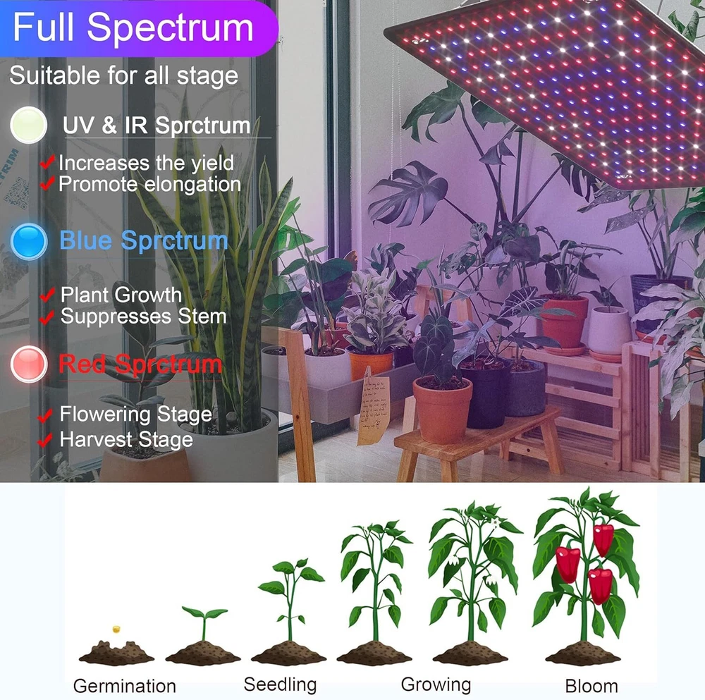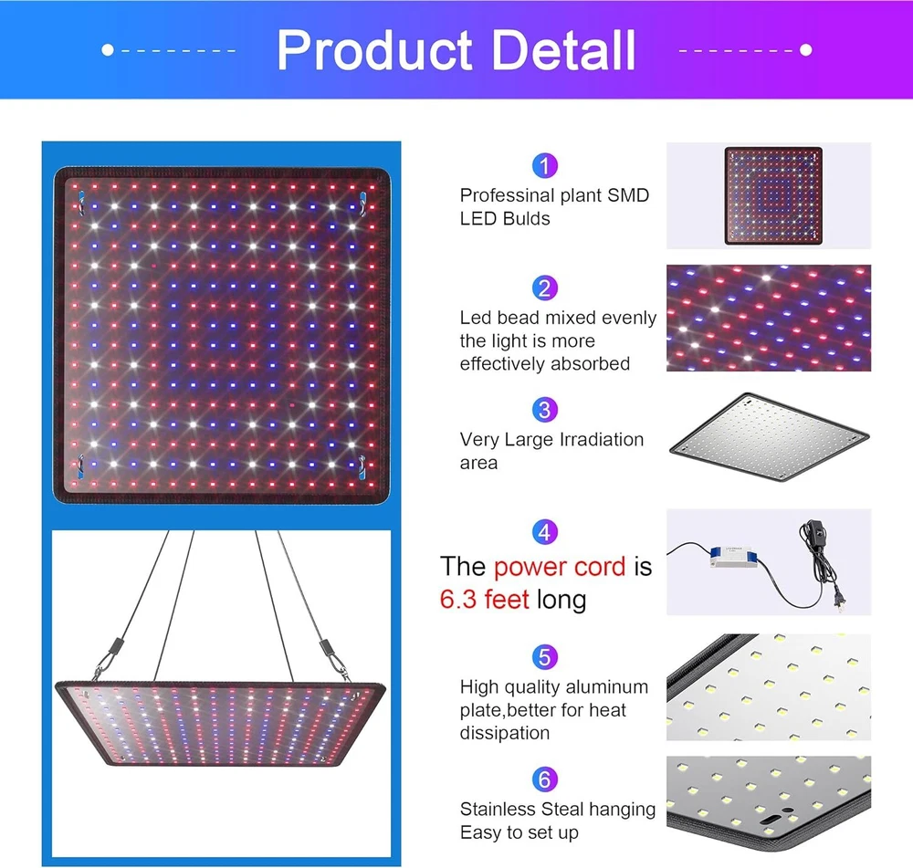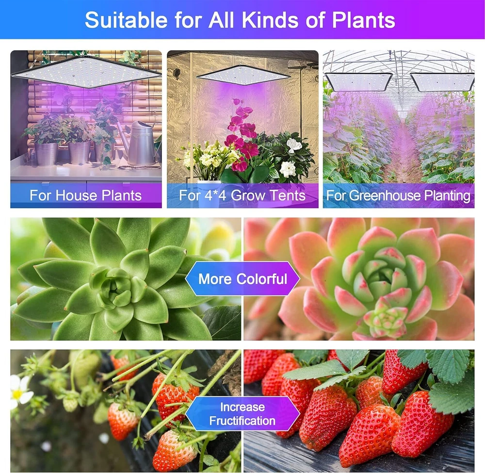 Type: LED Light Panel Suitable For: Flowering, Maintaining Mother Plants, Rooting Cuttings & Seedlings, Vegetative Growth Lifespan: 5000 Hours Number of Items in Set: 1 Number of LEDs: 225 Material: Aluminum, Metal, Plastic Brand: Unbranded UPC: Does not apply Installation Area: Indoor Dimming Settings: 100% gtin13: Does not apply Lighting Technology: LED