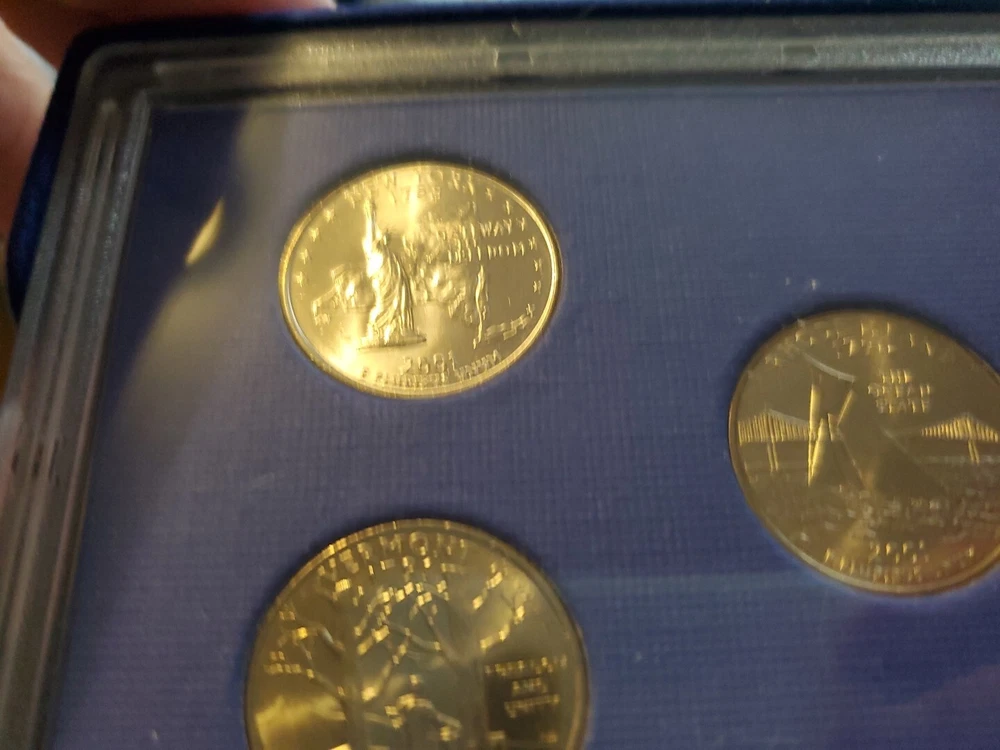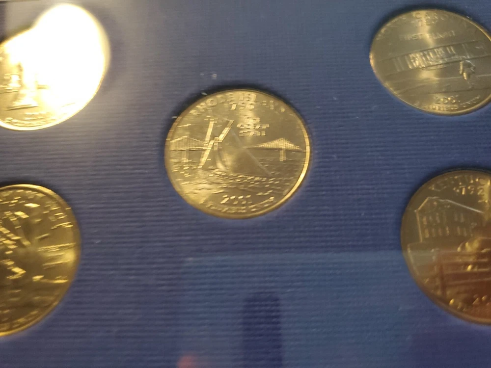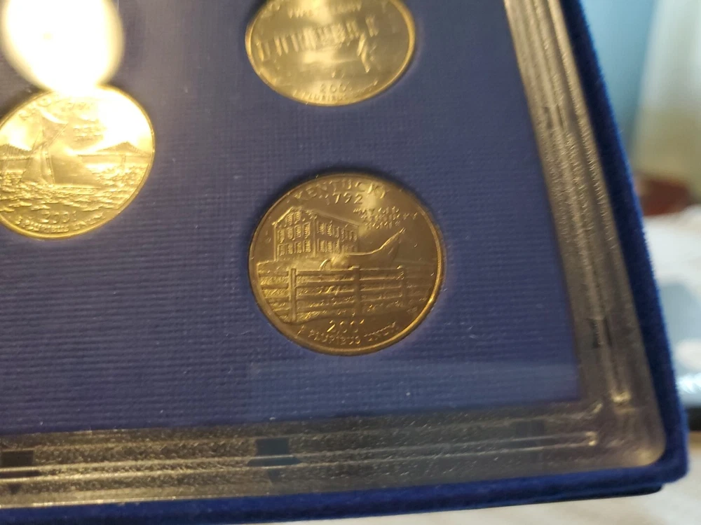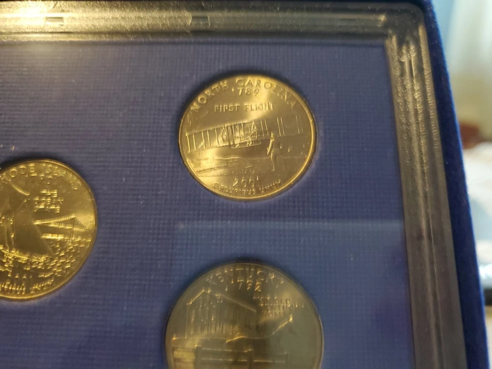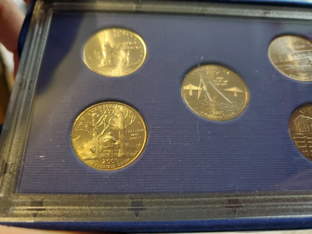 This 2001 P clad quarter proof set includes 5 coins featuring the states of New York, Vermont, Kentucky, Rhode Island, and North Carolina. Each coin is in uncirculated condition and has been certified by the U.S. Mint. The coins are composed of clad and have a denomination of 25 cents. This set also includes a variety of the Kentucky state quarter. The coins were struck in proof type at the San Francisco mint in 2001. This set is a great addition to any coin collection.