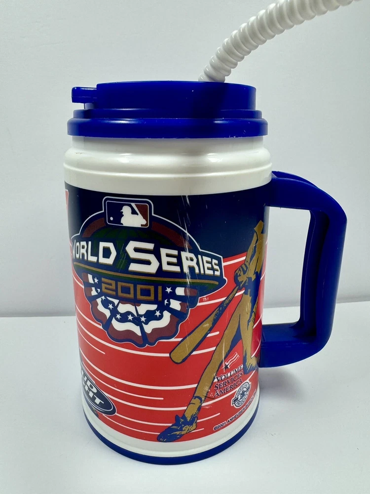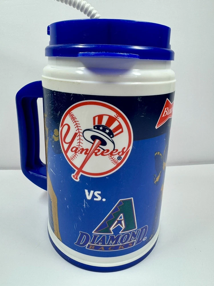 This vintage souvenir mug is a must-have for any baseball fan. Featuring the iconic team logos of the New York Yankees and the Arizona Diamondbacks, this mug is a perfect reminder of the exciting 2001 World Series. The mug also comes with a handle and is insulated, making it a great choice for your morning coffee or tea. Don't miss out on this unique piece of sports memorabilia!